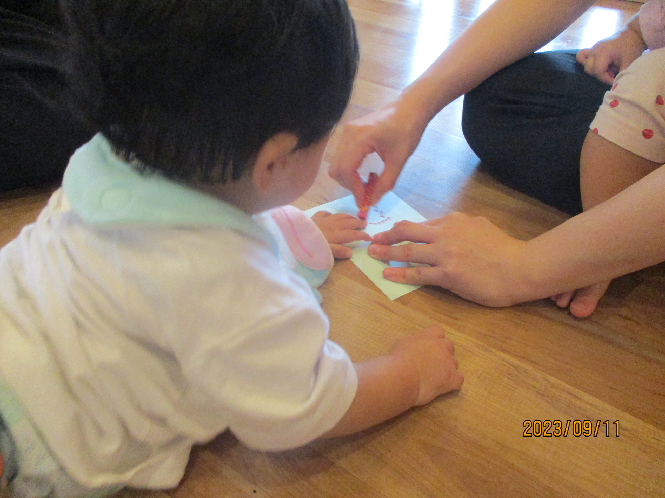職員がマーブル色のクレヨンを出すと、子どもたちは興味津々でやってきました。