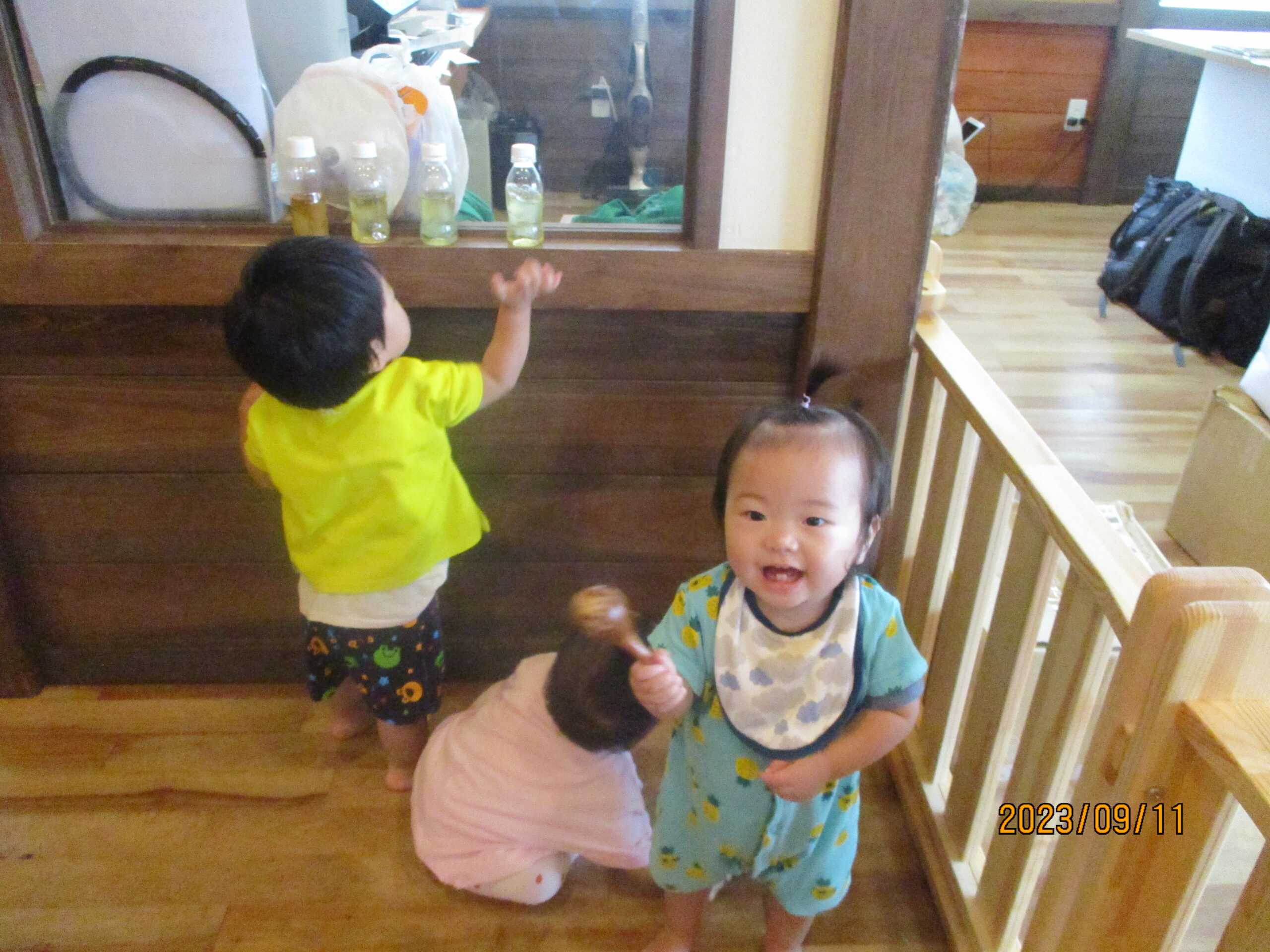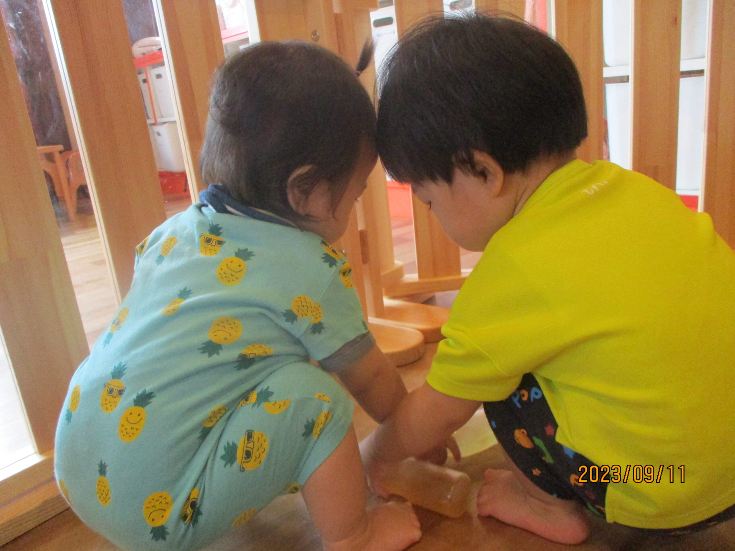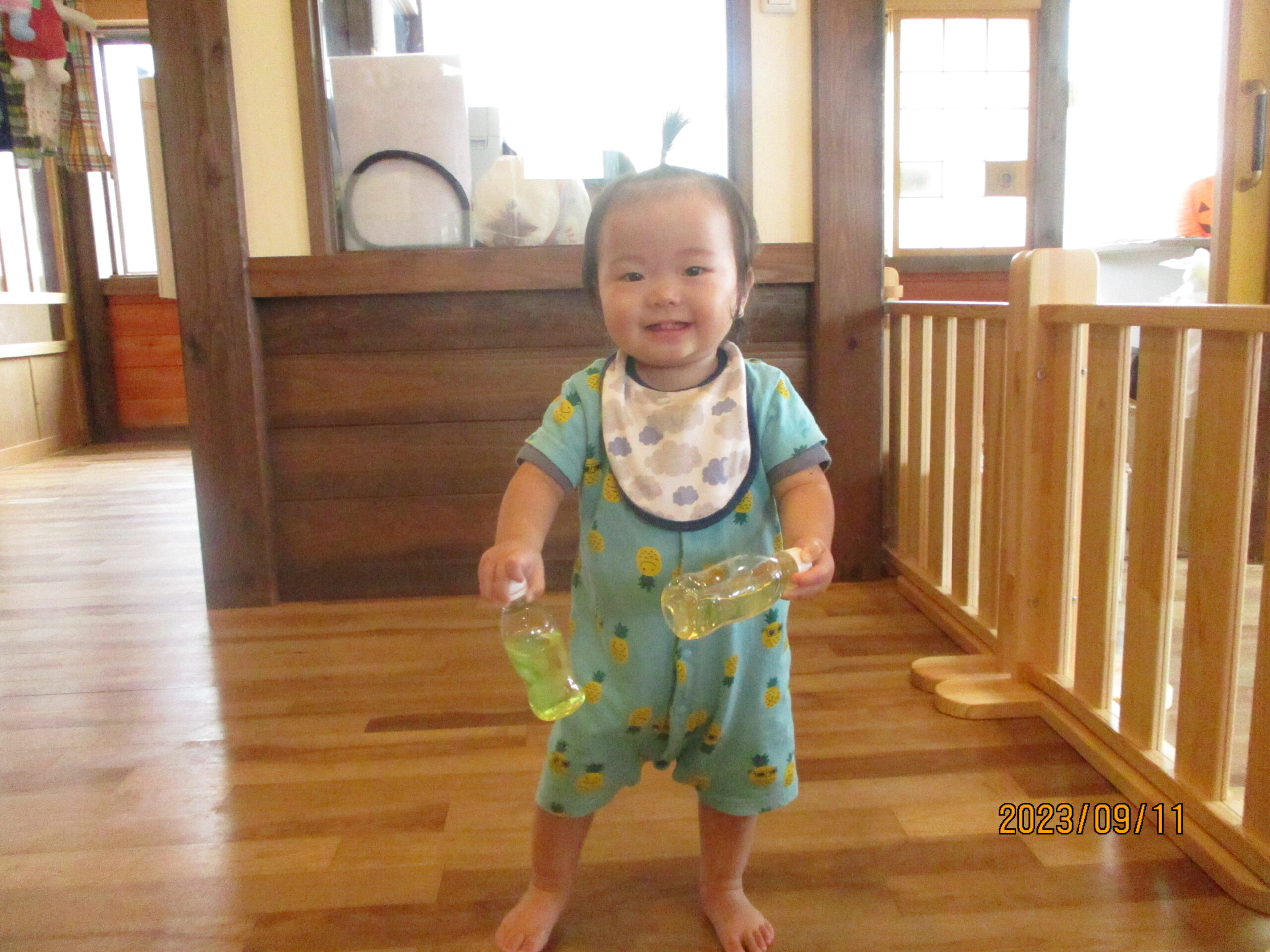 そのあとは、先週遊んだ寒天を冷やしてペットボトルに入れて遊びました。同じ黄色でも色味の強さが変わり、並べると違いがよくわかります。