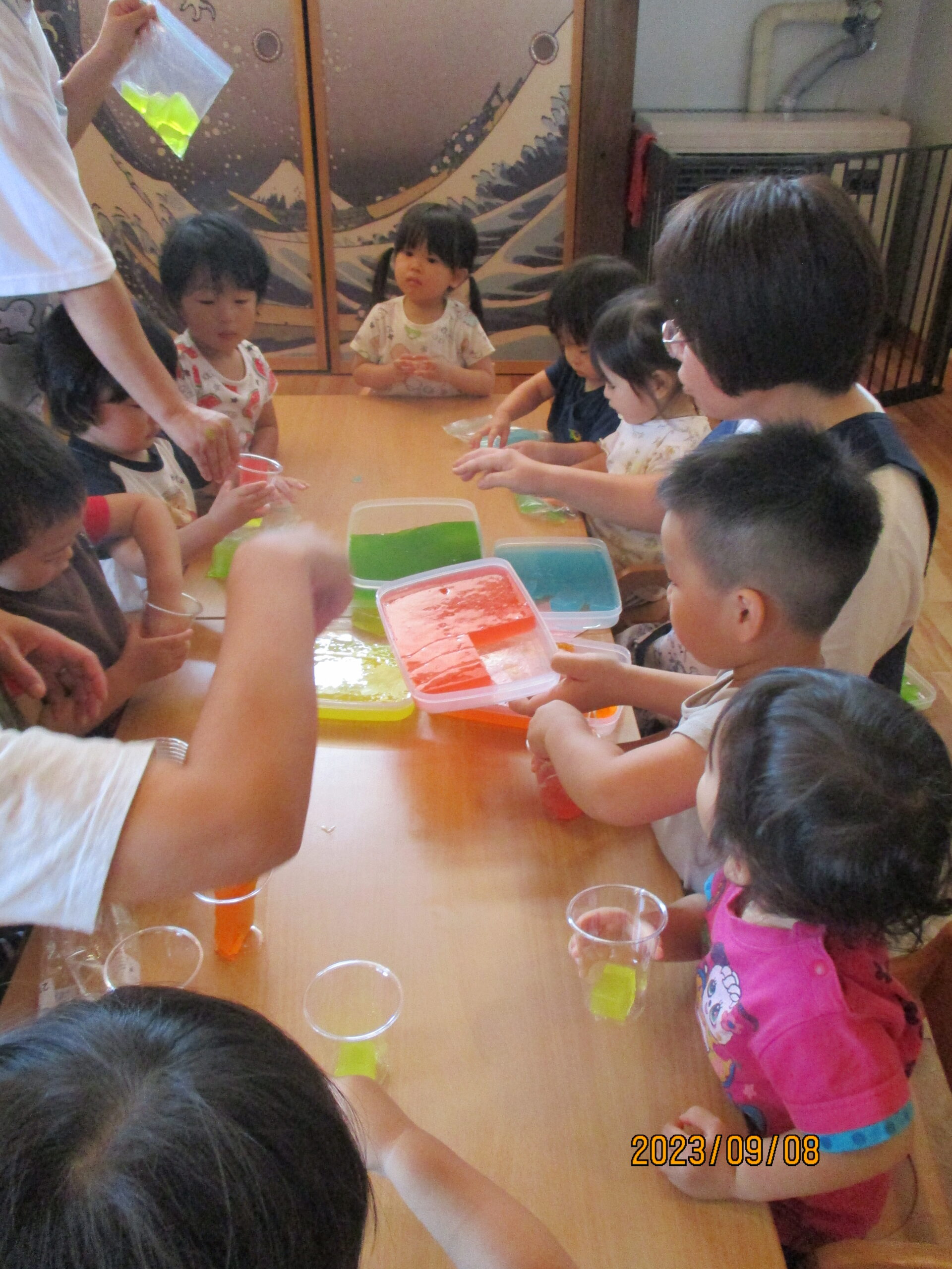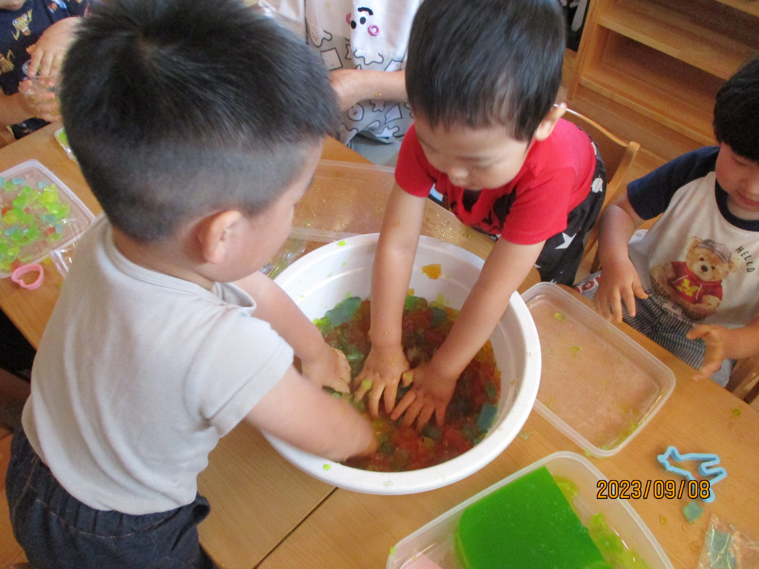最後は全部の色の寒天を合わせてまぜまぜ。とっても楽しそうでした。寒天あそびは冷たくてとても感触が気持ちいいです。まだやりたいとなかなかやめられない子もいましたよ。