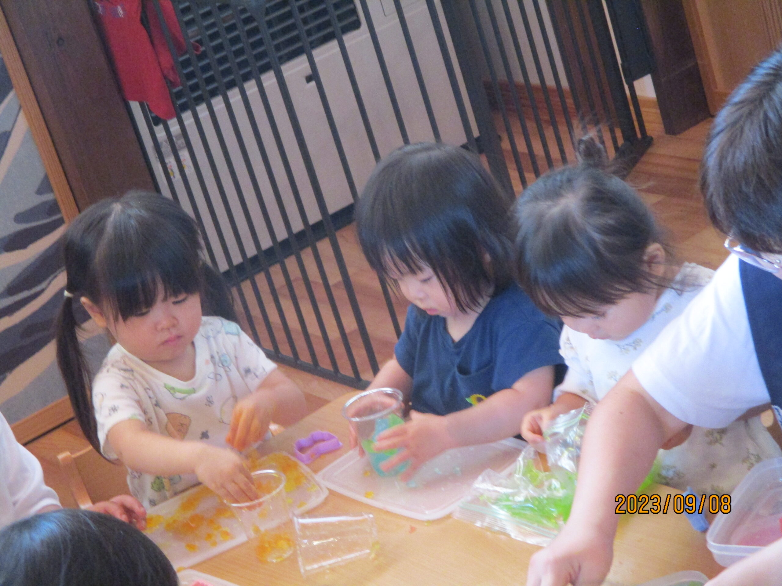 そして、手で握り細かくした感触を楽しんでいました。色々な色の寒天をコップに入れて色を混ぜたり綺麗でした。