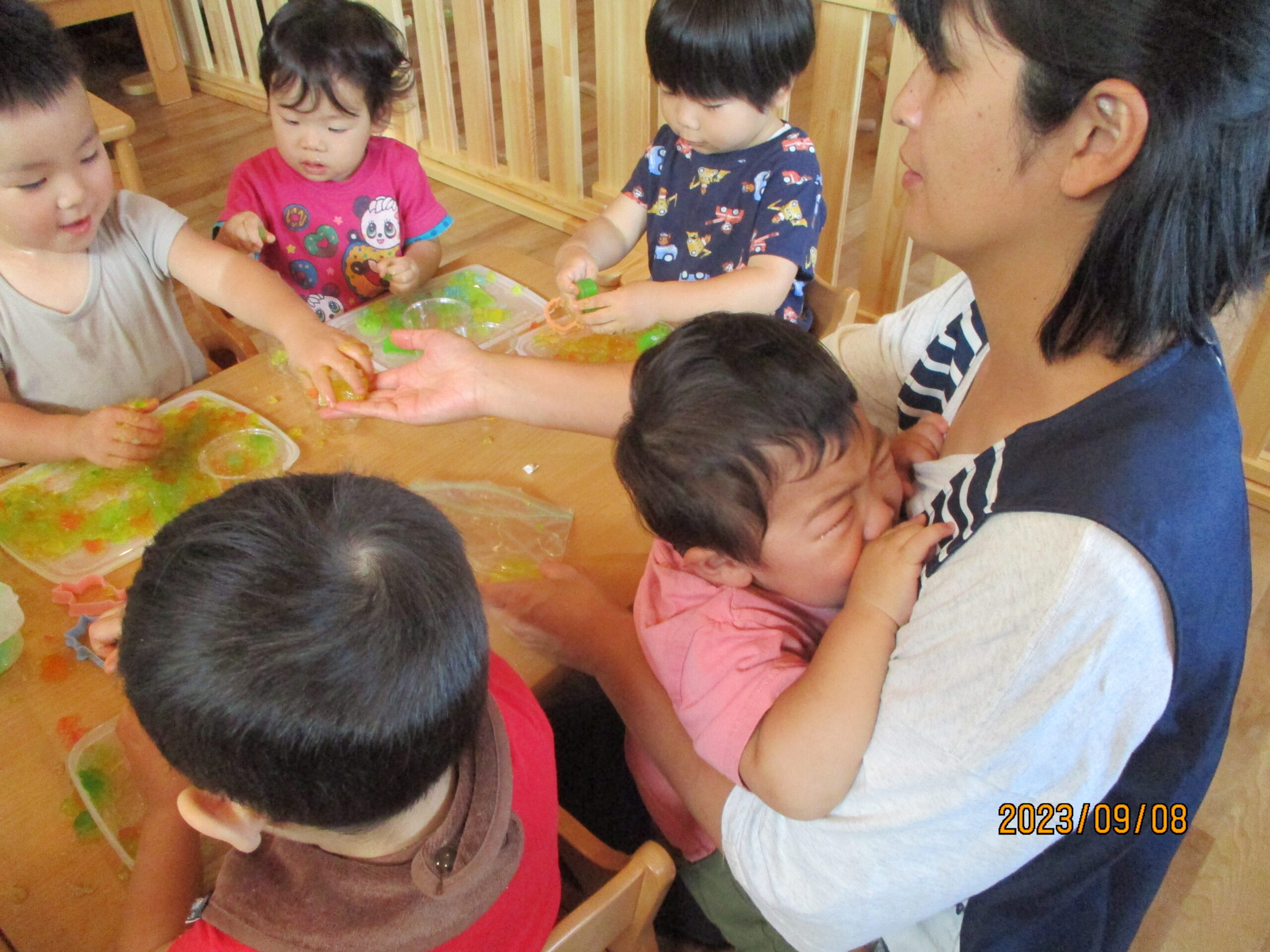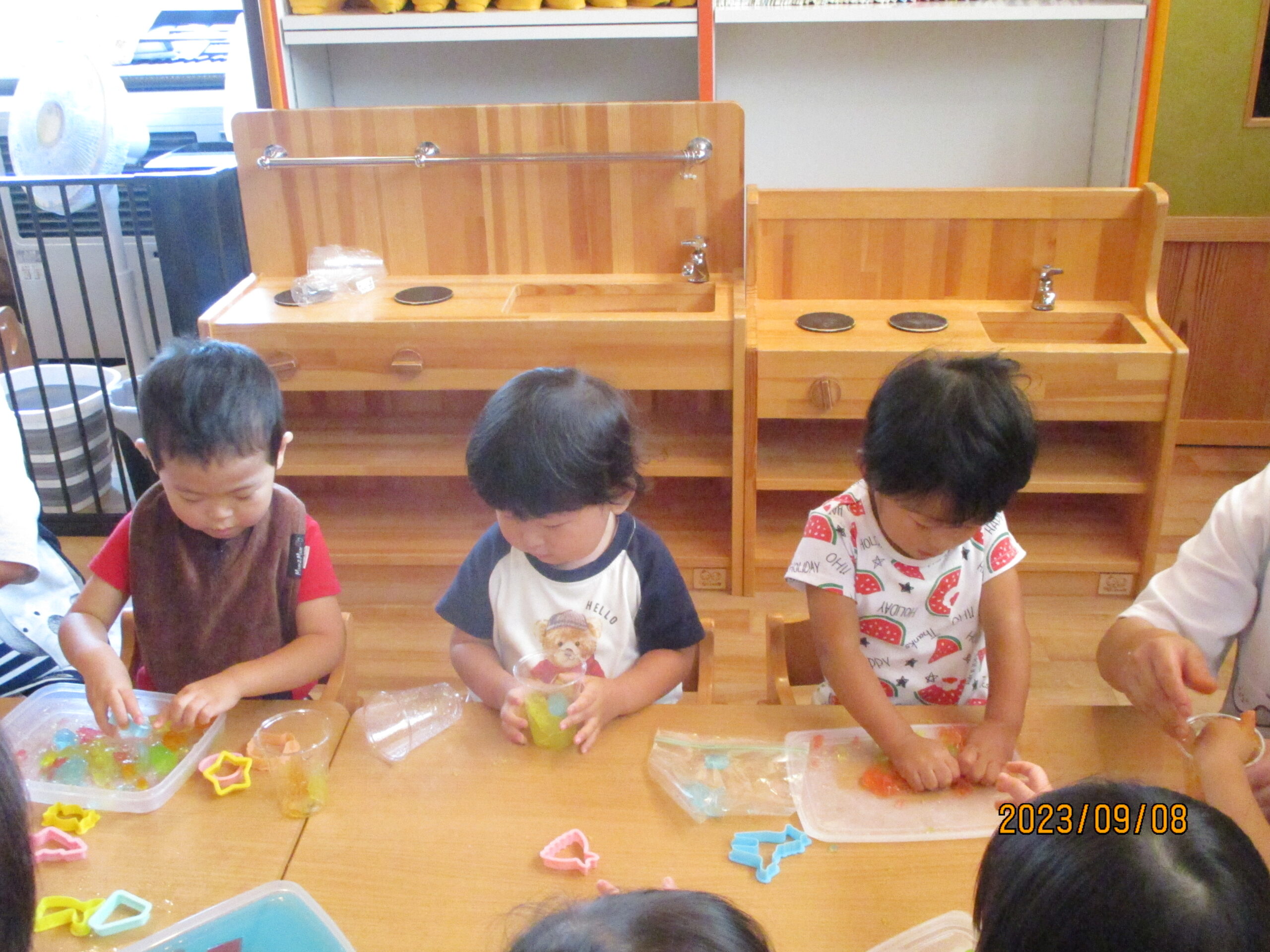 9月8日寒天遊びをしました。秋に入りましたが、まだまだ暑い日もあり、少しでも涼しさを味わえたらと思いやってみました。寒天の固まりを見せるとさっそく触ってみてました。