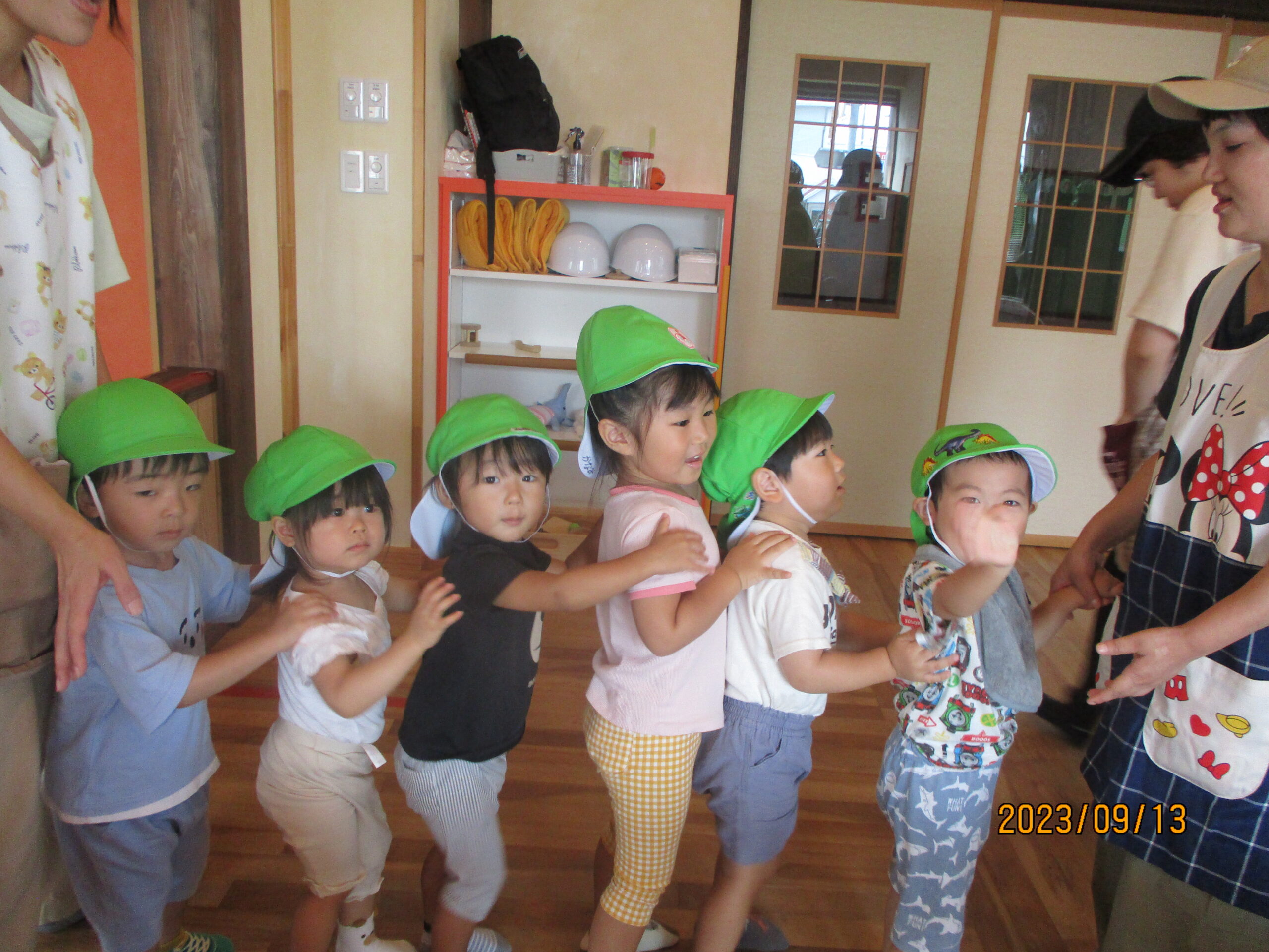 今日は久しぶりに、はなぞの公園に行ってきましたよ♪保育園を出る前に、みんなで電車になって玄関に行きました。上手にお友達の肩に手を乗せて歩く子ども達です。