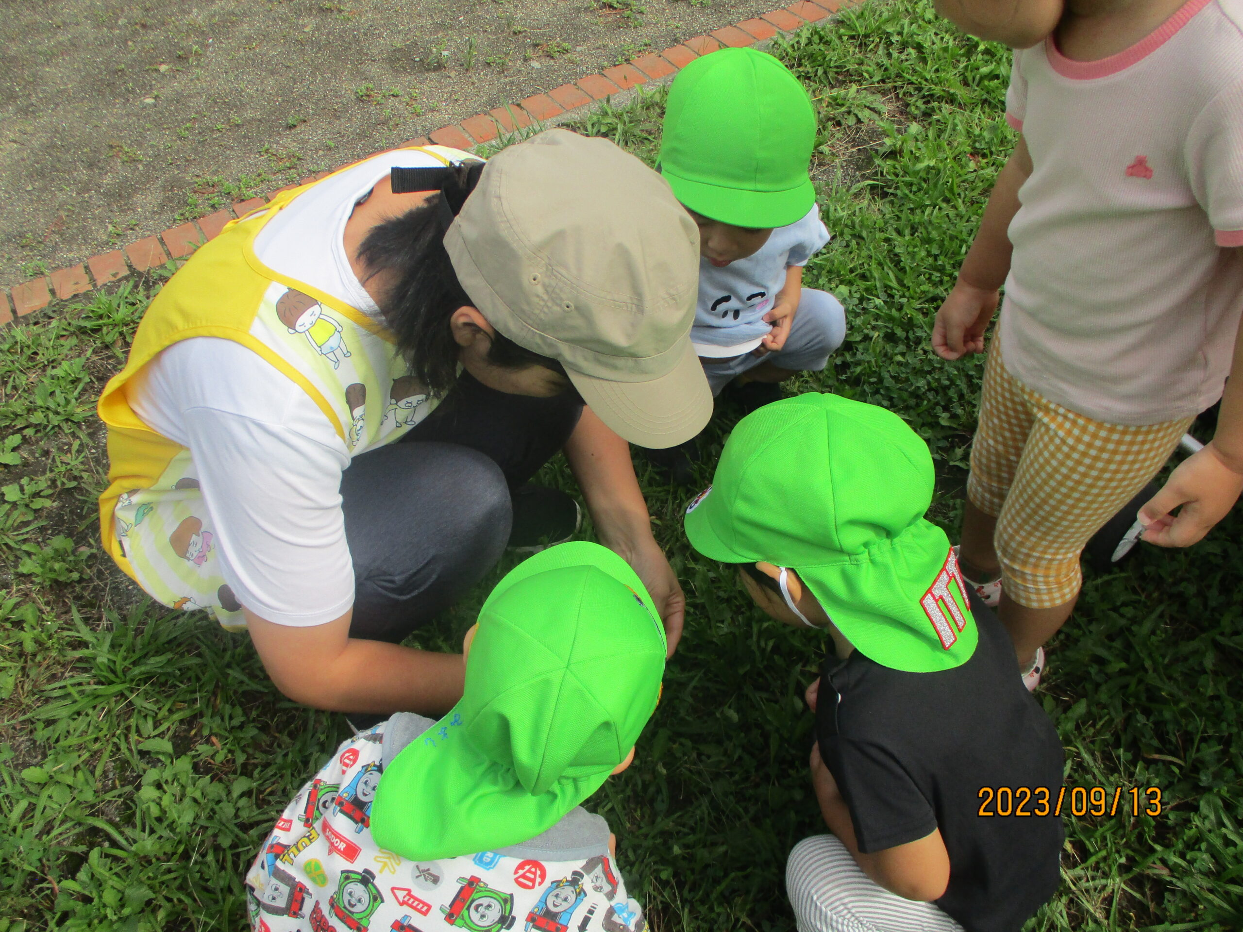 保育士が虫さんを探していると近くに行き、「いた!」「見つけたよ」と保育士に教えてくれましたよ。