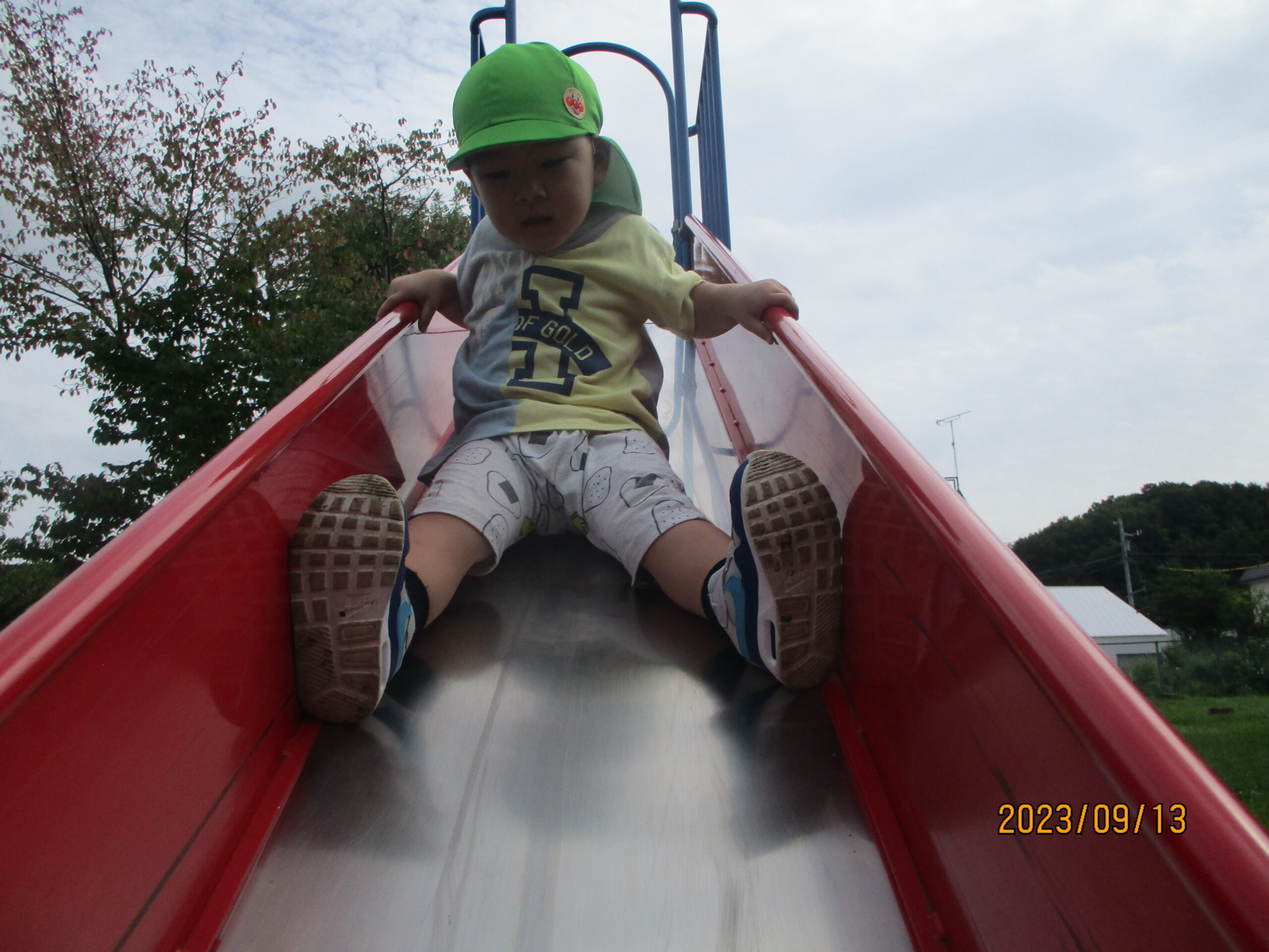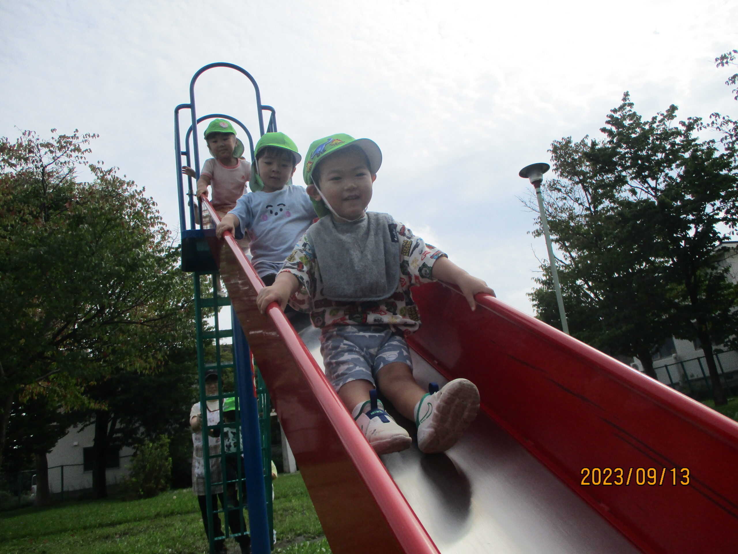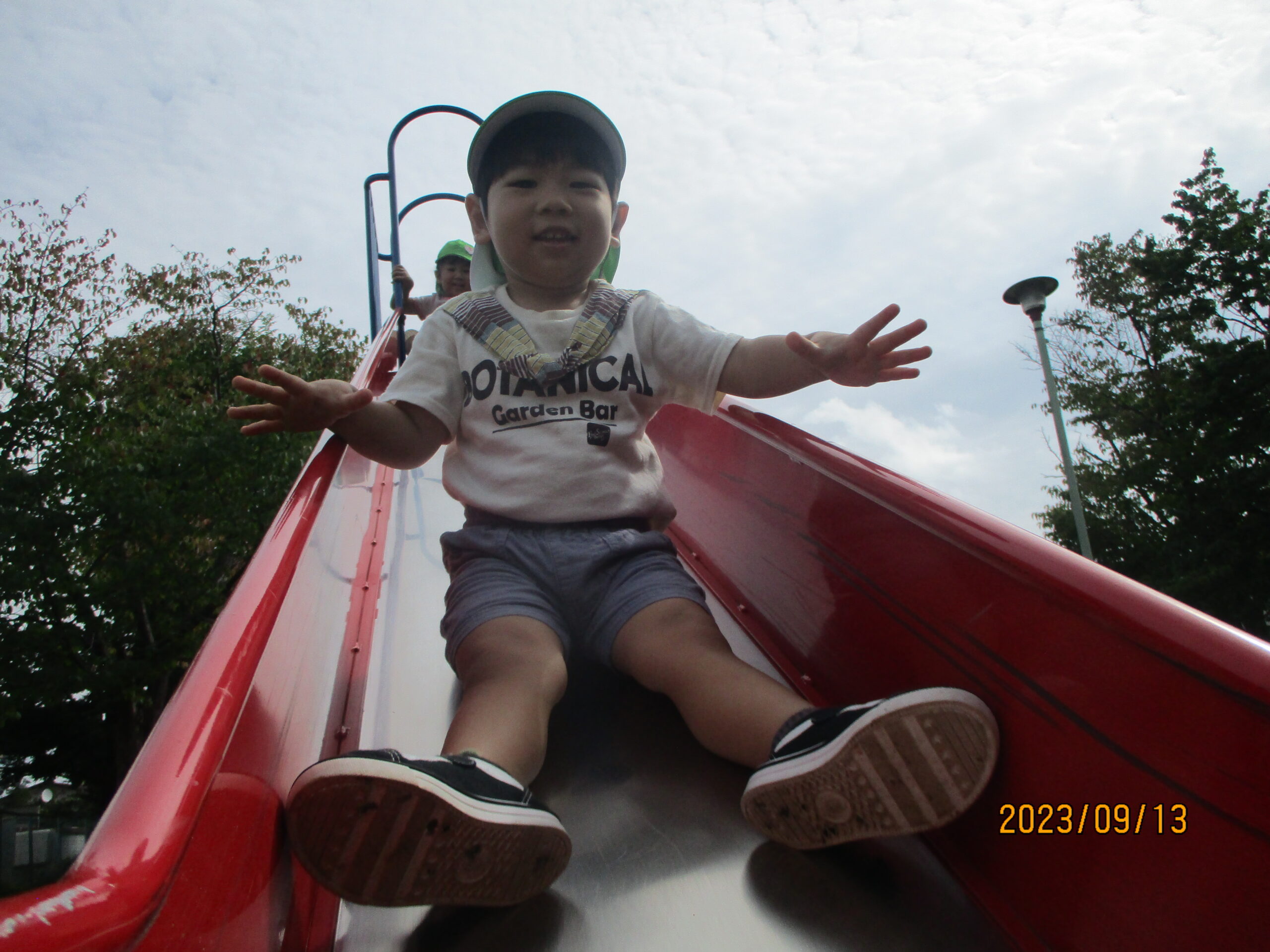 公園に着くとみんな大好き滑り台に乗って、ニコニコ笑顔で滑っていましたよ♪