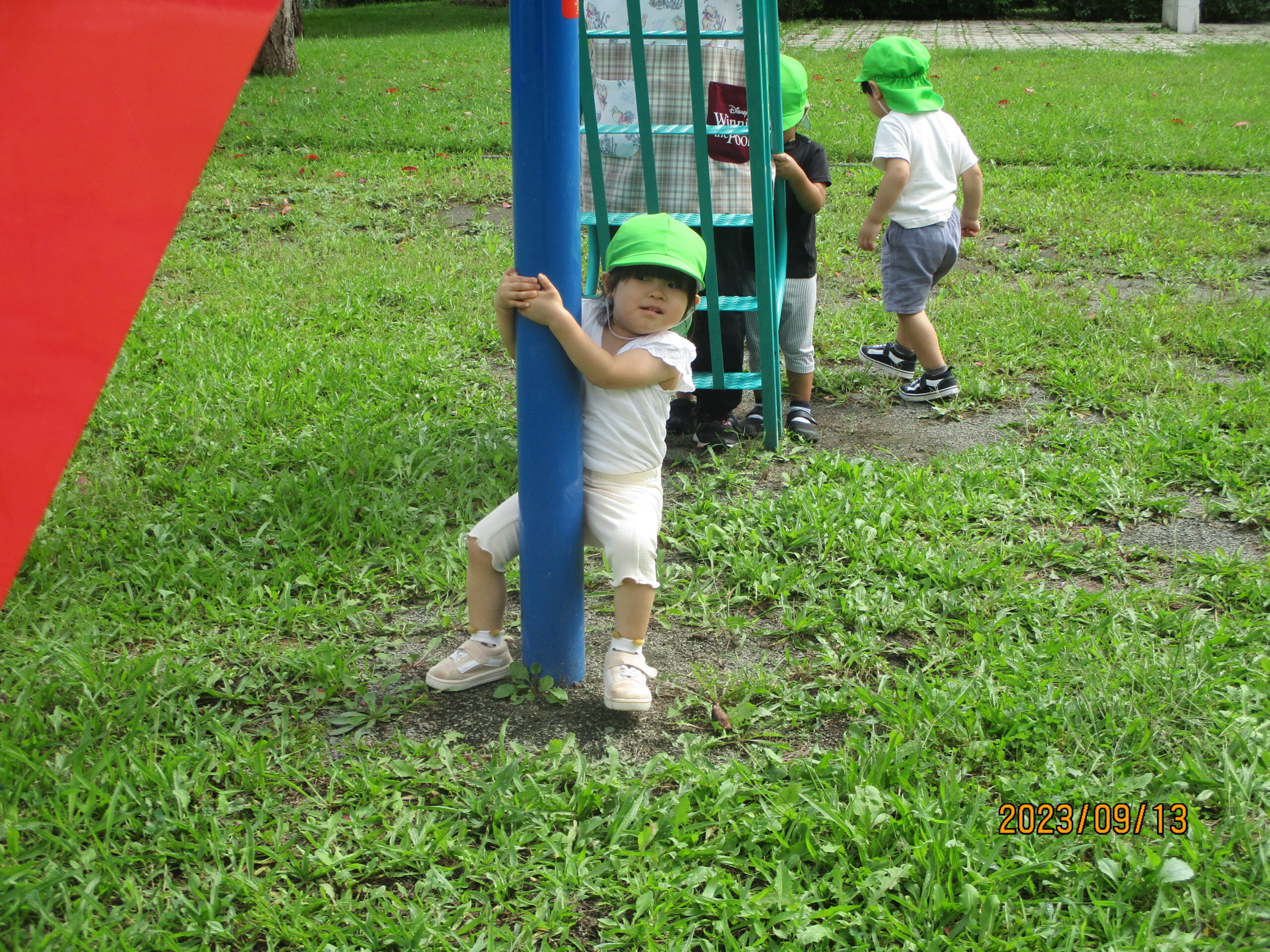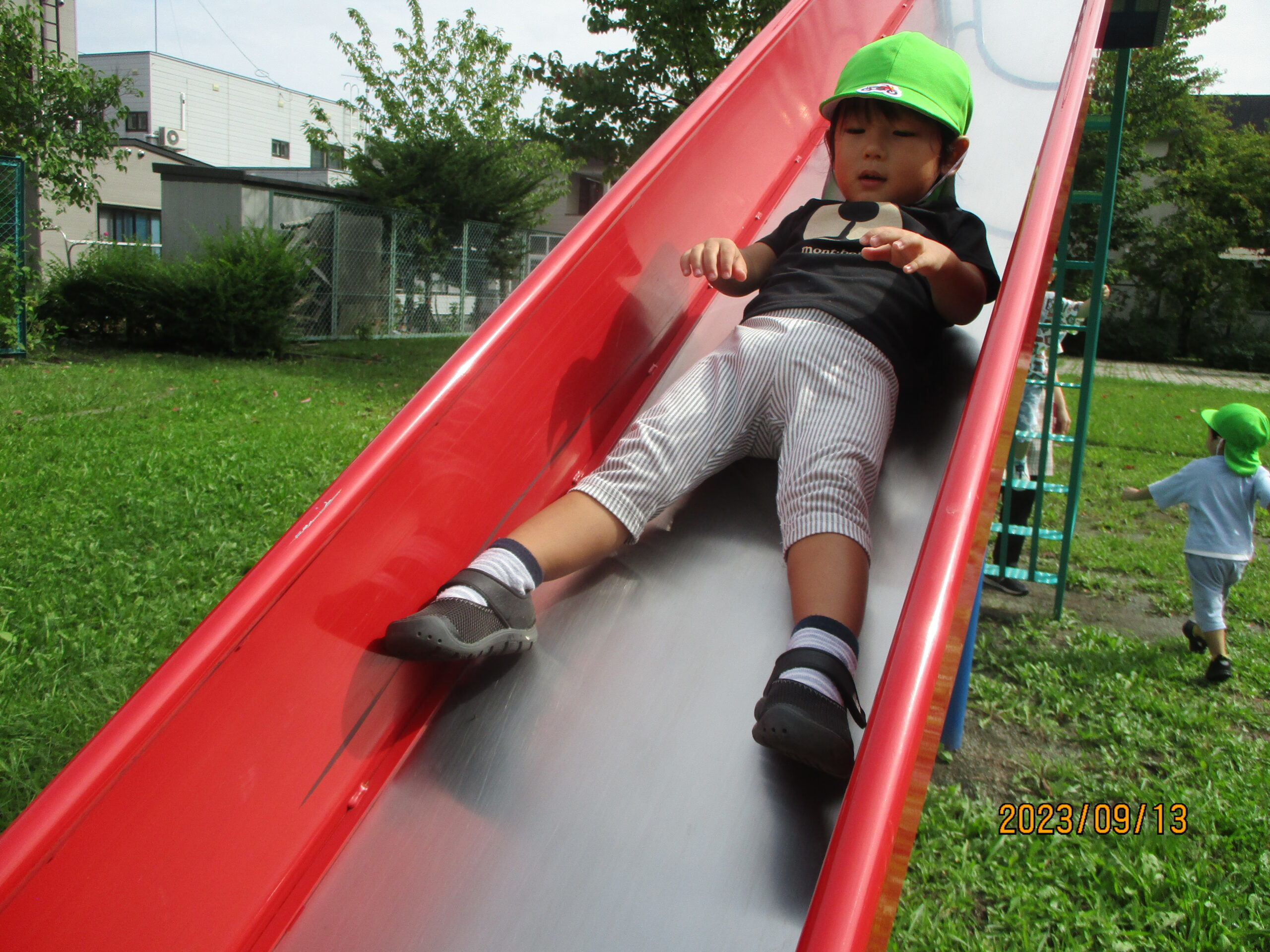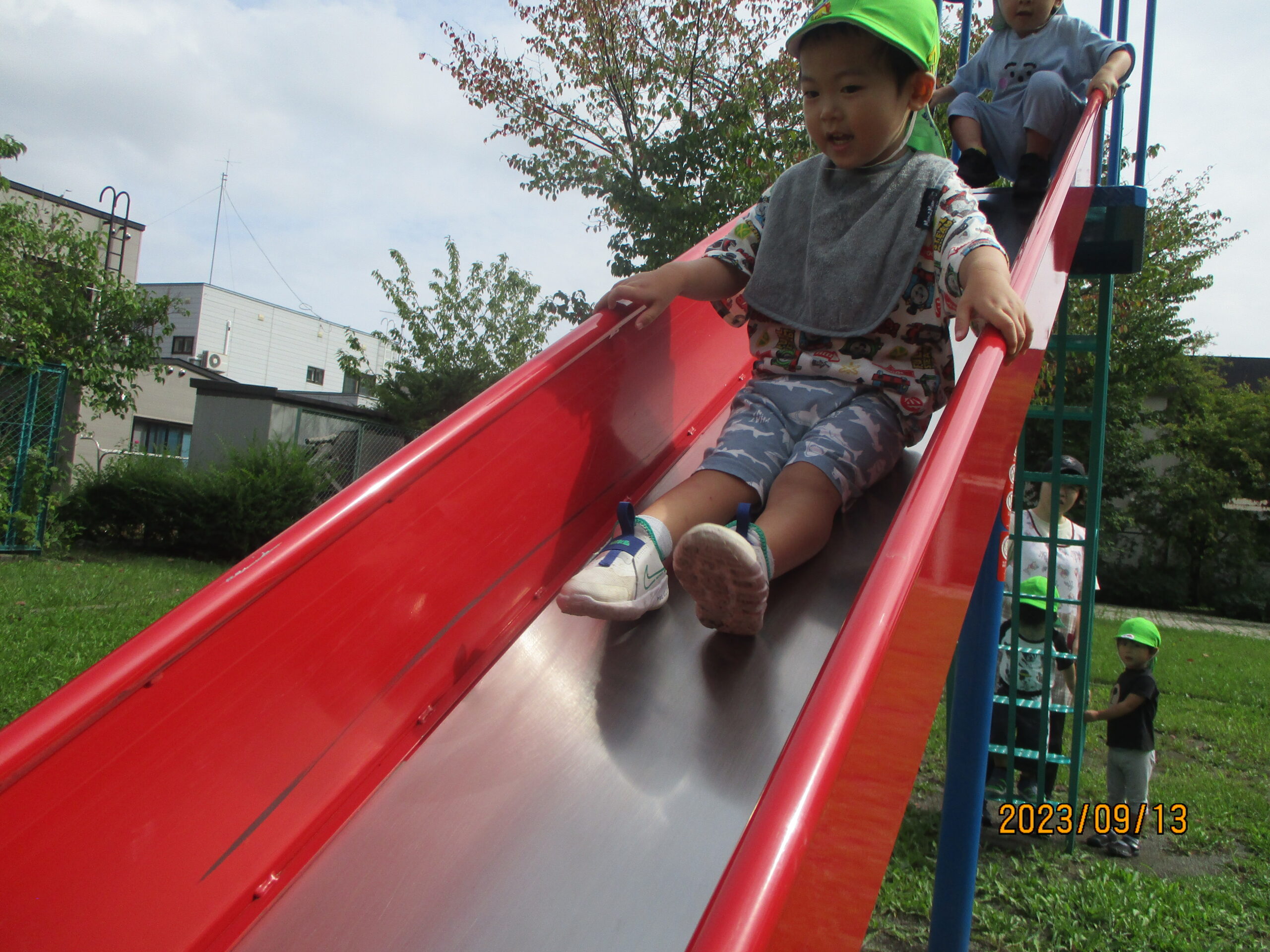 公園に着くとみんな大好き滑り台に乗って、ニコニコ笑顔で滑っていましたよ♪