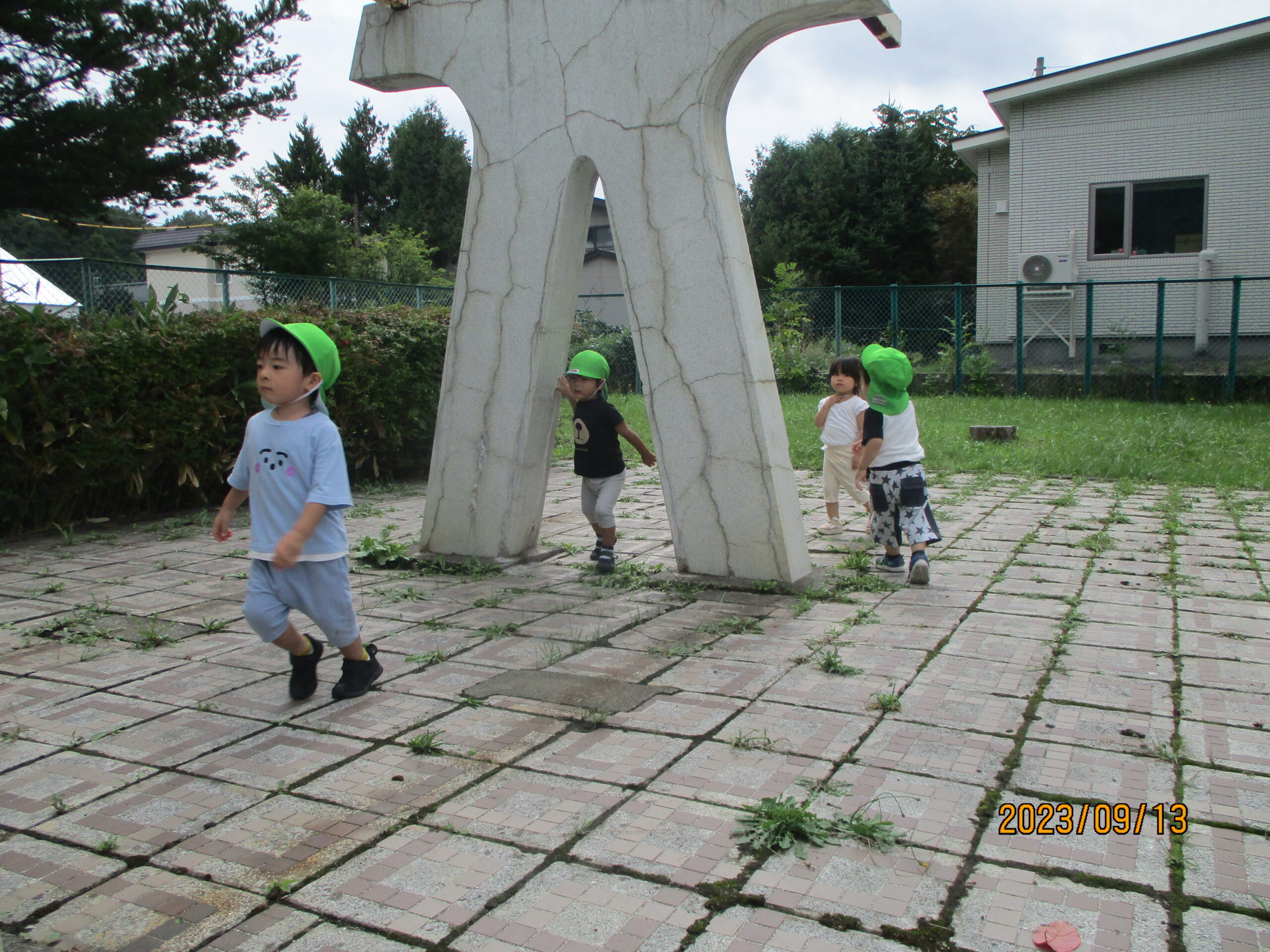 滑り台で遊んだ後は、お友達と思い切り走って遊んでいました。