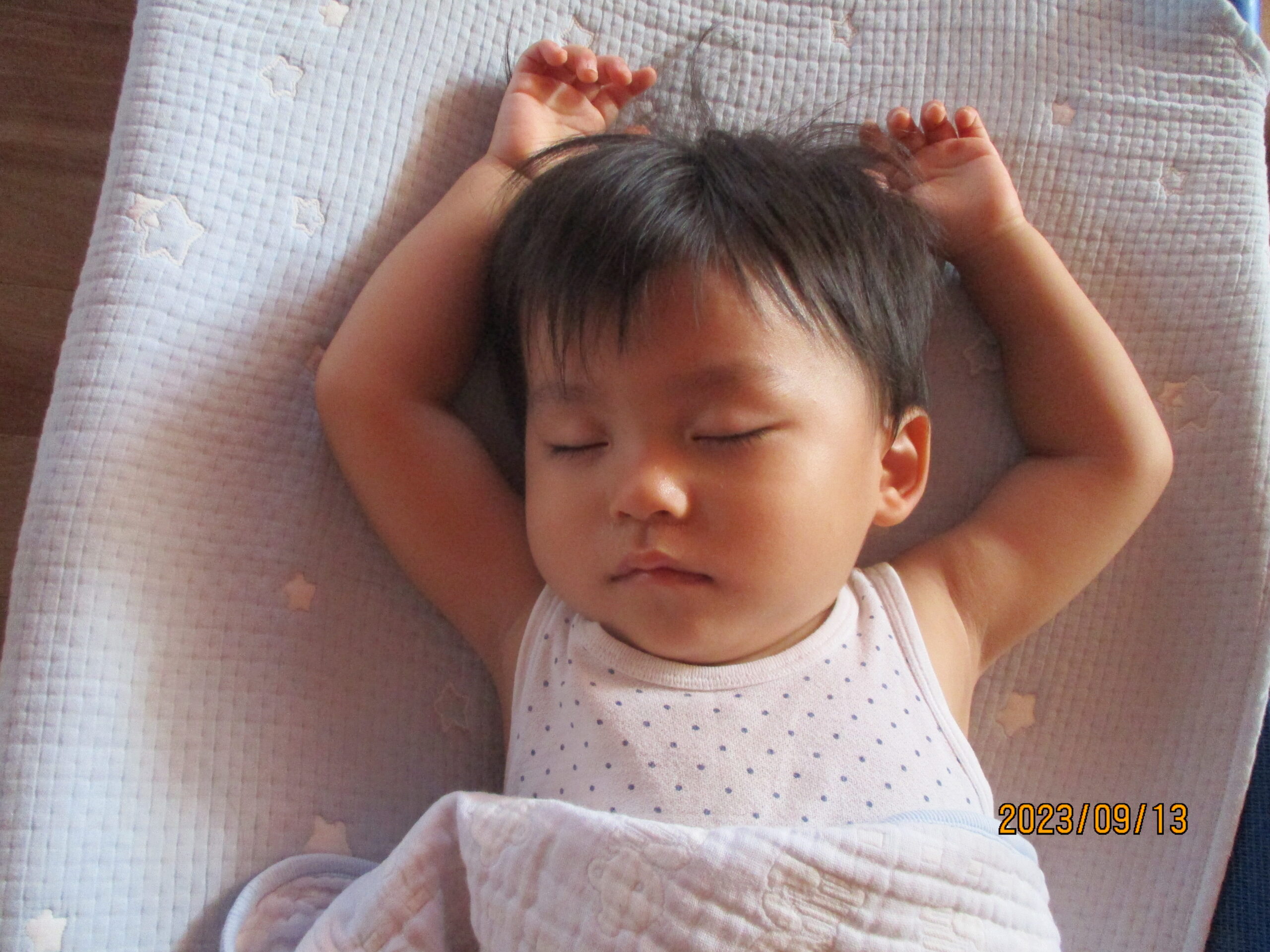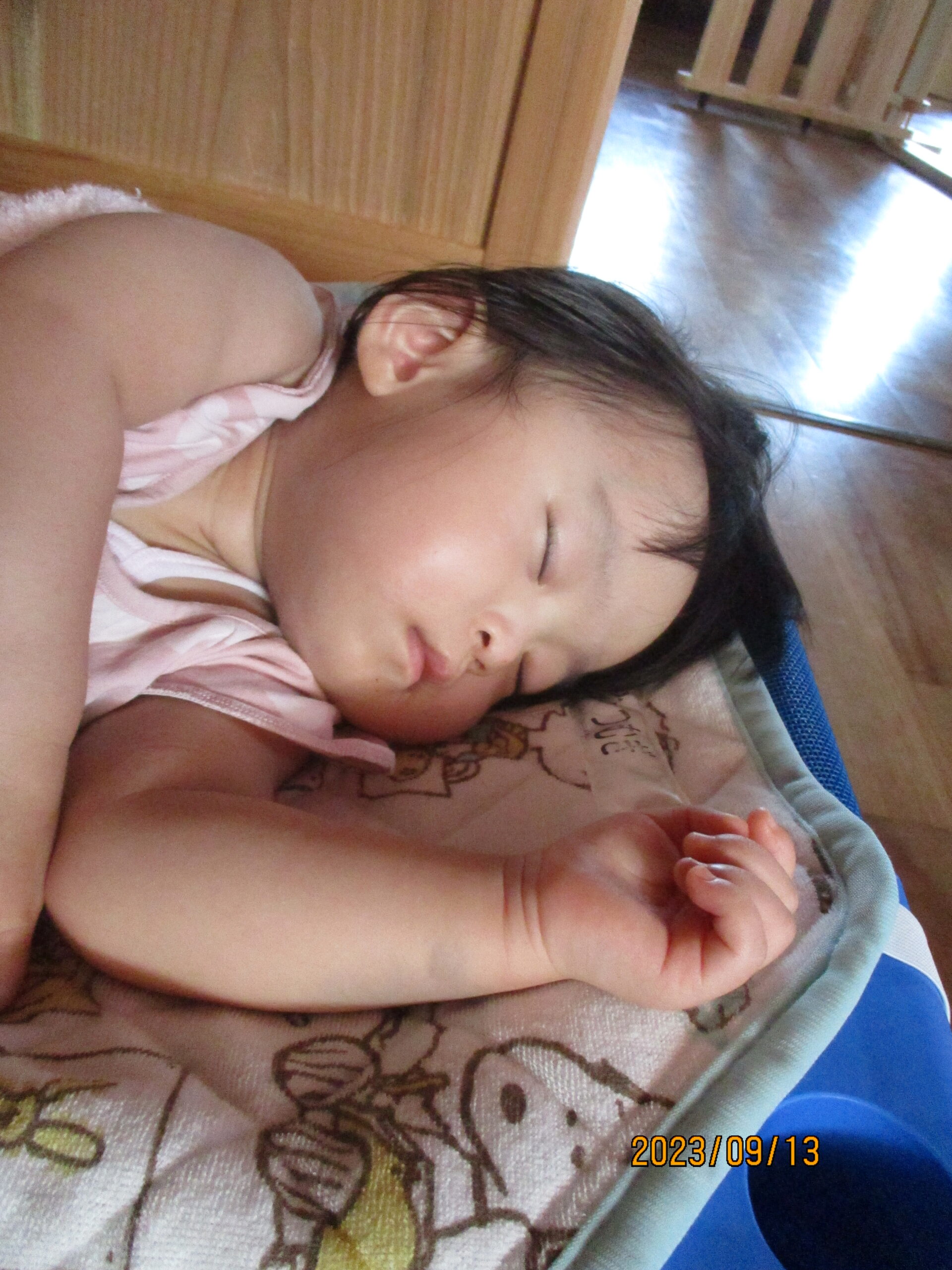 たくさん遊んでいっぱい食べた後のお昼寝の時間です。ぐっすりと寝ています。