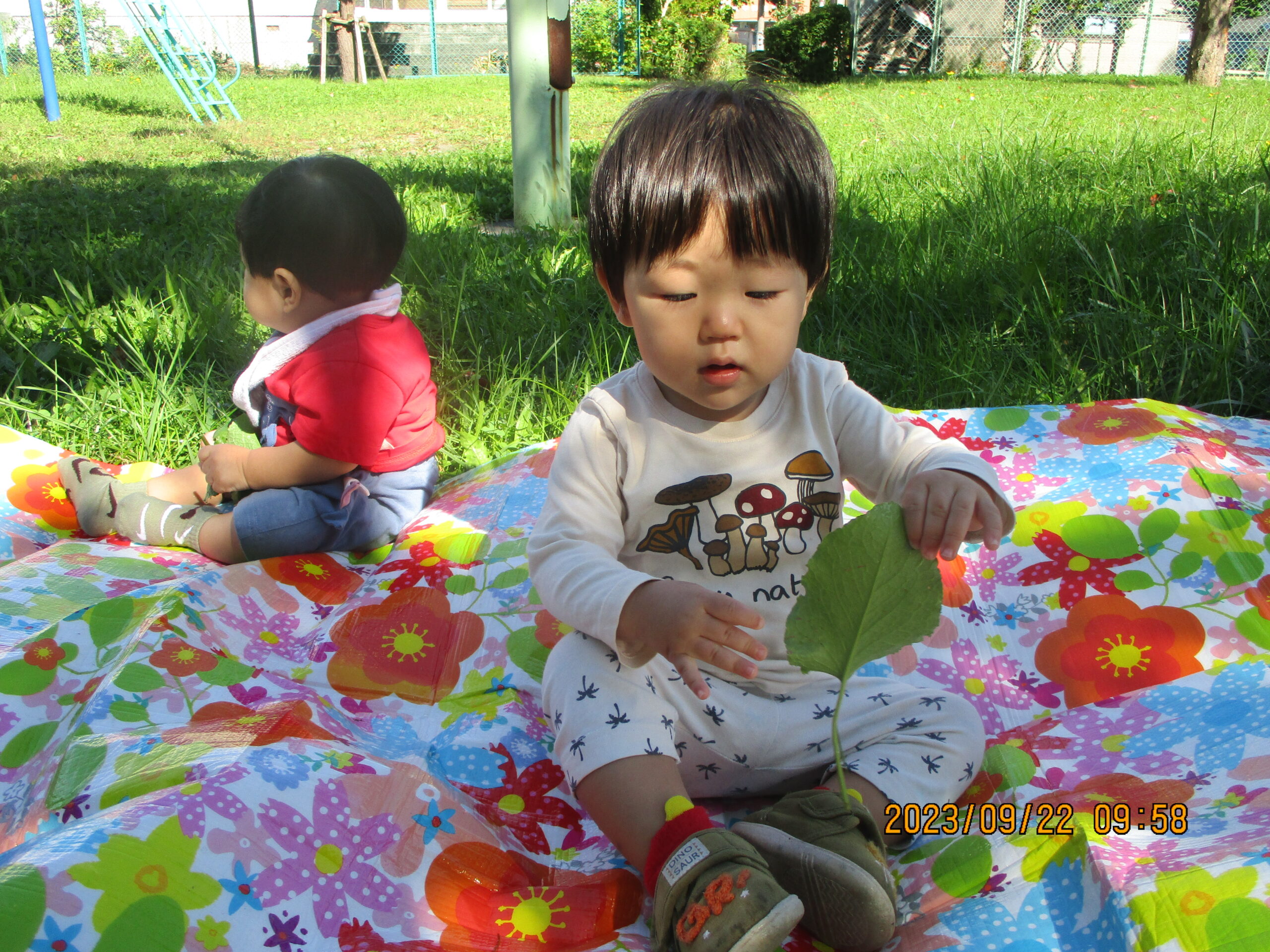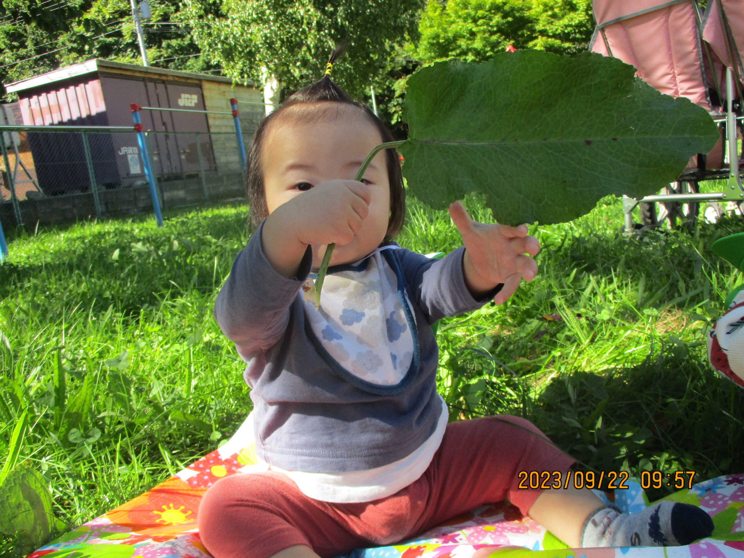 今日は、はなぞの公園に行きました。黄色いブタナの花や大きな葉が生えていて手に持ってみたり、ぶんぶんと振って雨粒を散らしたりして遊びました。