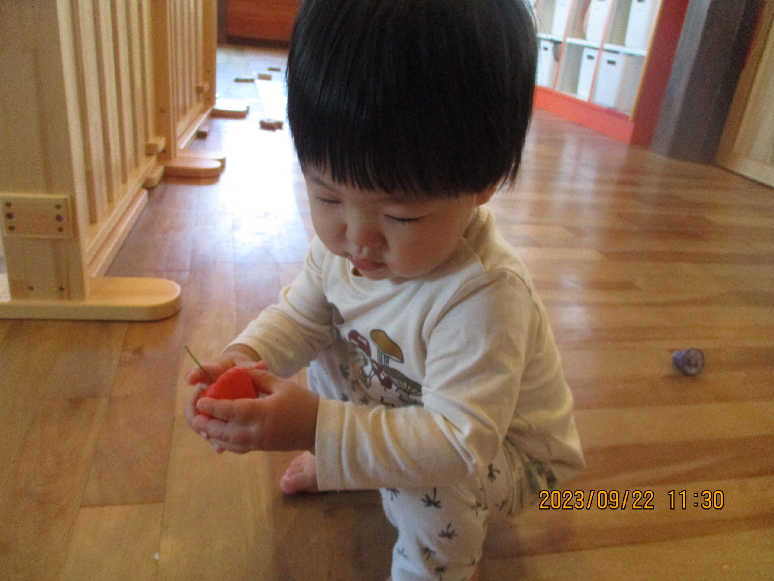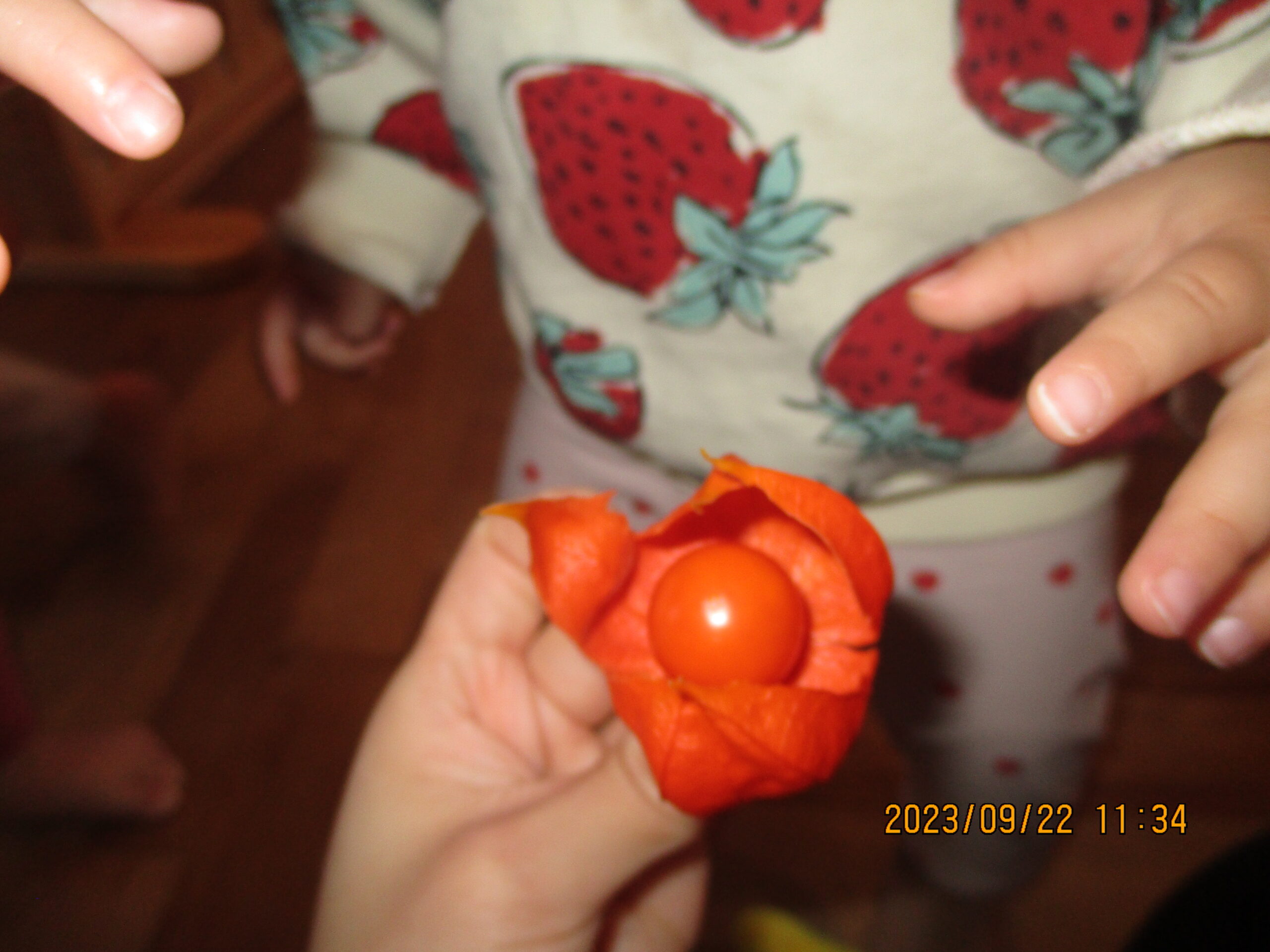 そして今日は、ホオズキを触り、剥いて中身を出してみました。中に入っている実に興味深々です!誤飲の恐れがあるため、見るだけで楽しみました。