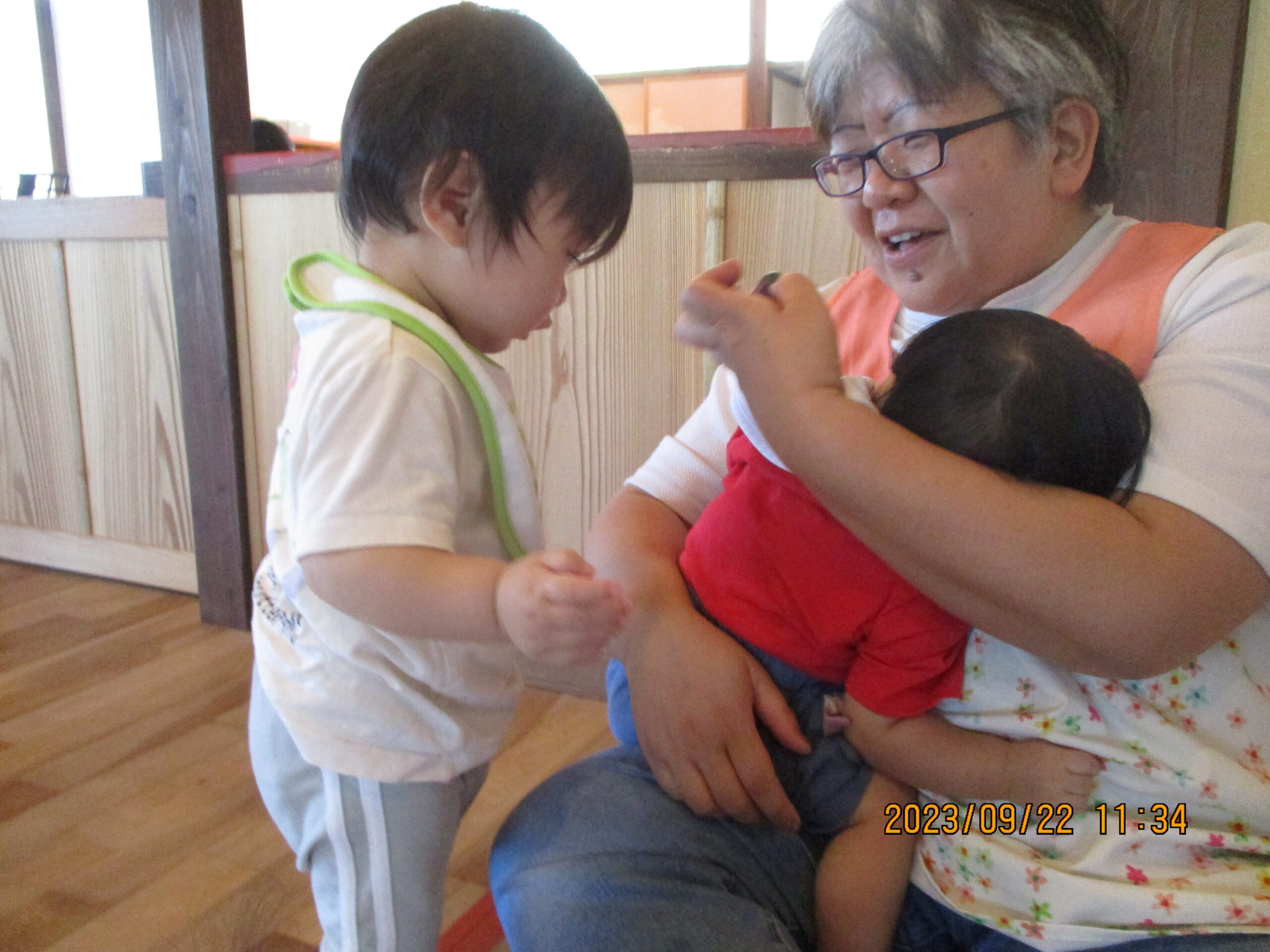 最後の写真は、職員にご飯を食べさせてくれている様子です。何回も食材を届けてくれましたよ。また来週、たくさん遊びましょうね!