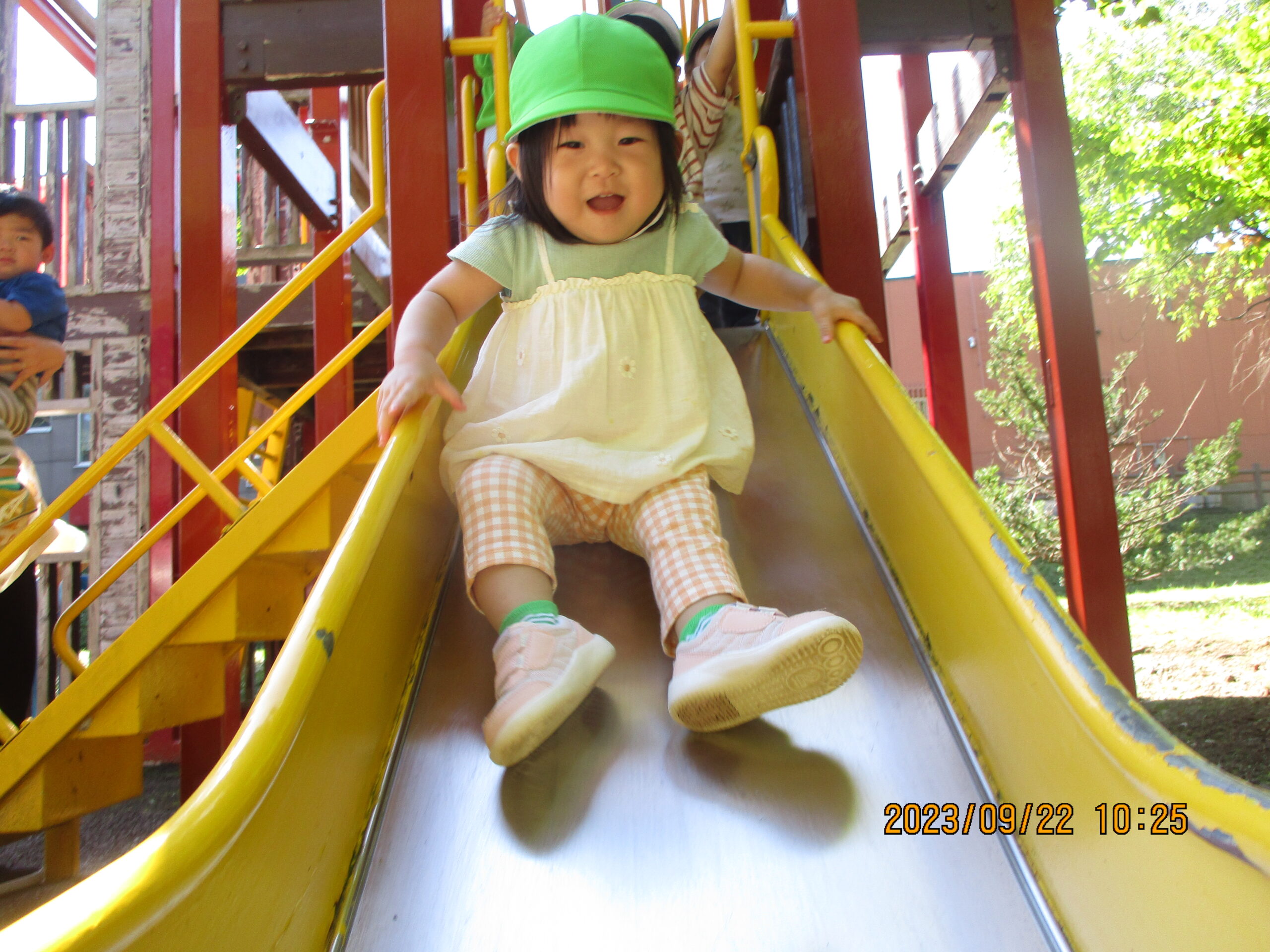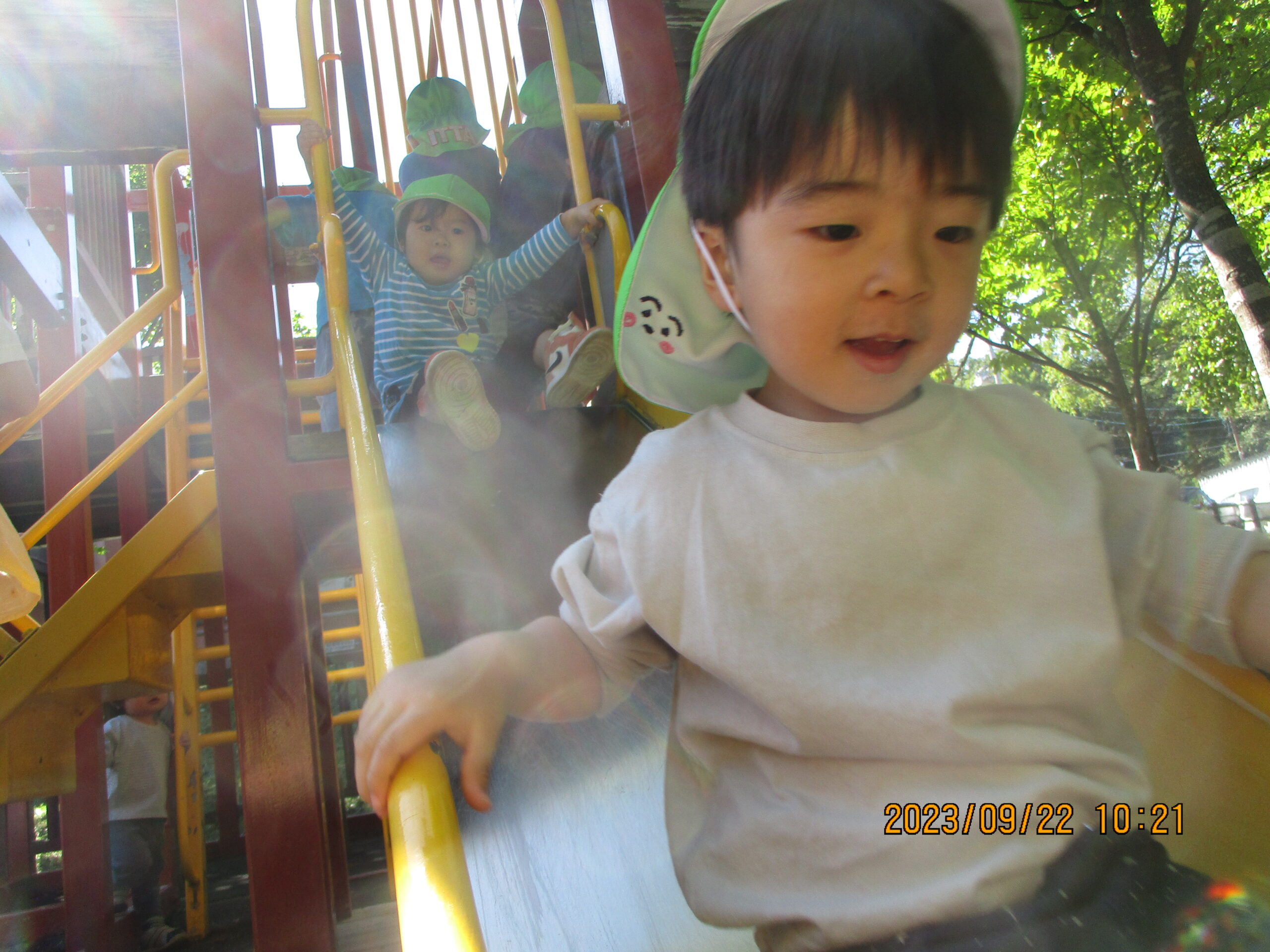 今日も元気いっぱい外で遊んで来ました。藤野東公園にある滑り台を滑りに。何度も滑っていましたよ。