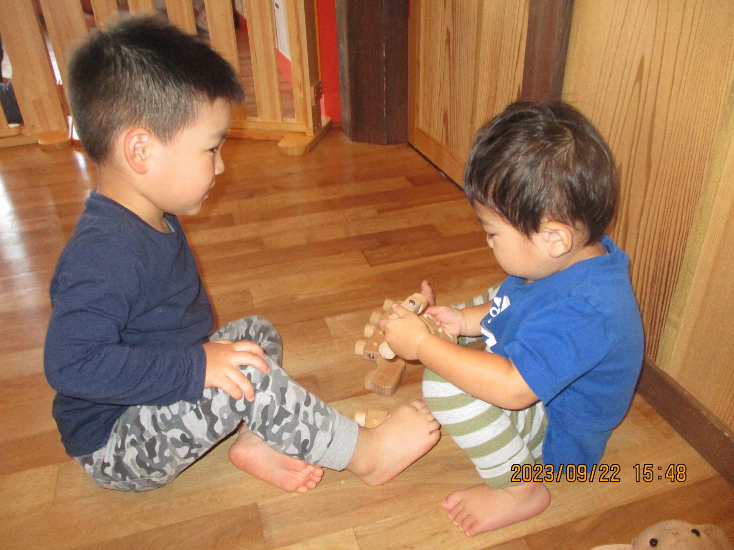 午後の一コマ。くるみ組のお兄ちゃんとくり組さんで楽しそうに車で遊んでいて微笑ましかったです。最近は友達と一緒に遊ぶのが上手になってきています。