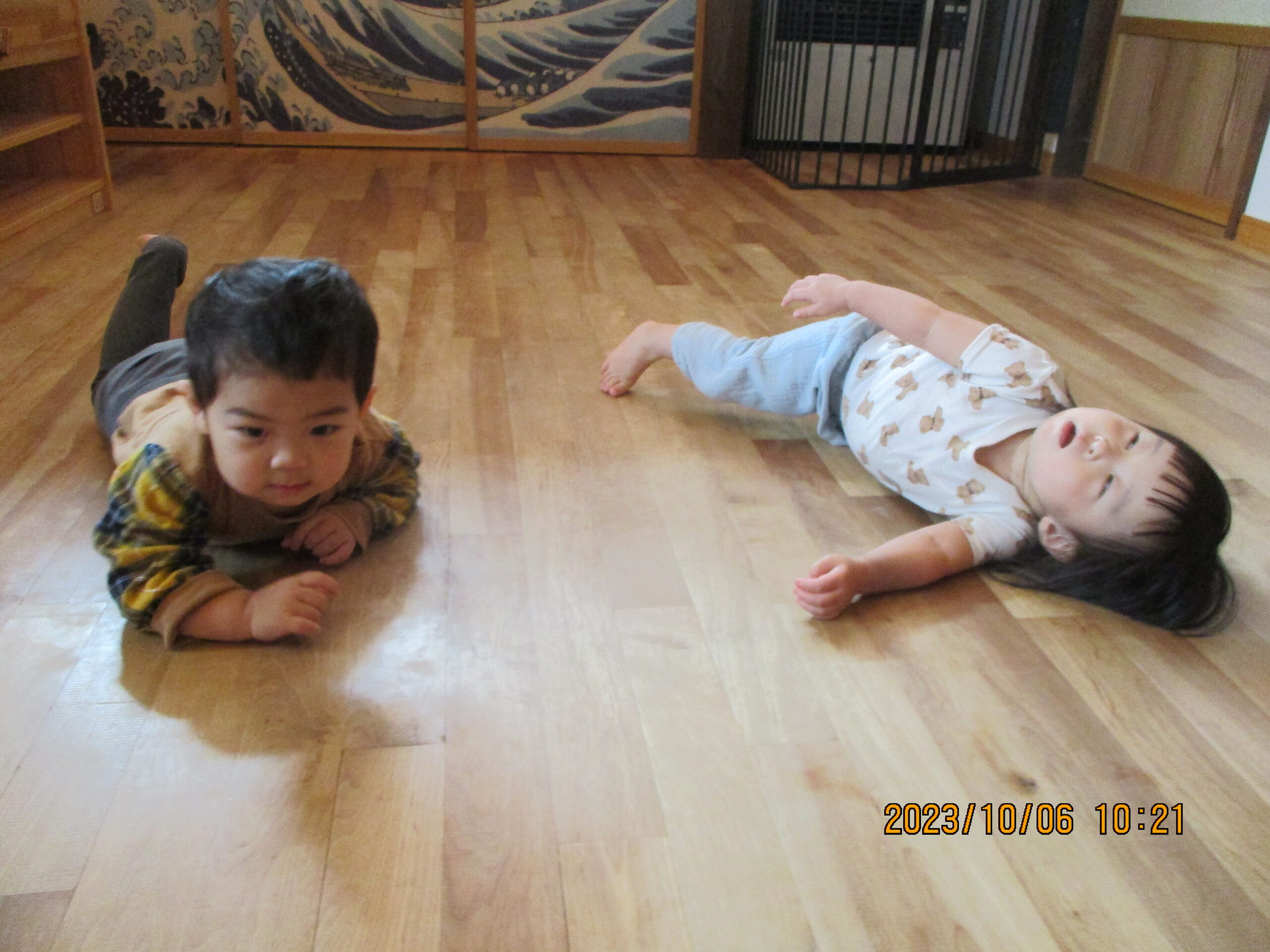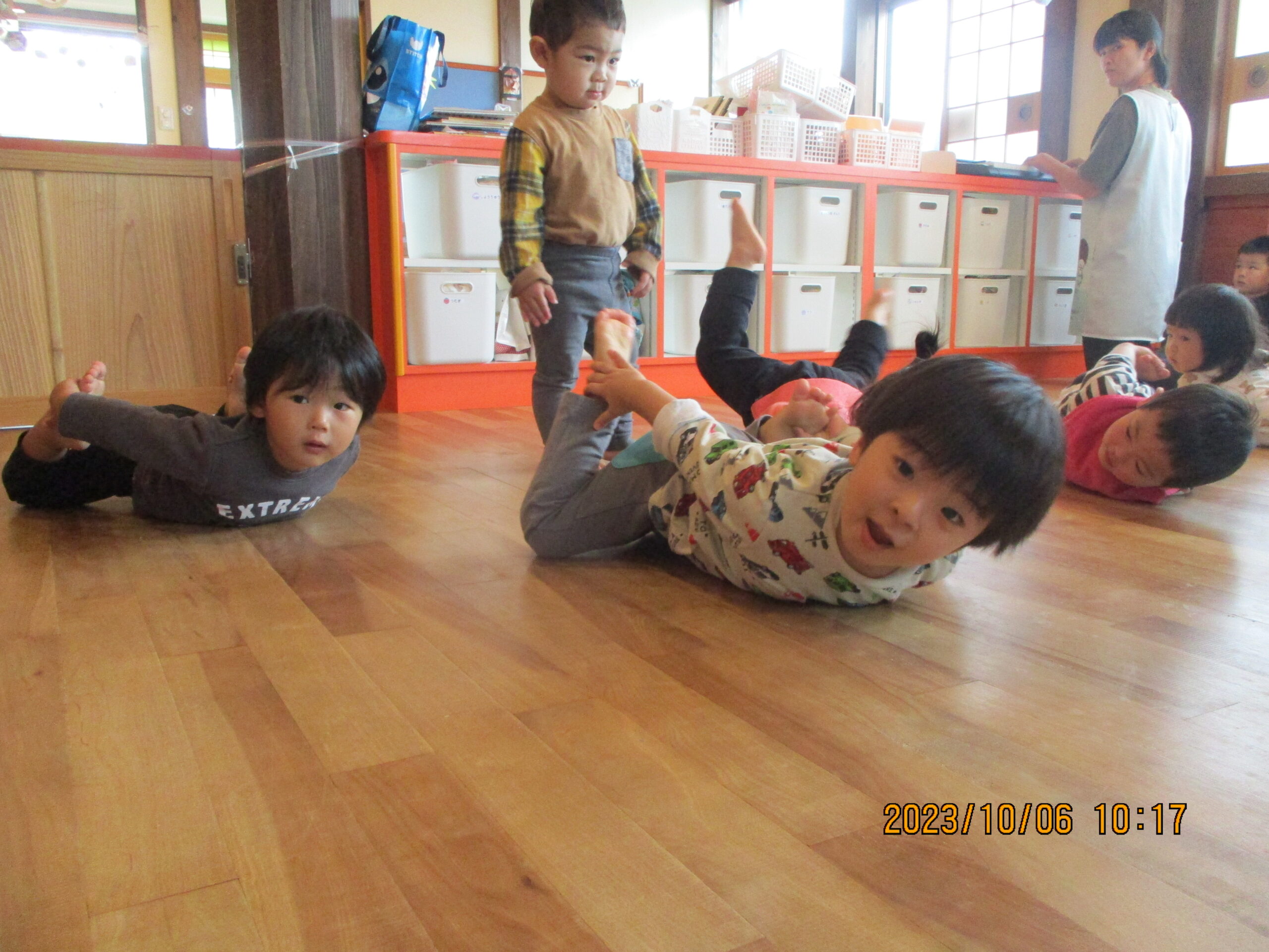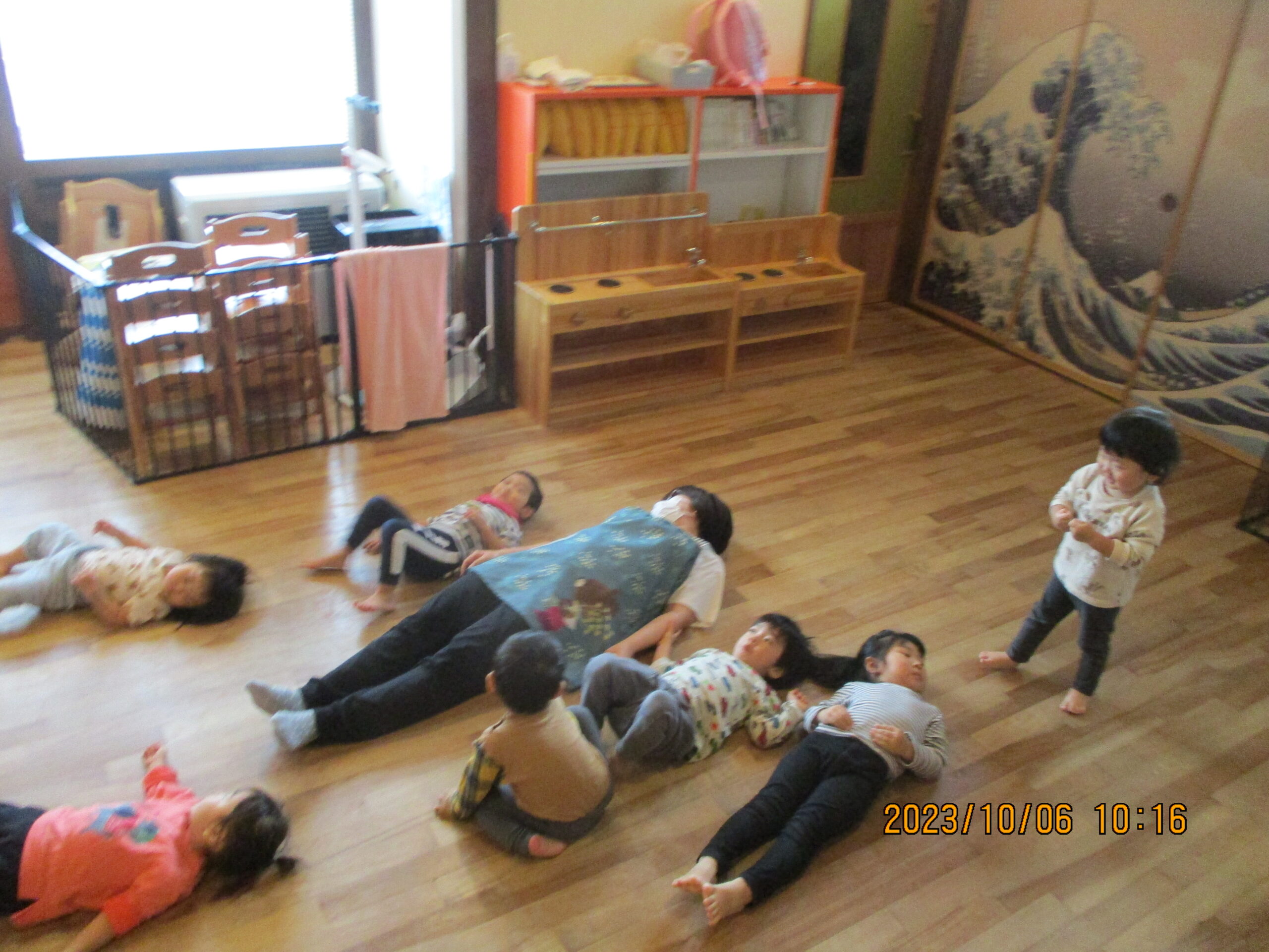 まずは、リズム遊び。保育士の模倣をして元気に身体を動かしています。 ジャンプや走る・寝るなどして、トンボ・うさぎ・時計・カメ・になったりしました。そして、わにやうまになって皆でお部屋のはじからはじまで競争。