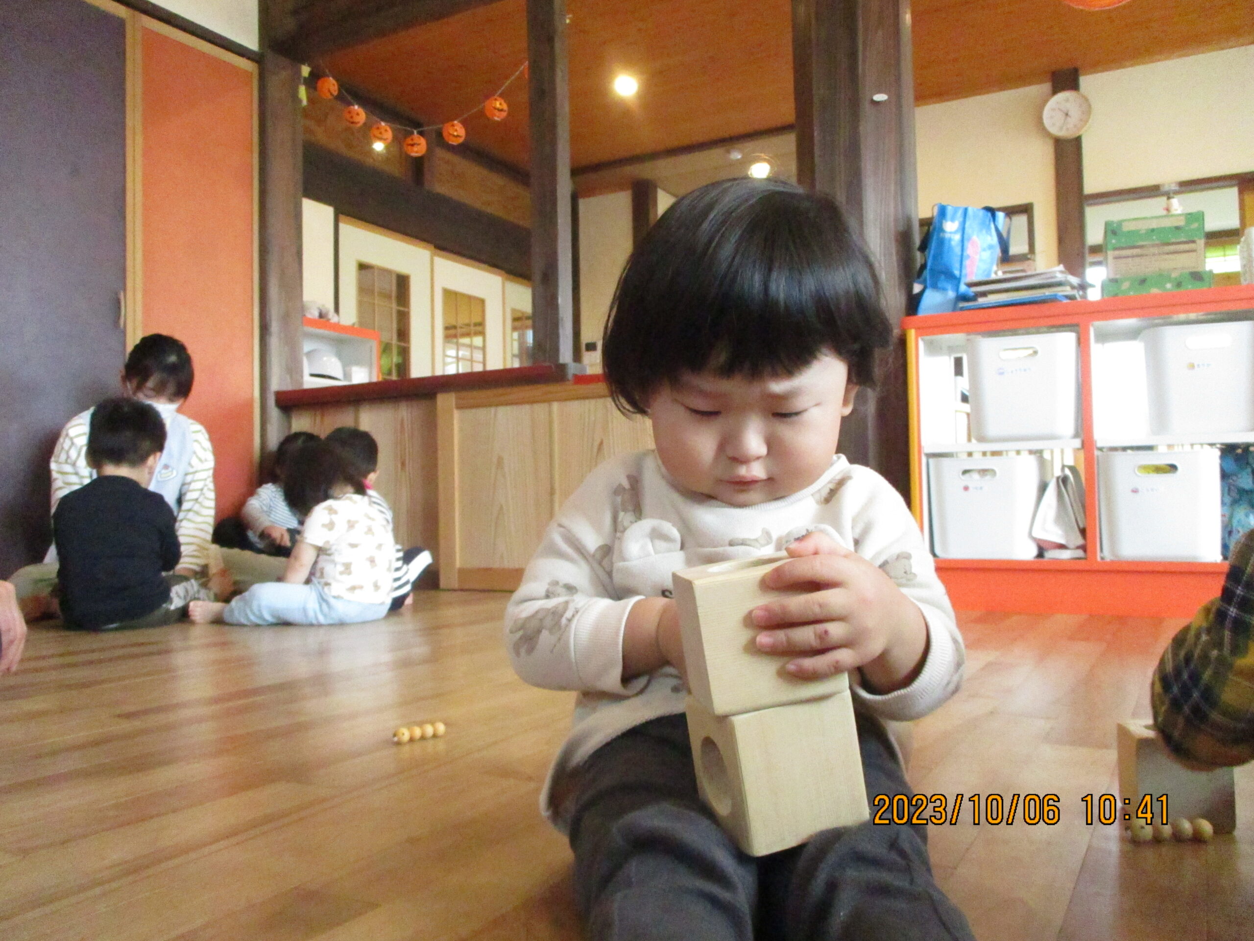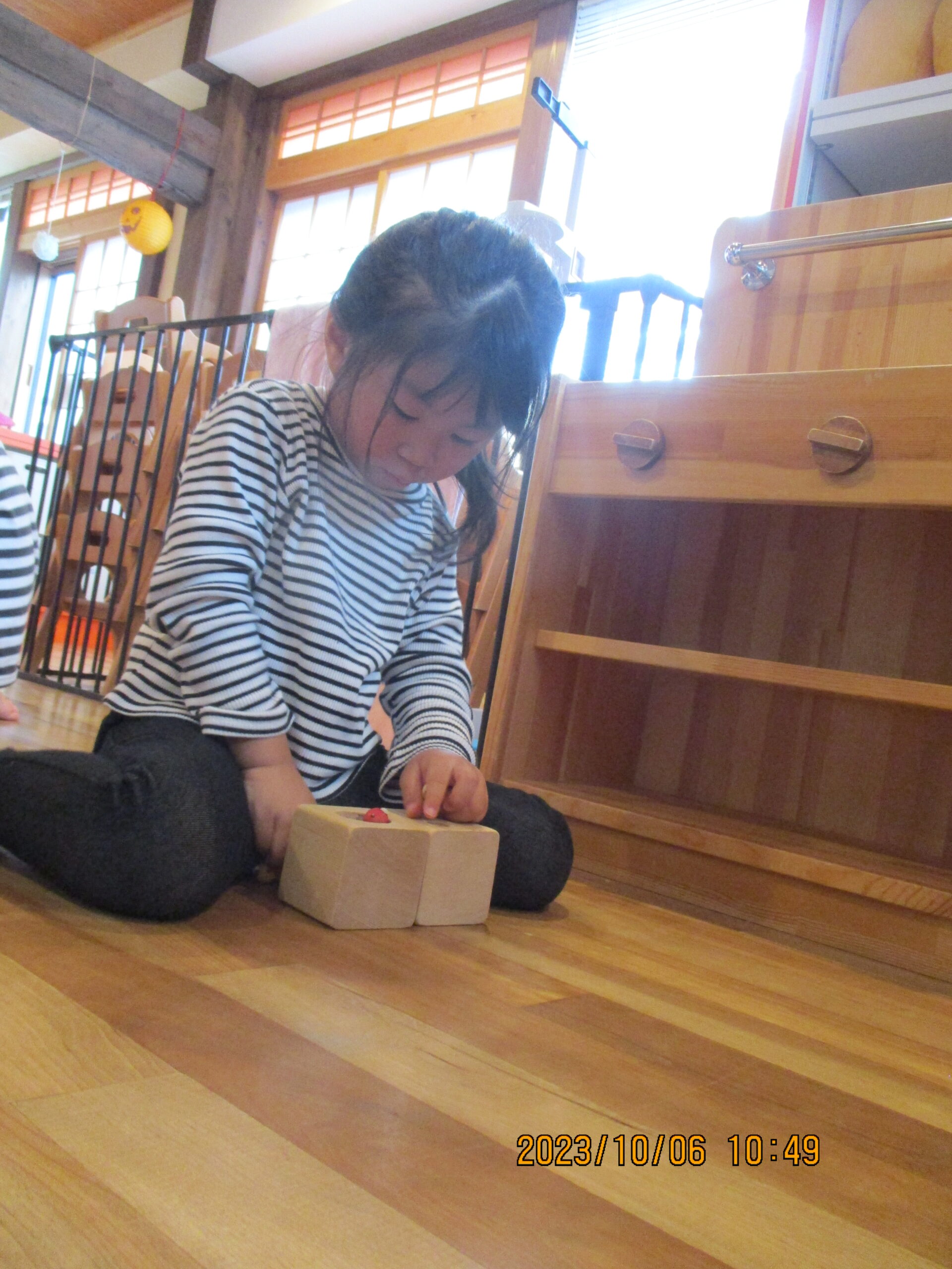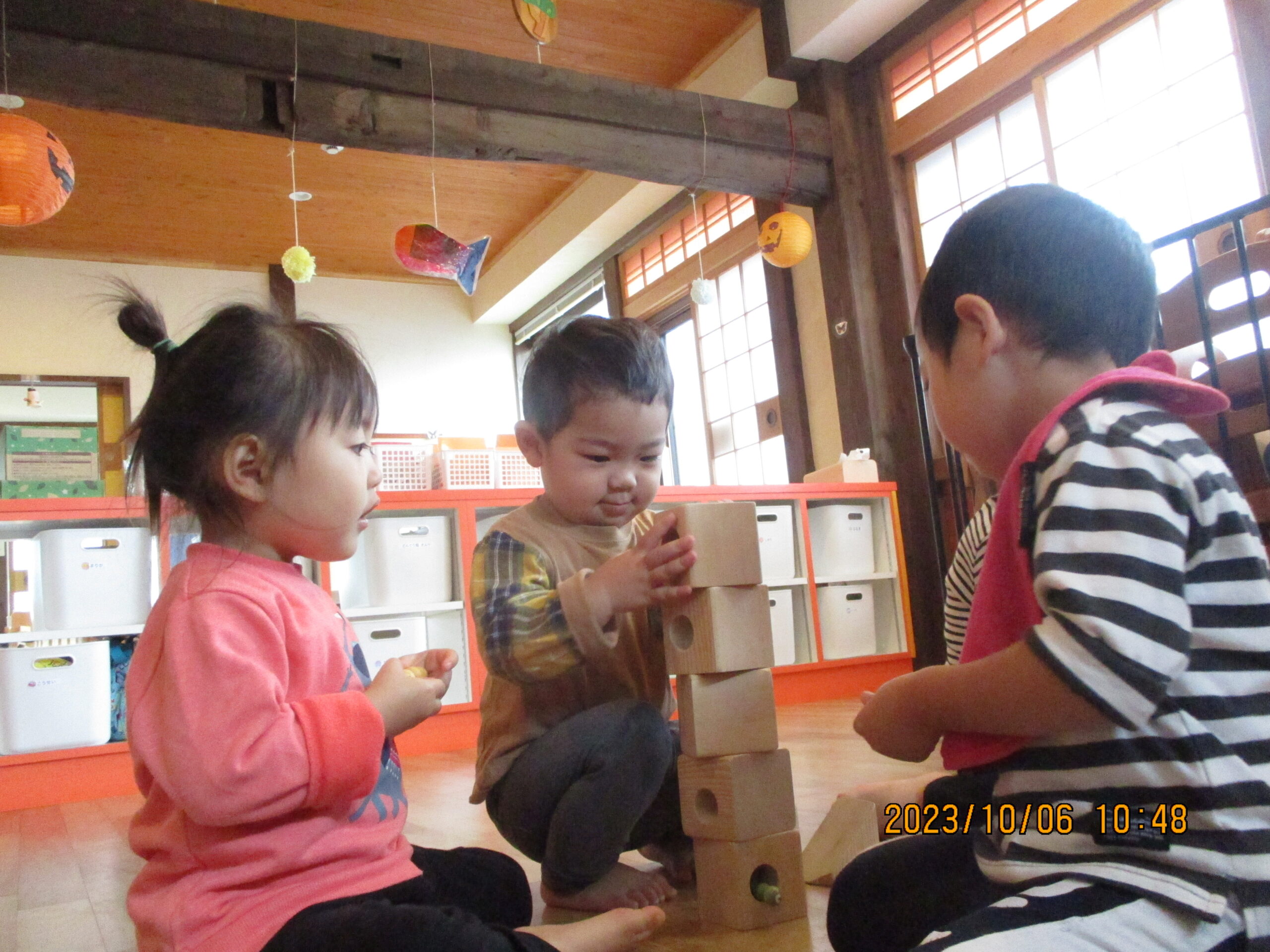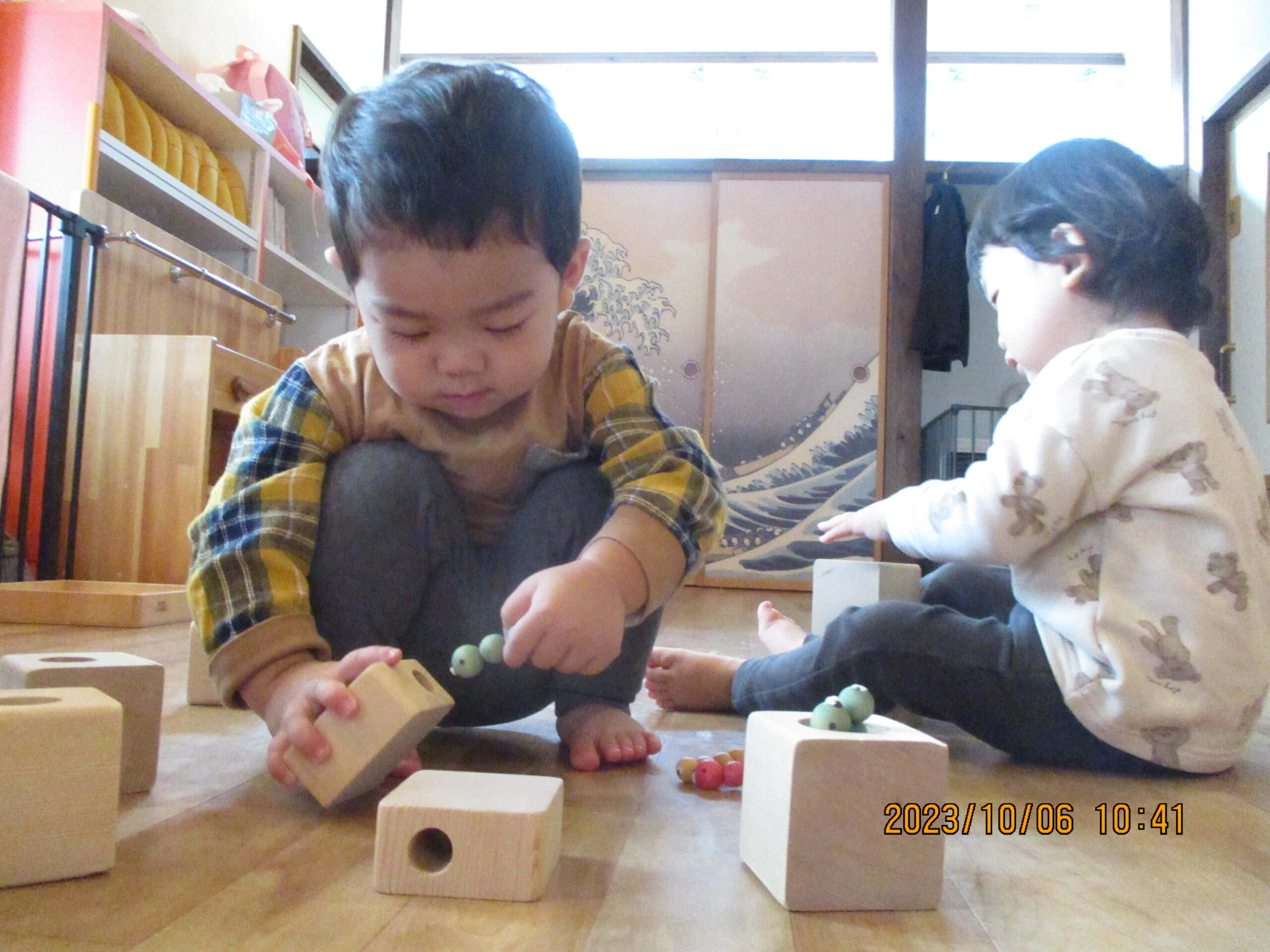 ひっつき虫を木のお家に入れたり、家を積み重ねて楽しんでいます。
