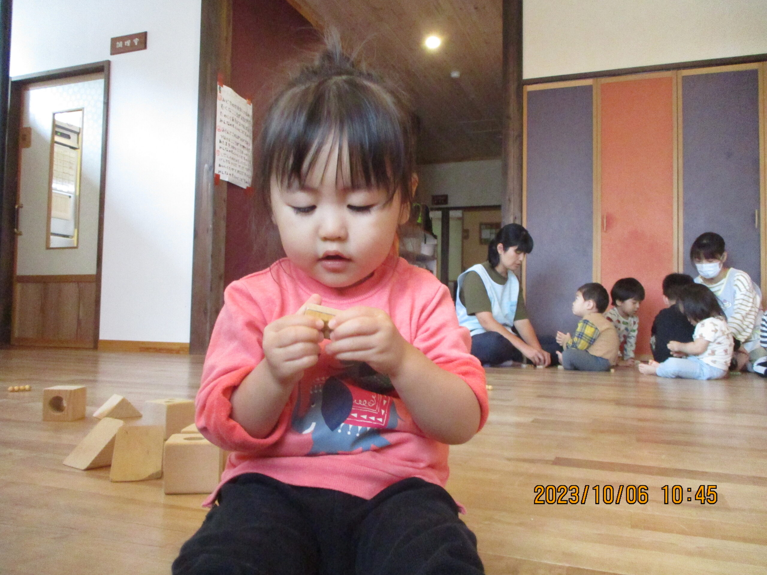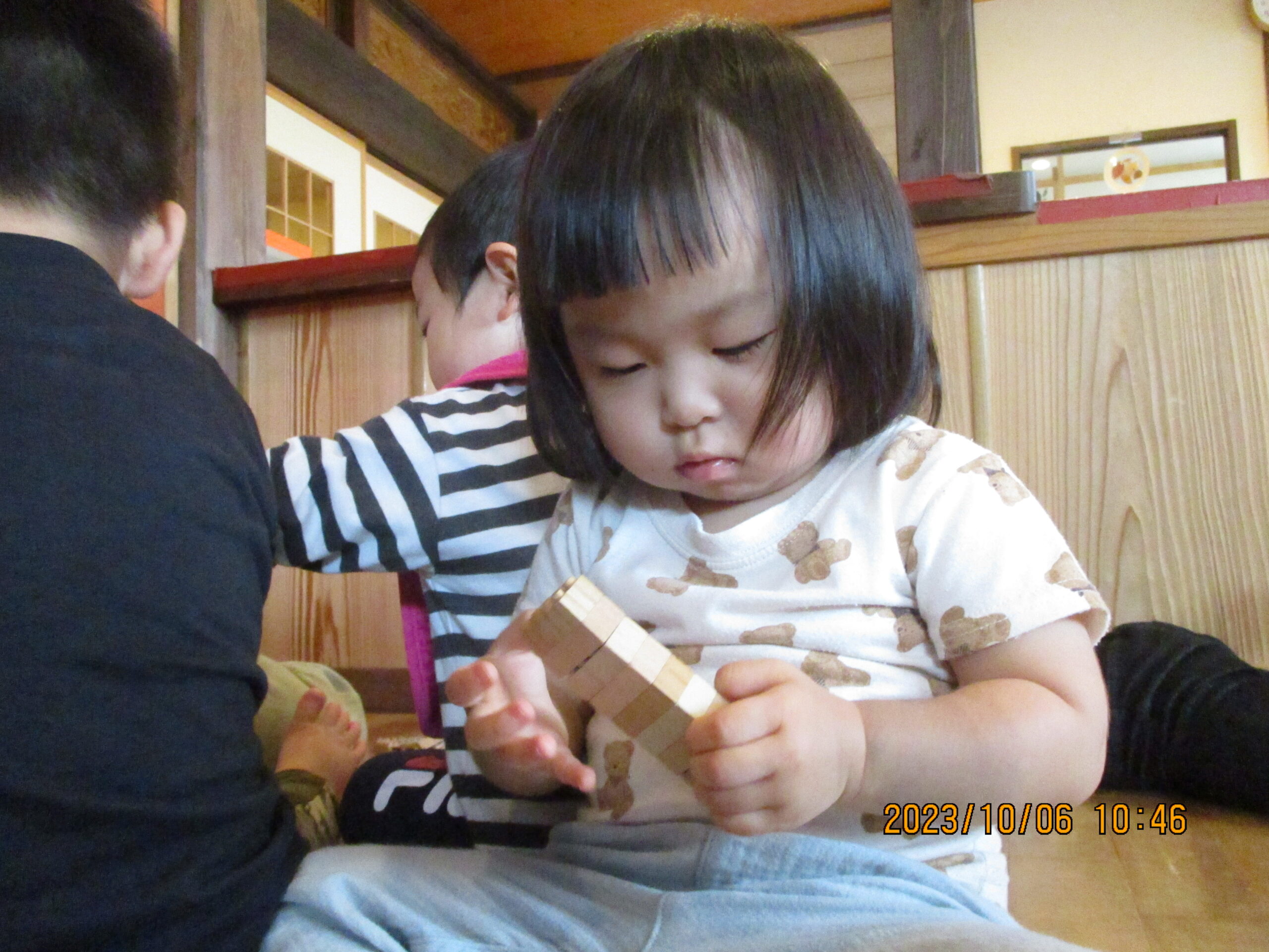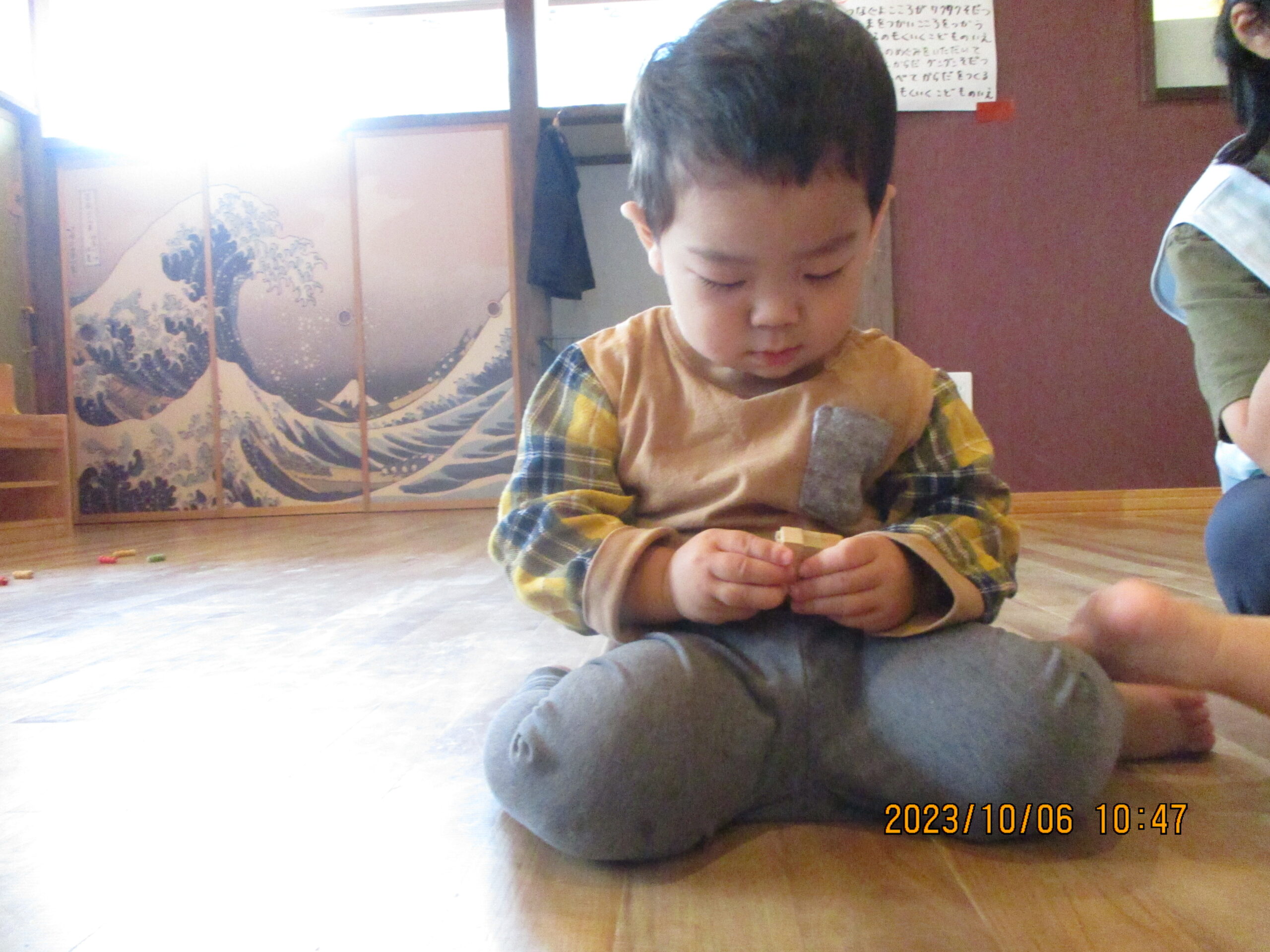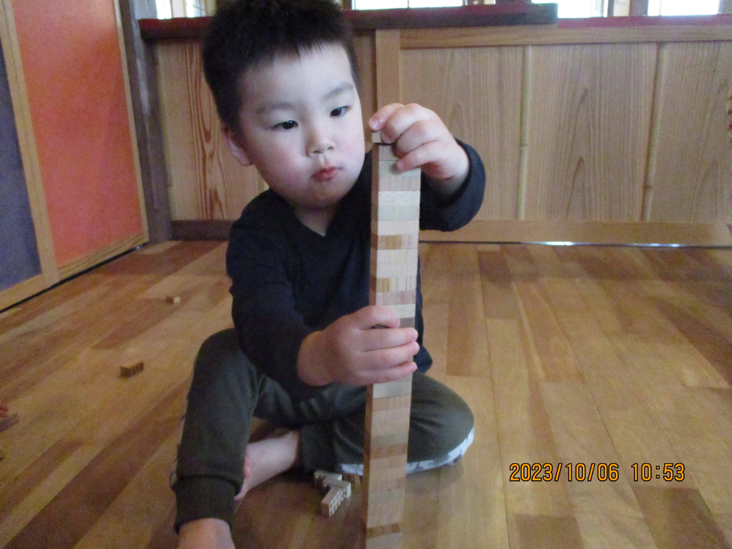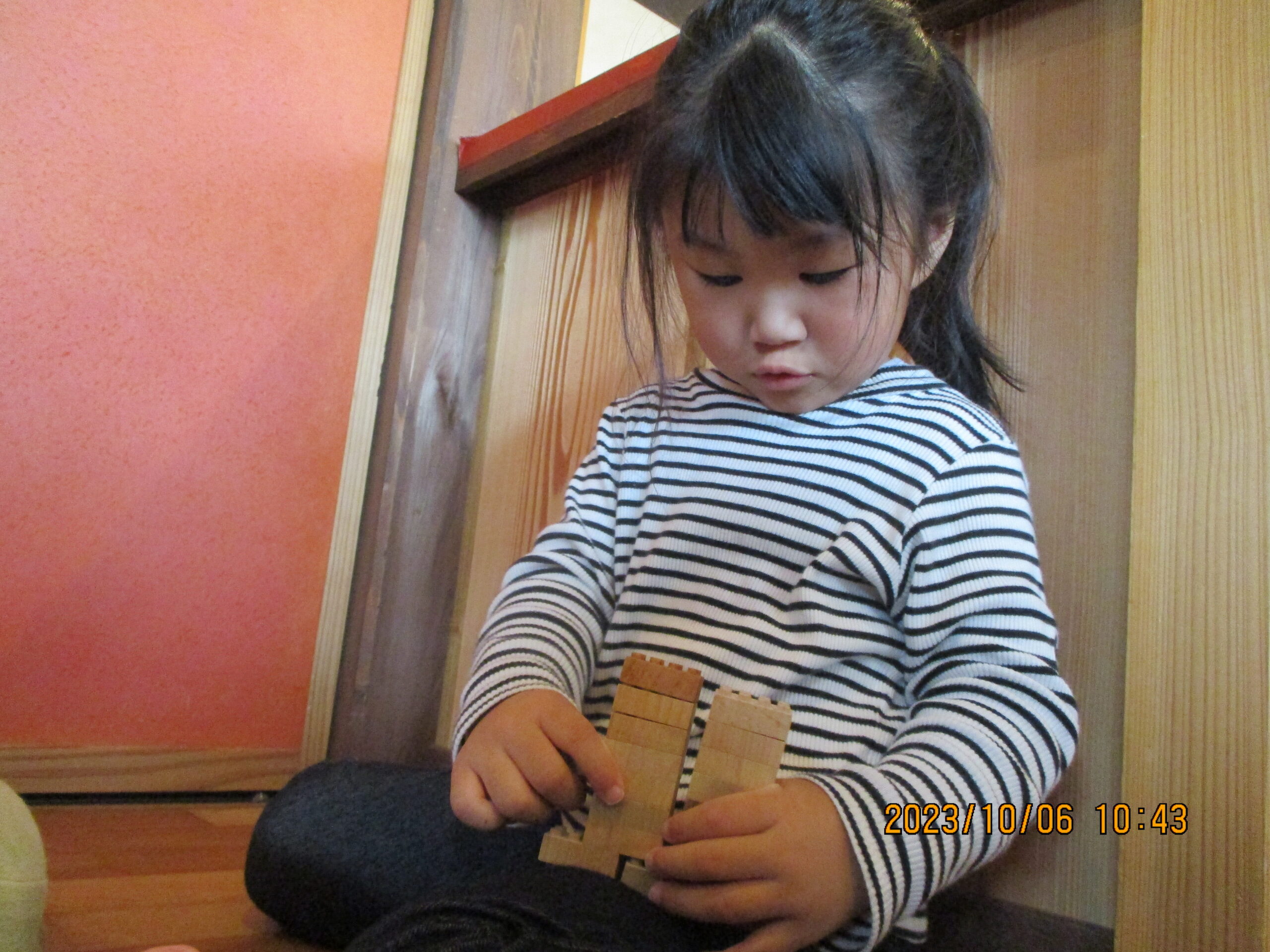 ひっつき虫を木のお家に入れたり、家を積み重ねて楽しんでいます。