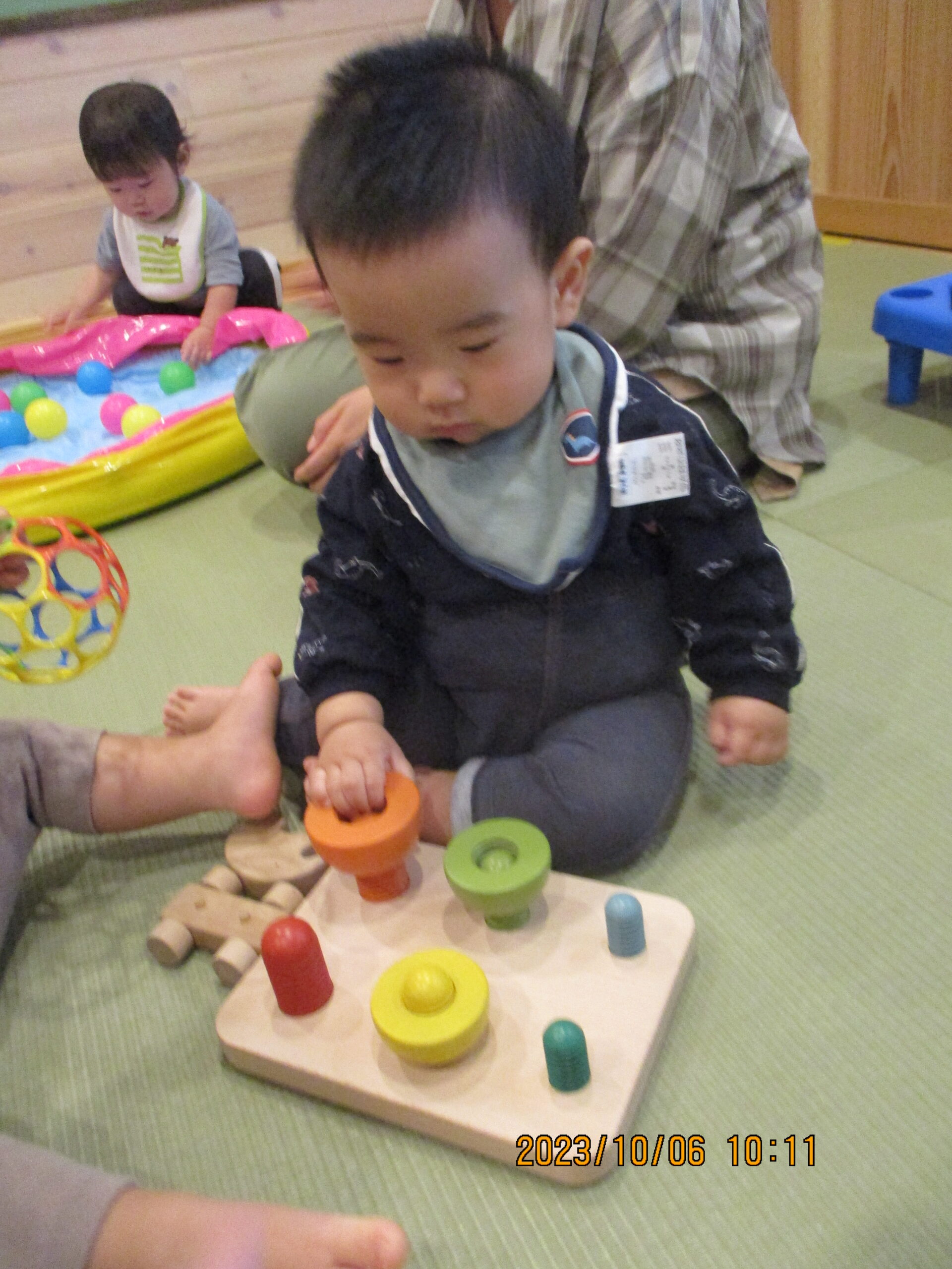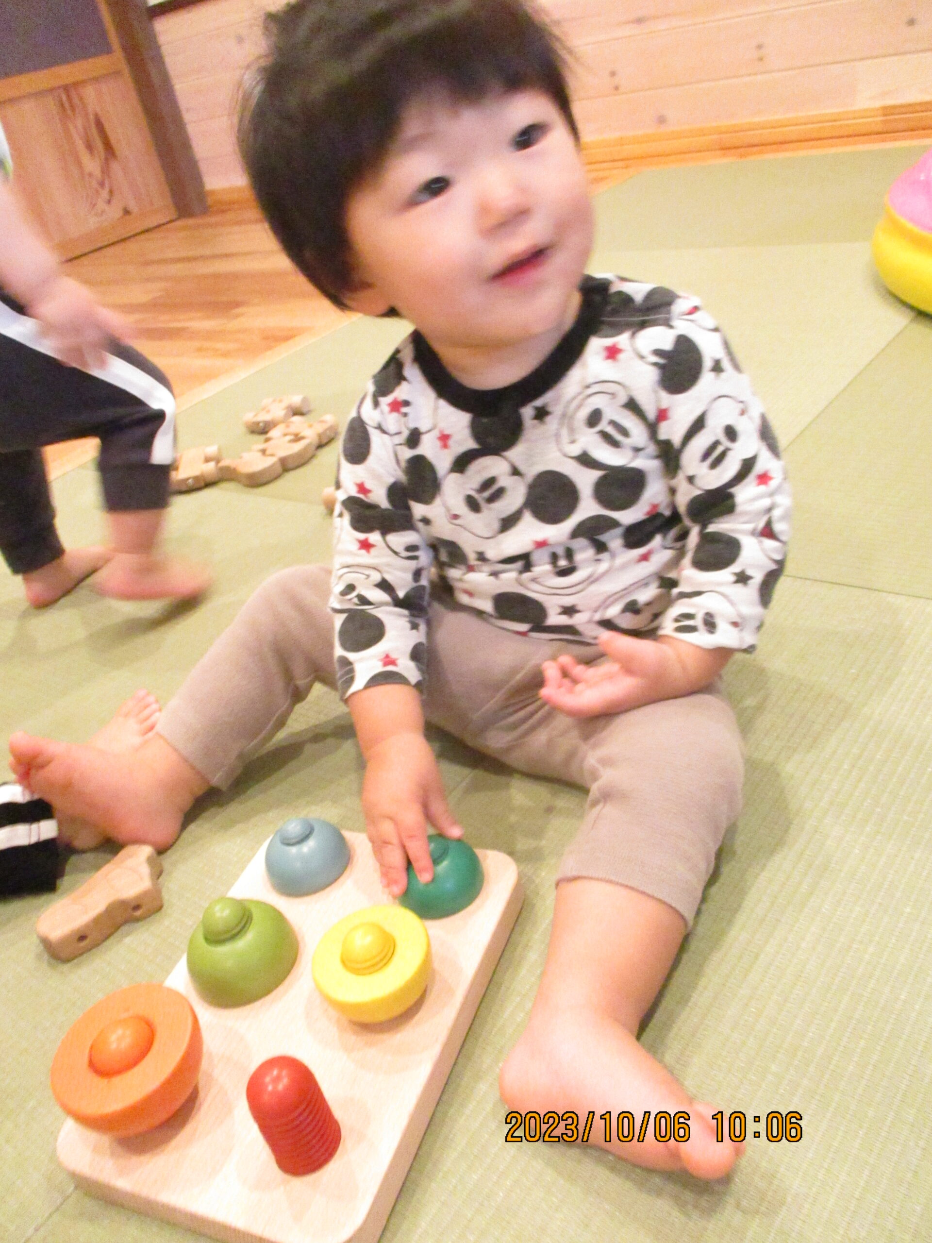 先週のどんぐり組の様子です♪初めての木の玩具(きのこのこのこという名前です)やボールプールを出して遊びました。 初めての木の玩具に興味津々の子ども達です。少し難しいですが保育士が見本を見せると上手に回すことができましたよ。