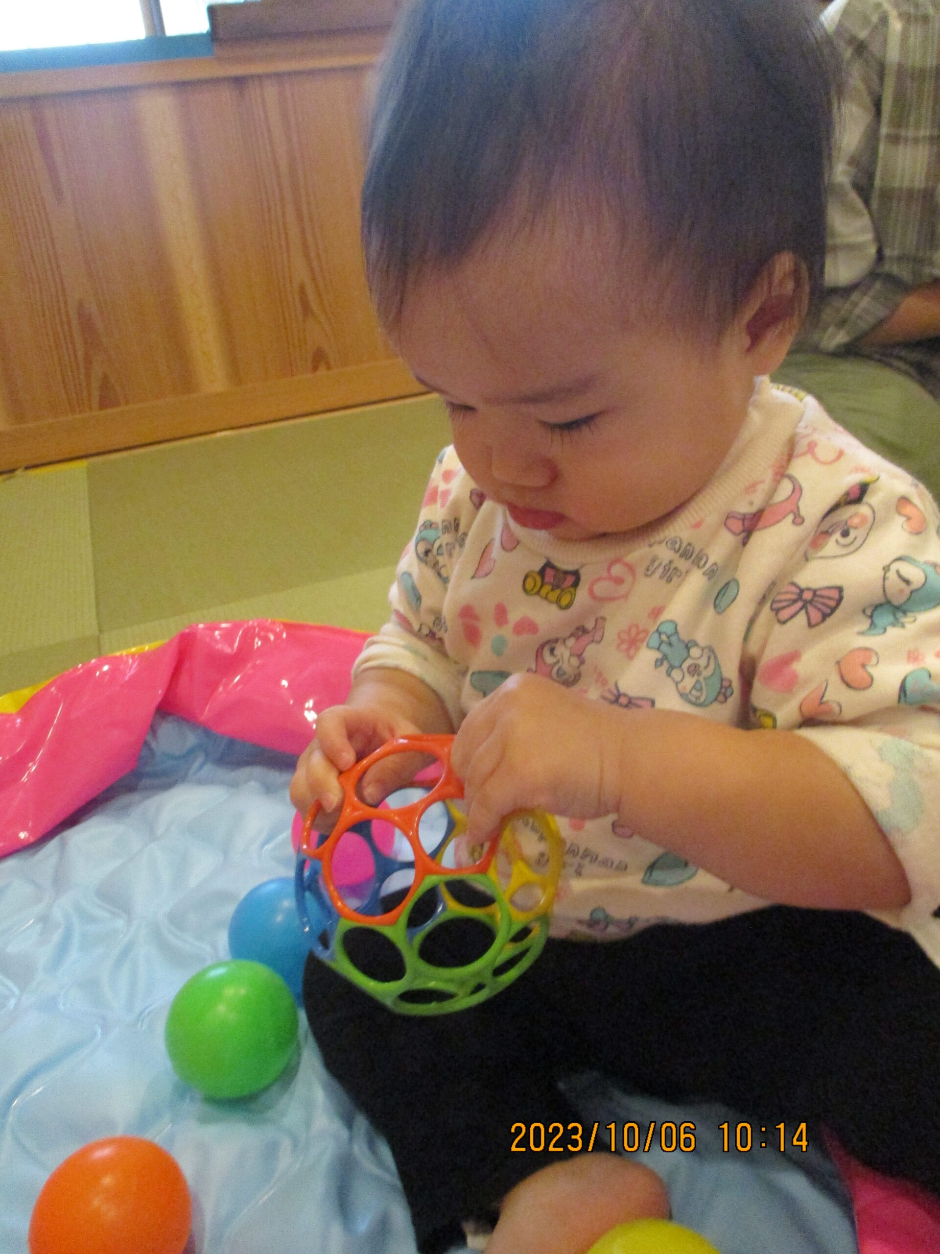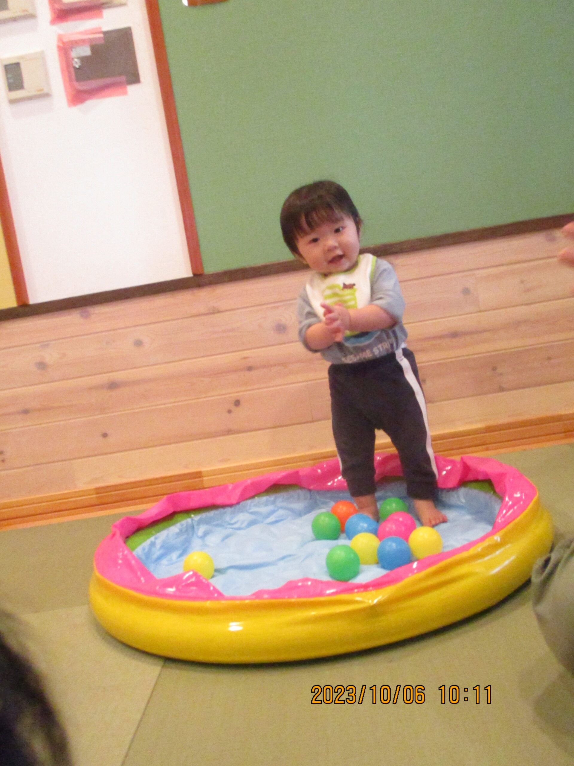 ボールプールでは、ボールの感触を確かめたり、ボールプールの中に入りニコニコ笑顔で手を叩いたりする姿も見られましたよ。