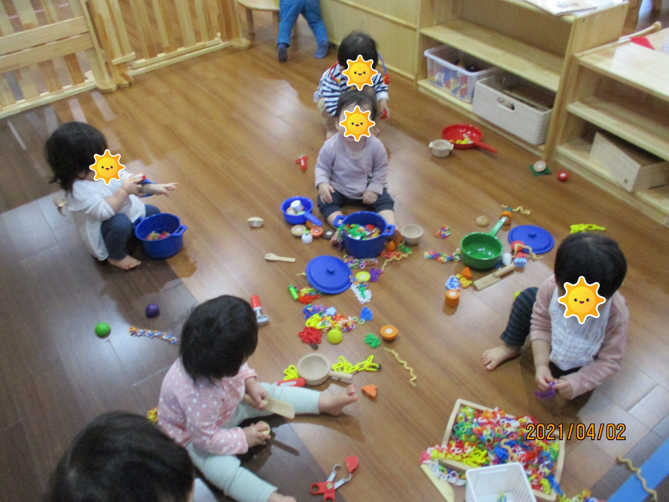 新年度がスタートし、新川園には9名の新しいお友だちが入園しました。 初日の4月1日は、新入園児はお母さんと離れるとみんな泣き…在園児もオドオド戸惑い… でも、楽しい遊具を見ると遊んでみたい気持ちでキョロキョロ…でも泣きたい気持ちも…信頼できる大人は誰かな?複雑な感情の2時間でした。 気に入ったおもちゃを見つけて、たくさん出して遊んでいました(笑) 初日にしては、午前おやつも食べられたし、泣かずに遊ぶ時間もあったし、優秀な新入園児さんたちです! 早く慣れて、楽しく遊ぼうね!
