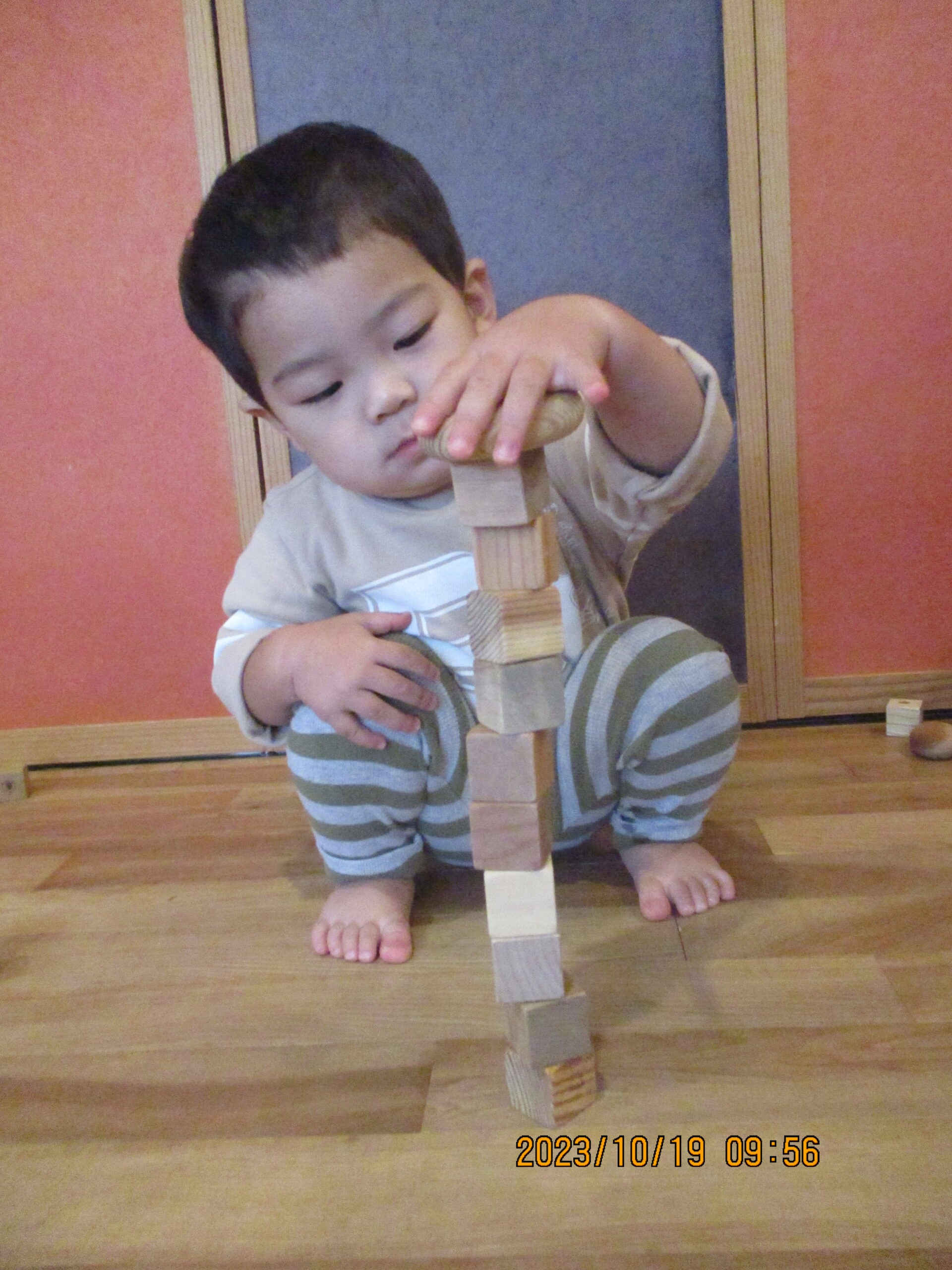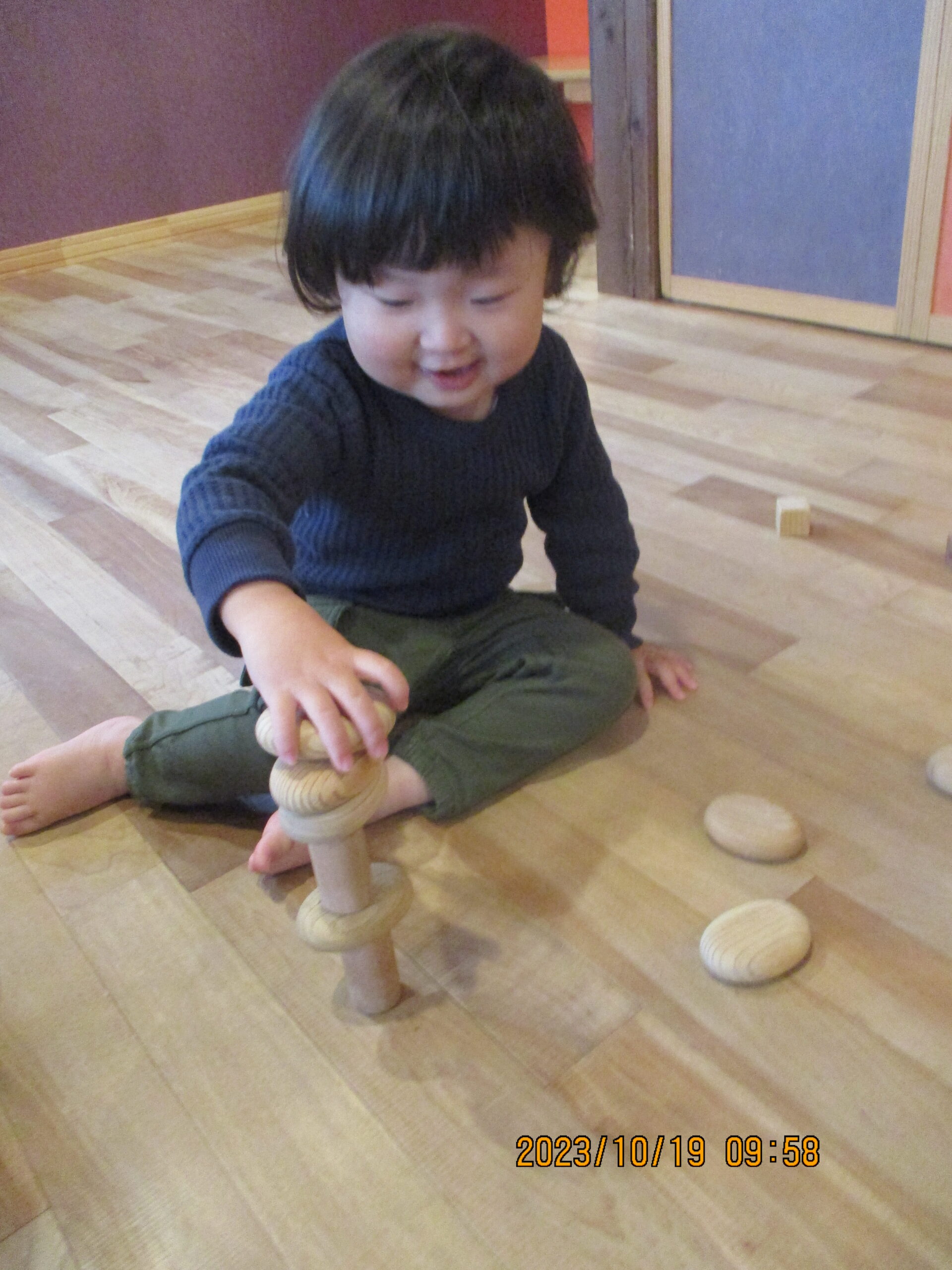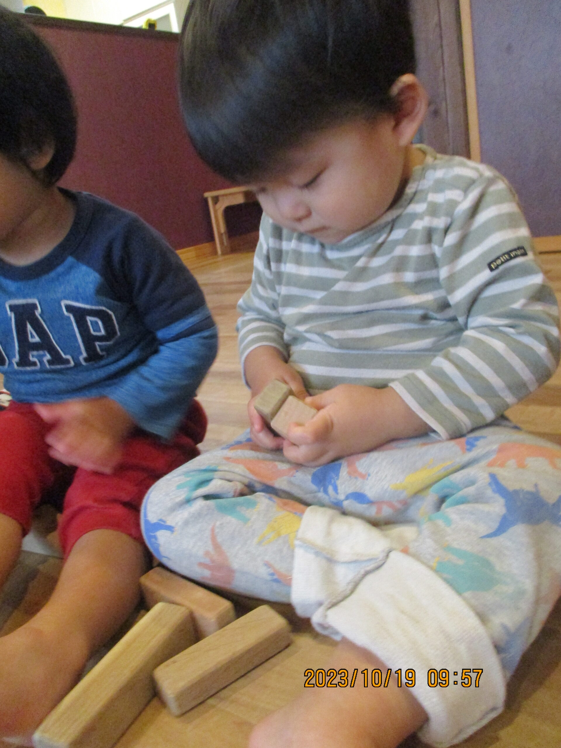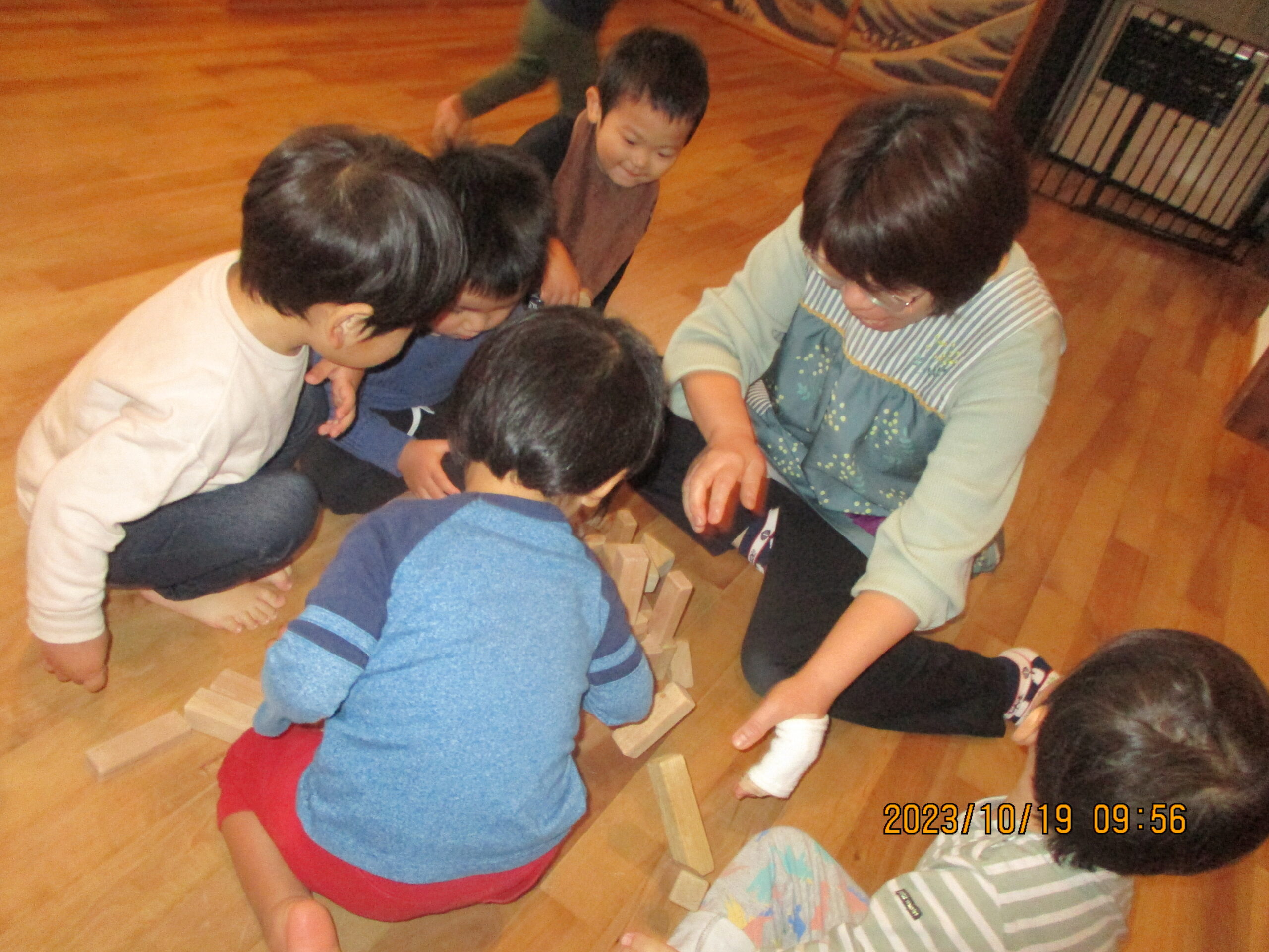 今日はくり組、くるみ組で積み木や動物磁石、体操をしました。積み木では上手に積み重ねたり、動物園を作ったりと遊んでいました。