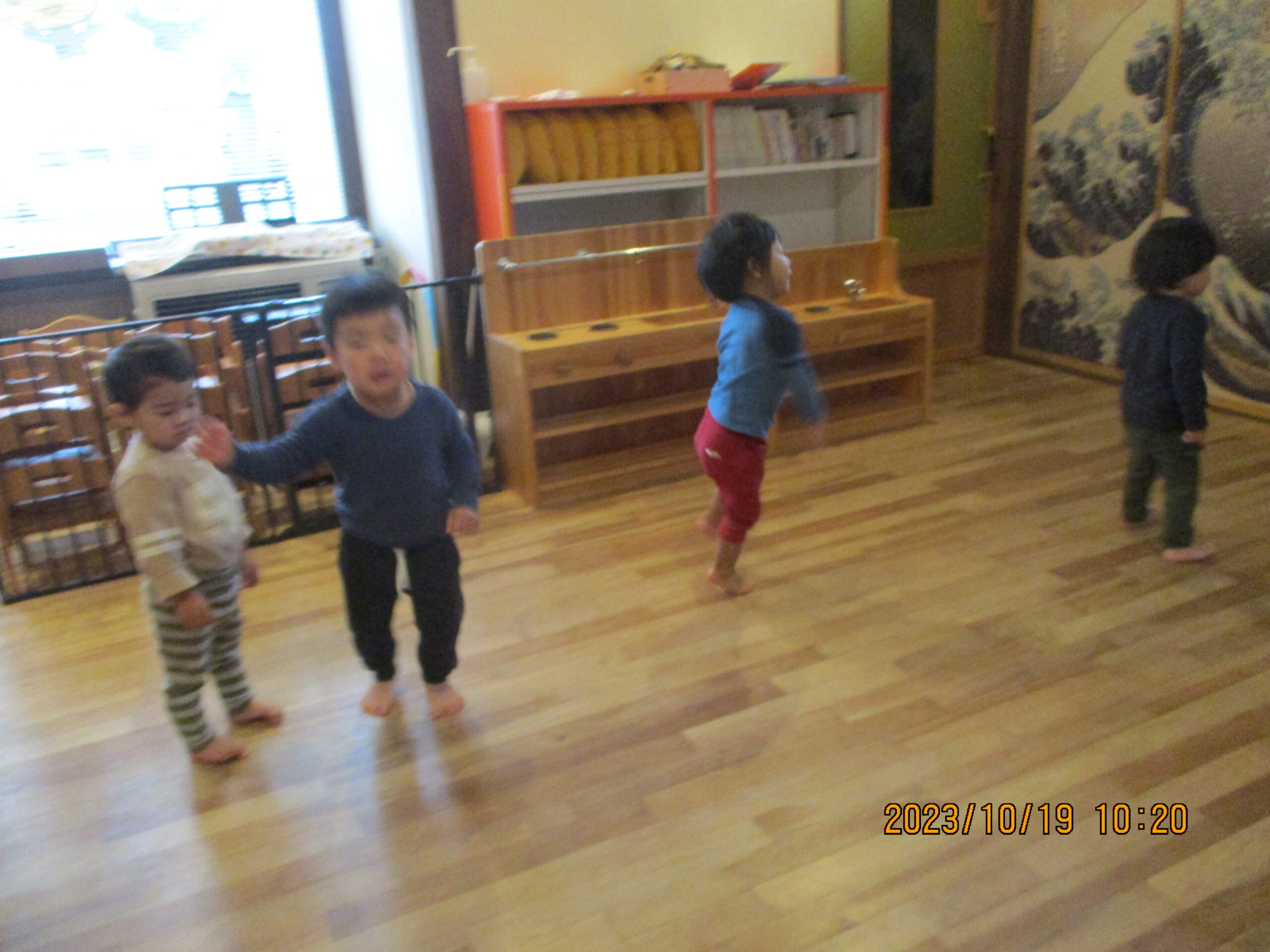 積み木で遊んだ後は体操をしました。音楽がかかると体を揺らしたりジャンプをしてたくさん体を動かして遊びました。