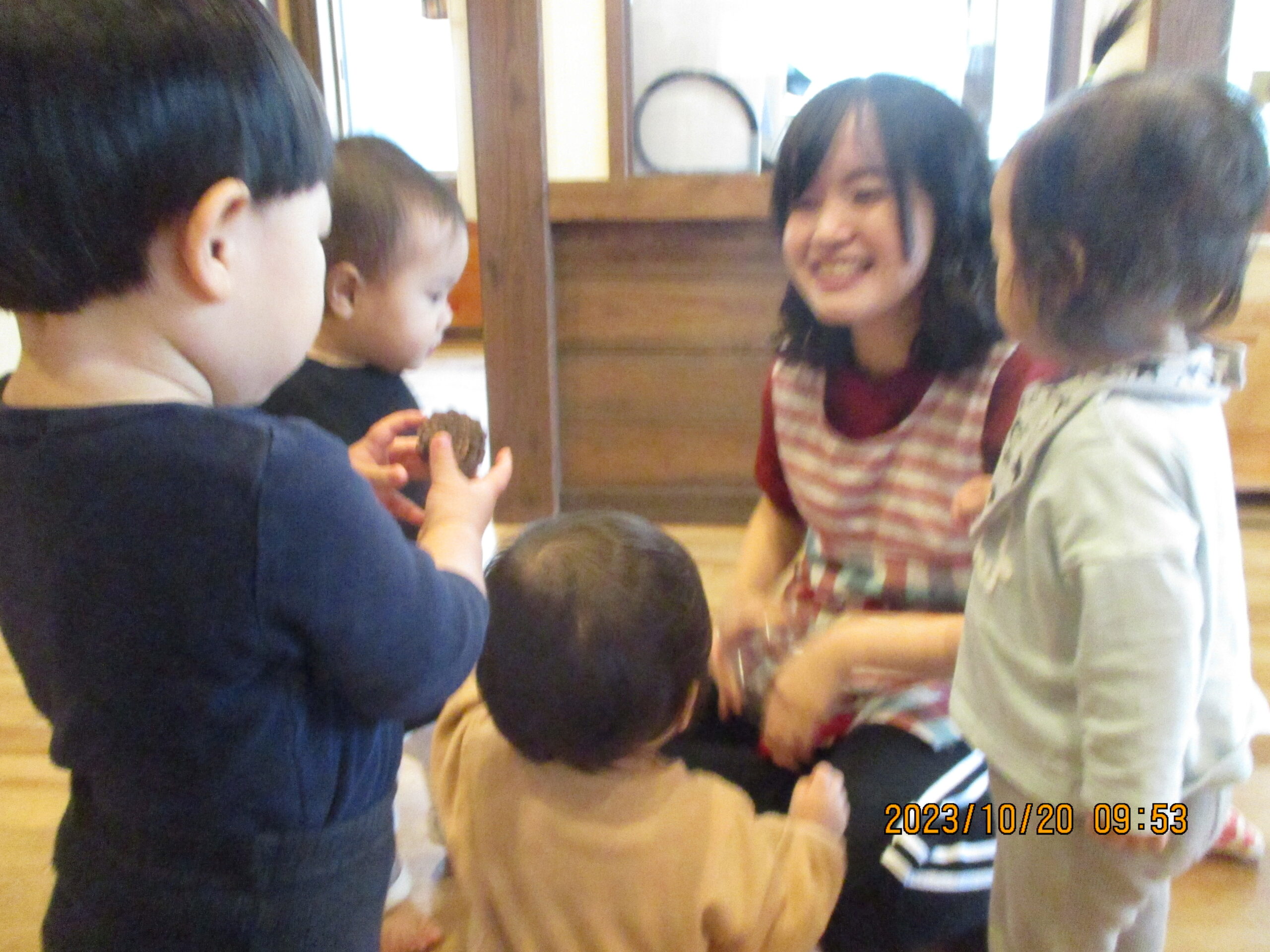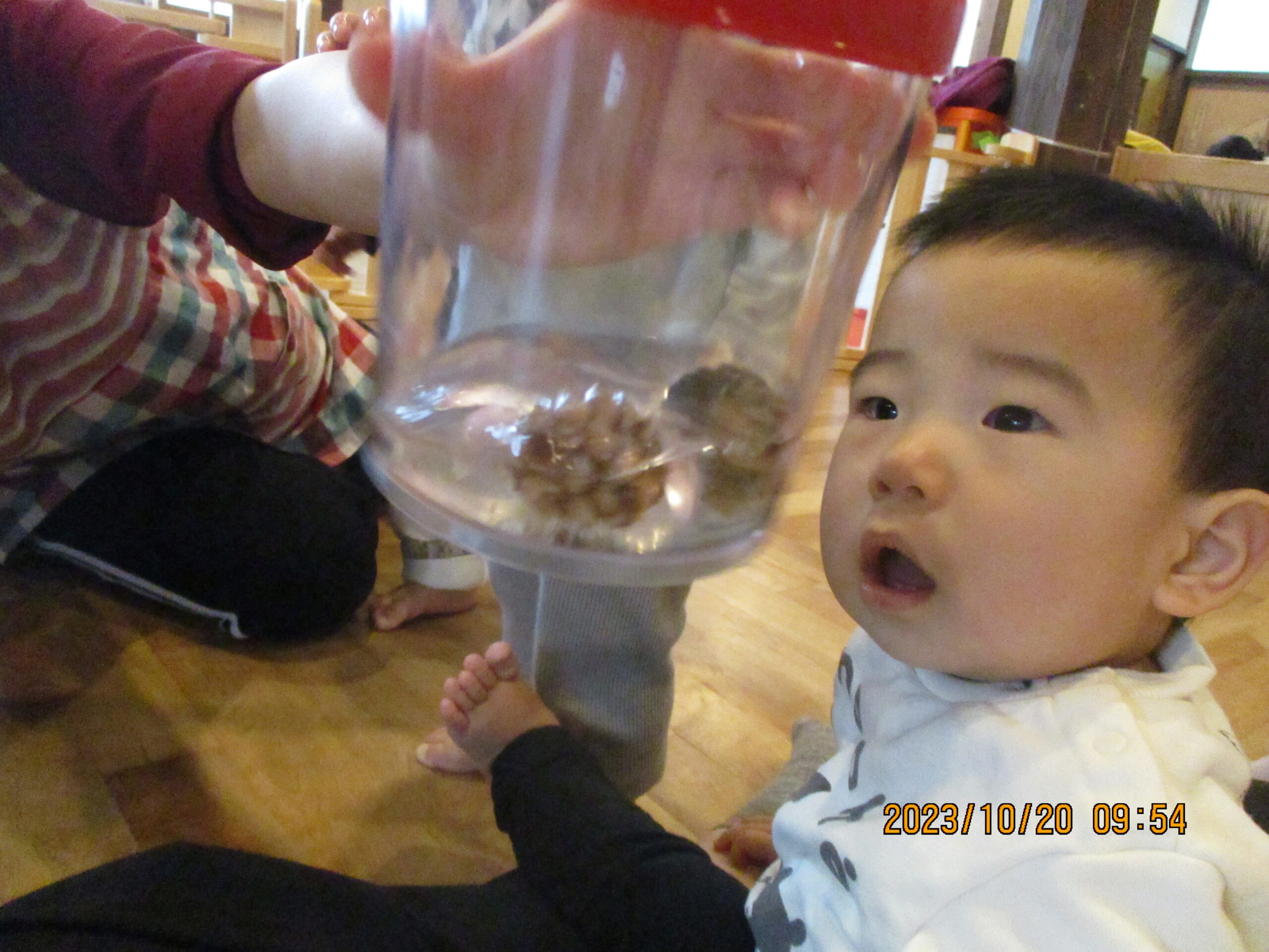 乾いた松ぼっくりを水に入れると、かさが閉じて小さくなるという実験中です。どんぐり組の子ども達にとっては“何をしているの!?”となるかもしれませんが、興味はもってくれています。