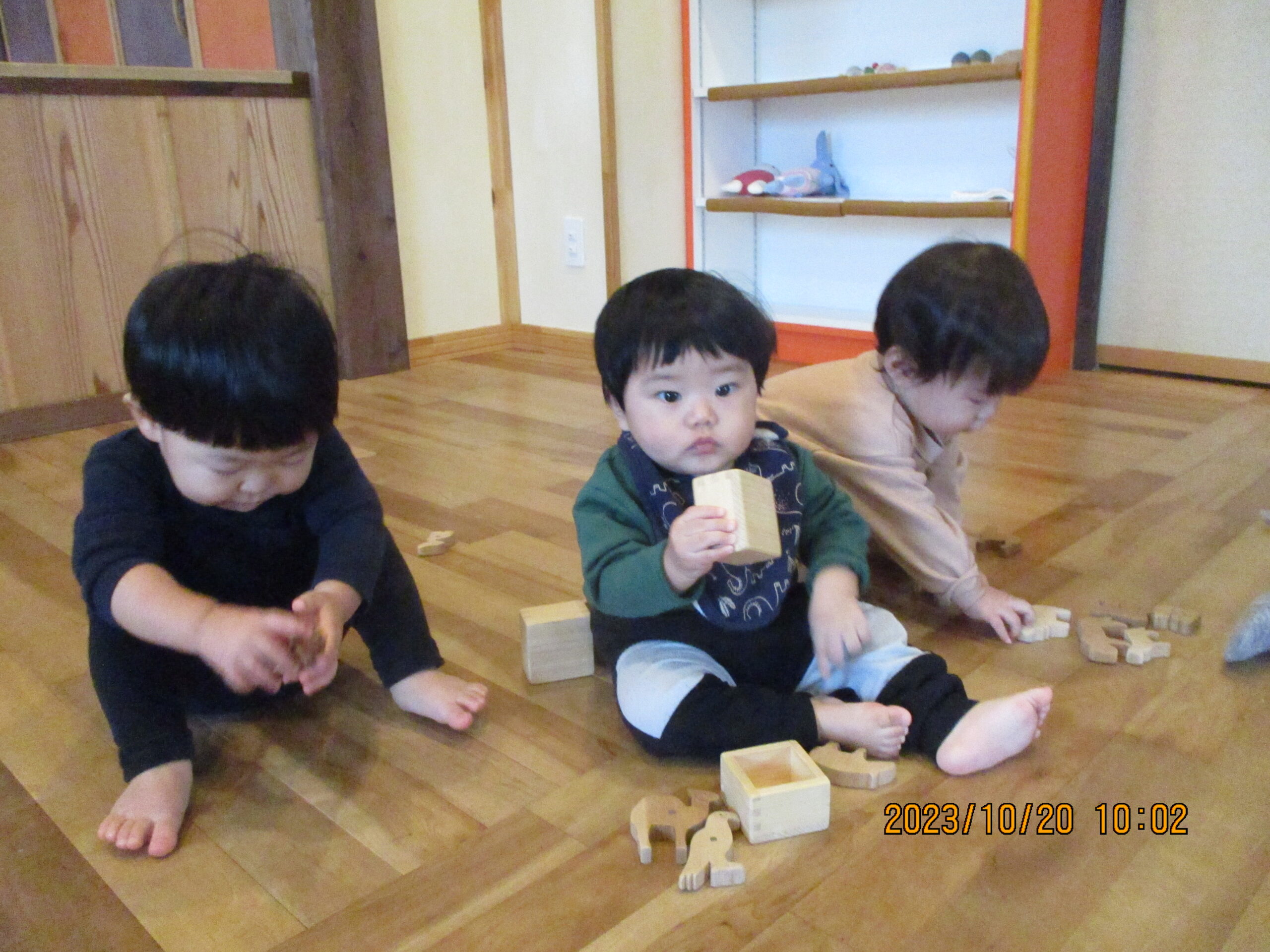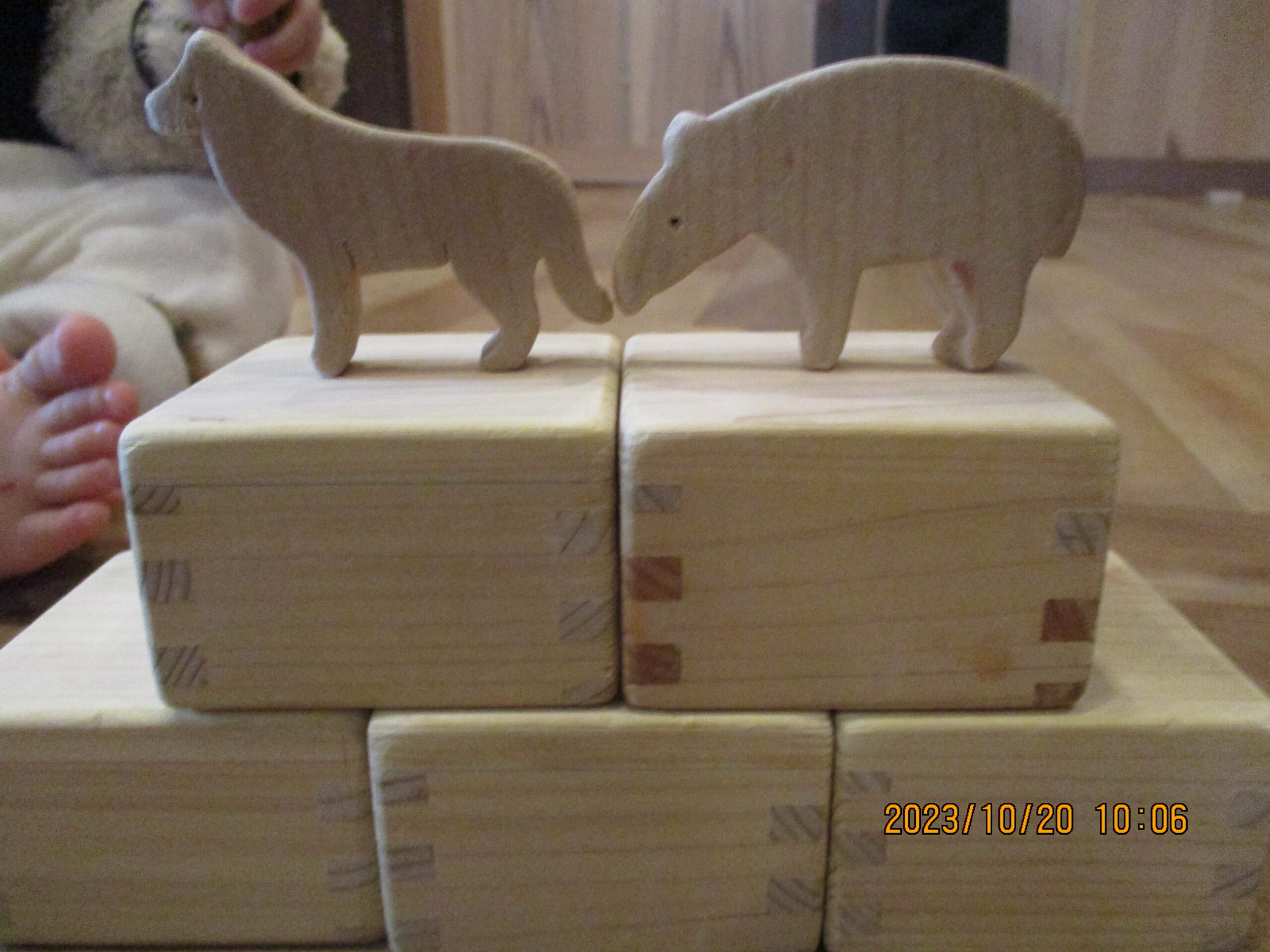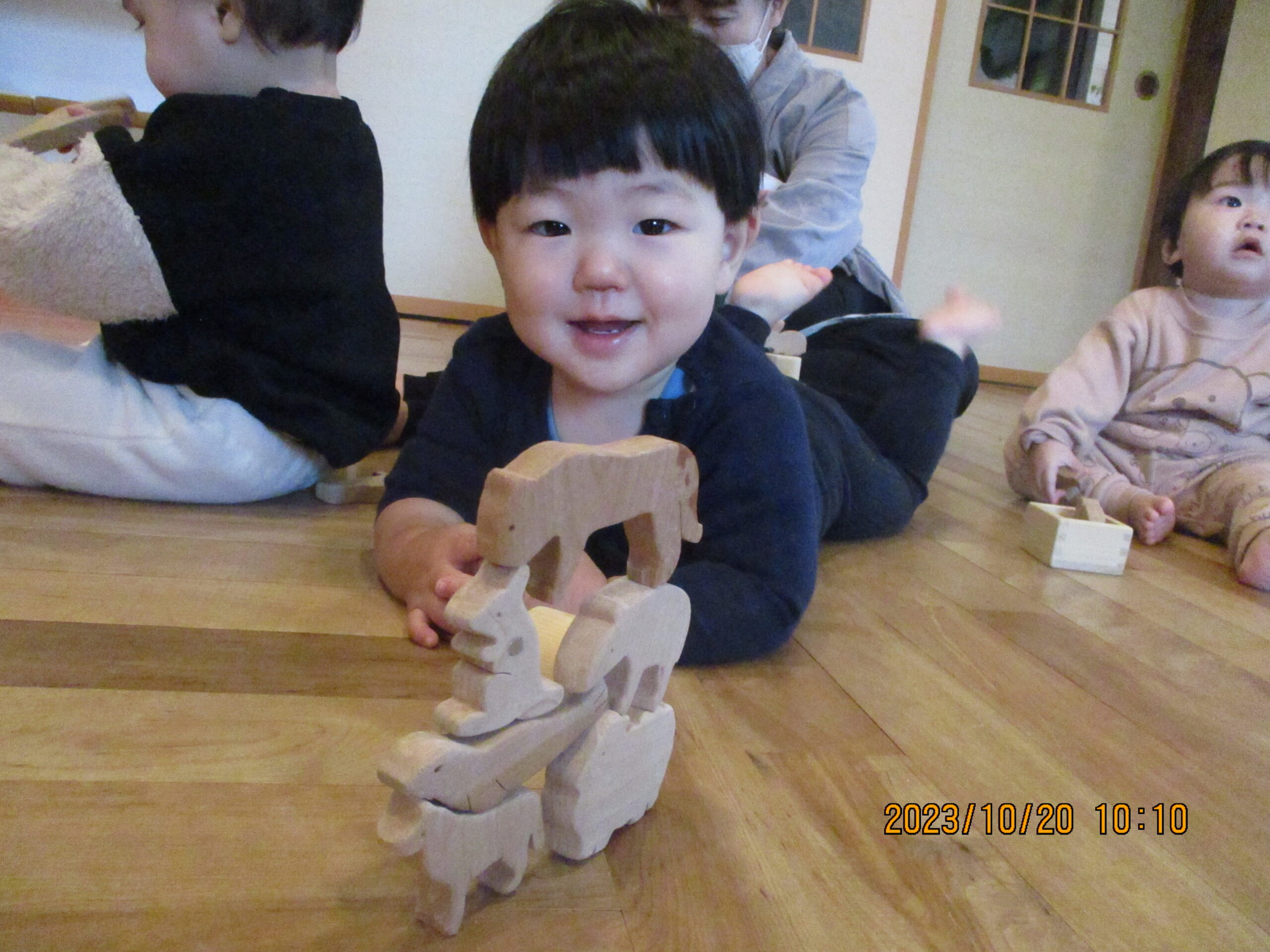 こちらは、職員が積んだ動物積み木を眺めています。動物を「どうぞ!」と渡してお手伝いをしてくれましたよ。