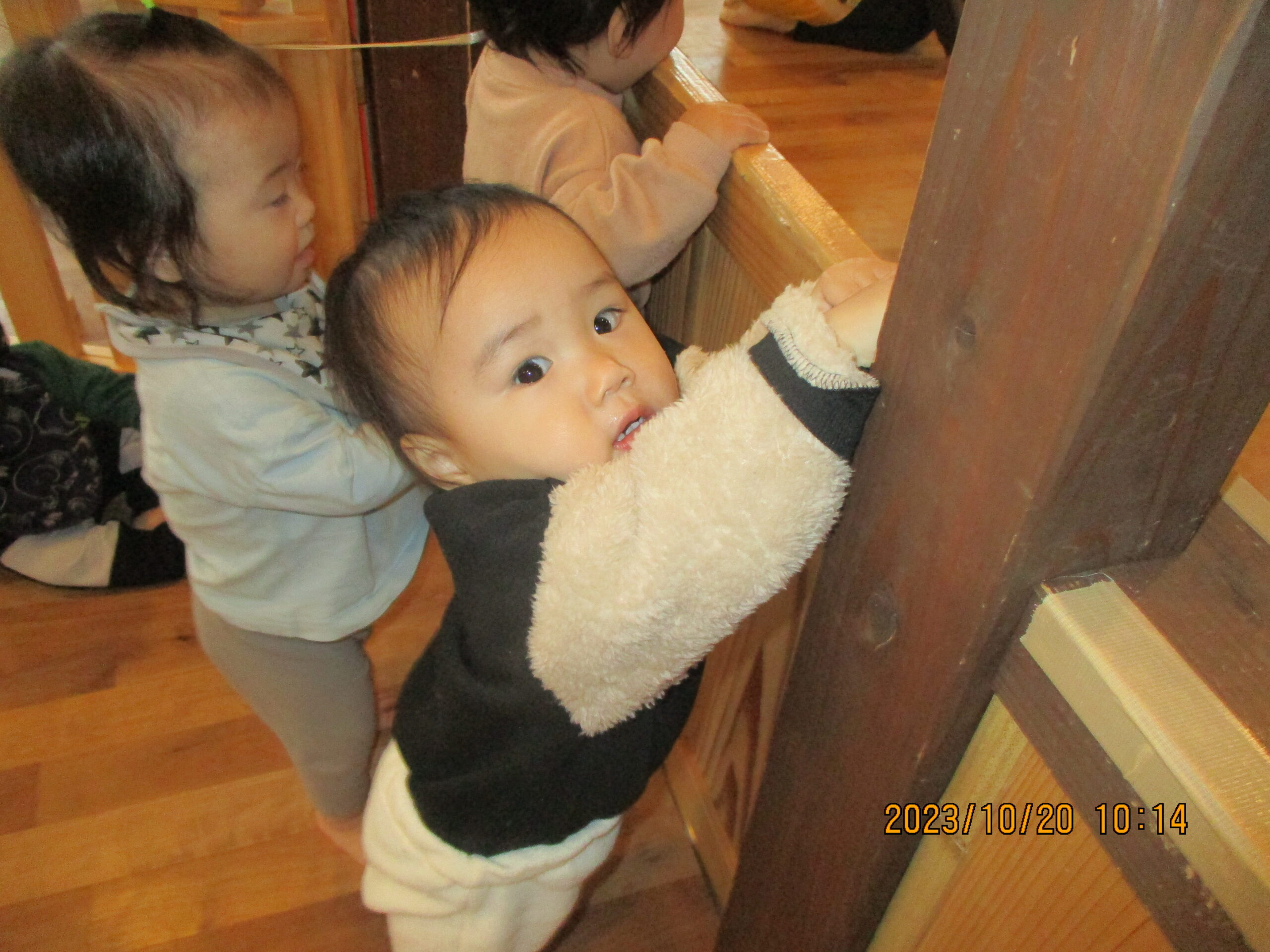 升は、動物が入るにはちょうどいい大きさで、中に入っている動物を見つけて喜んでいました!最後の写真は隣りの部屋をのぞく子ども達です。すっかり背が伸びて見える景色も変わった気がします。
