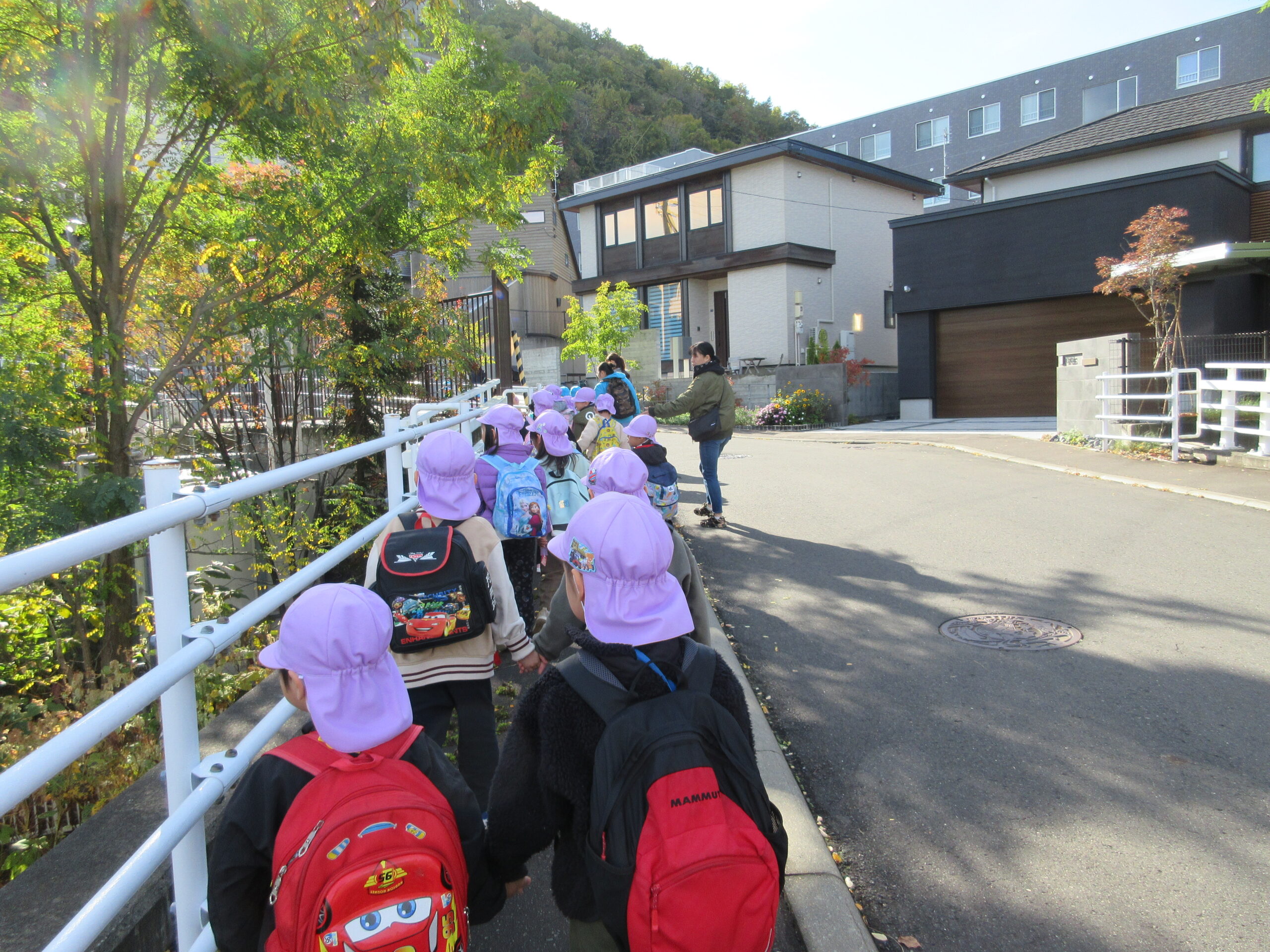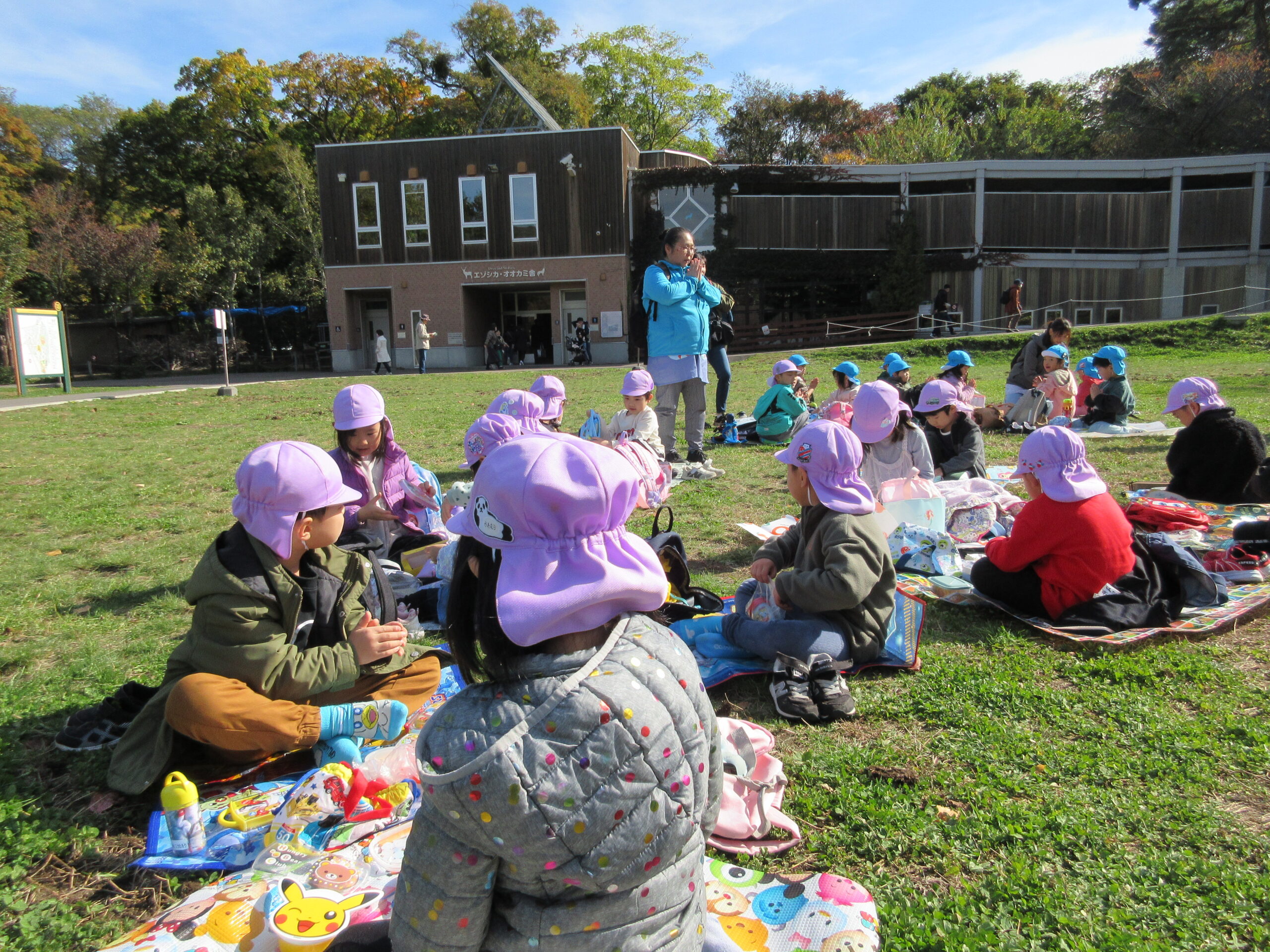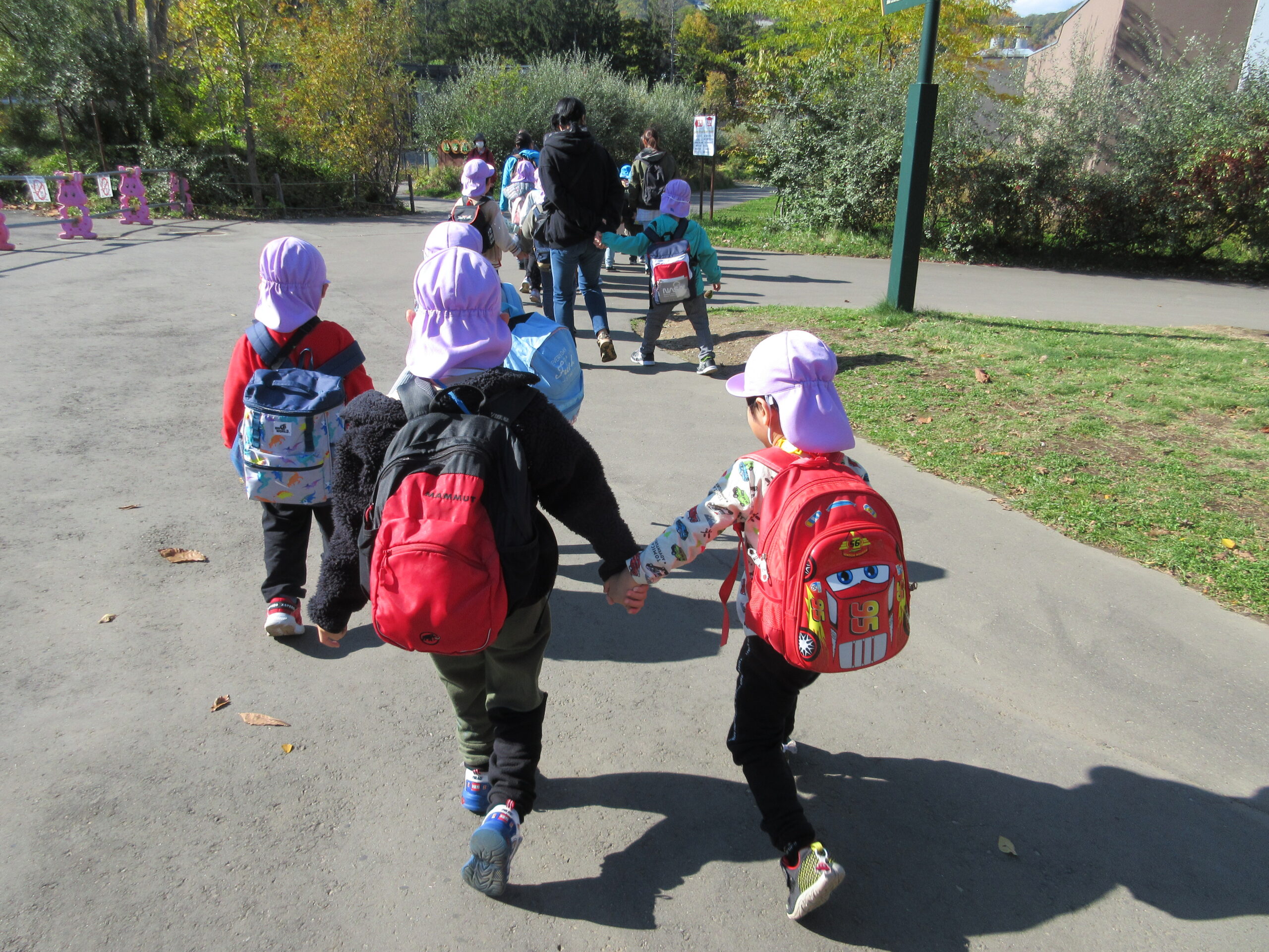 秋晴れの下、かえで・さくら組のお友だちで遠足に行ってきました!<br /> 宮の森保育園のお友だちも一緒です。😊