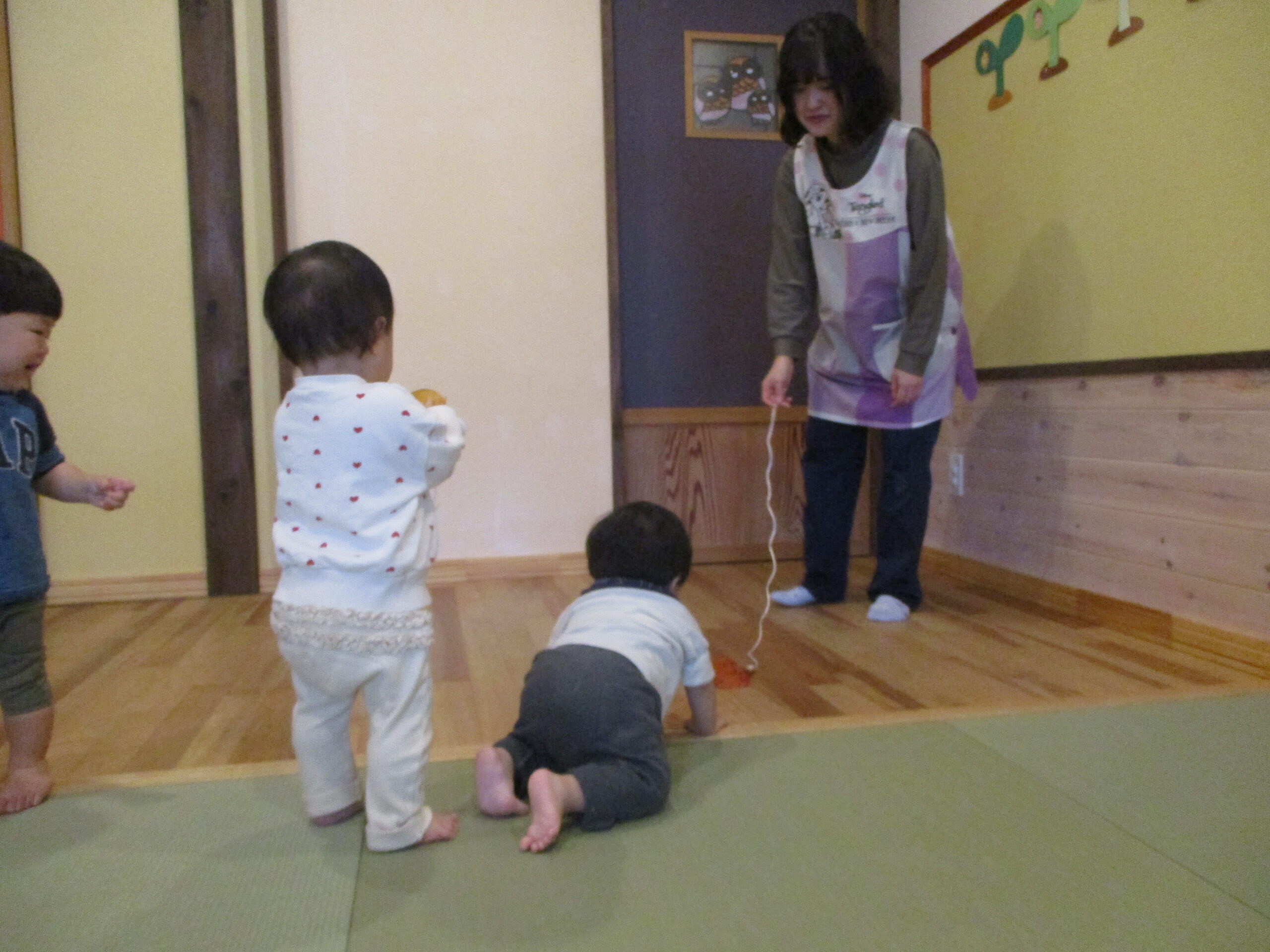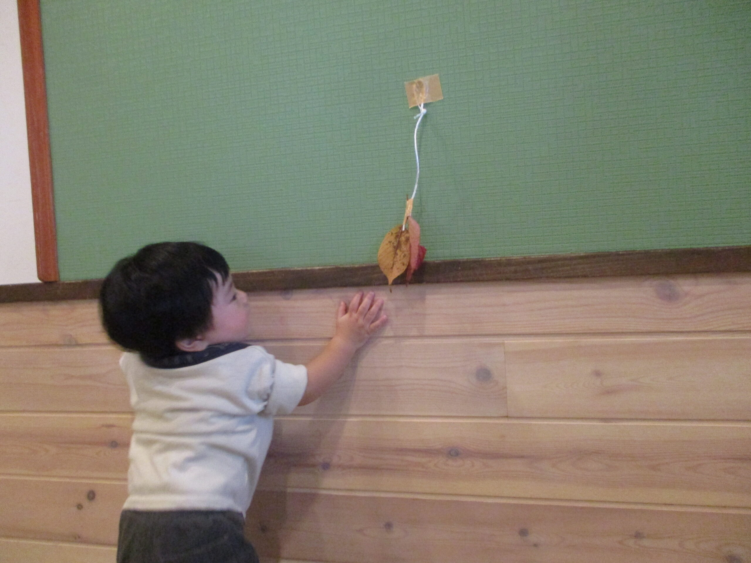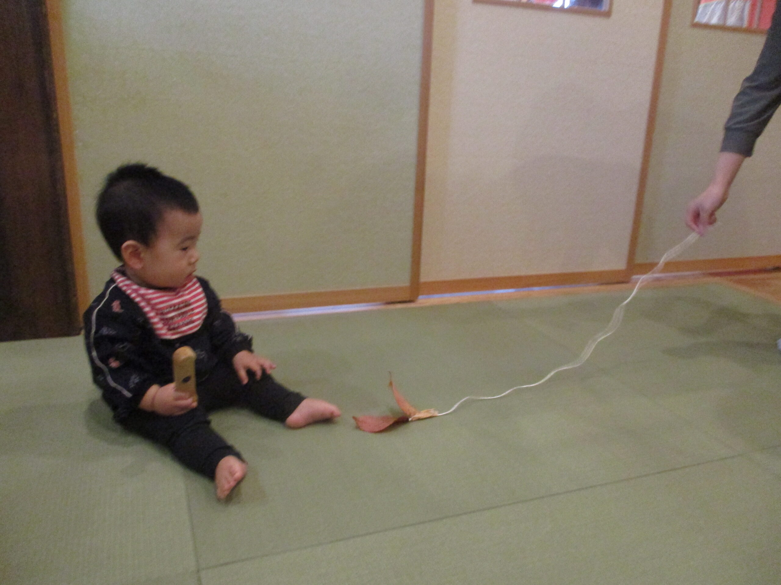 ひもに葉をくっ付けて保育士が動かすと、子ども達は葉の行方を視線で追いかけます。