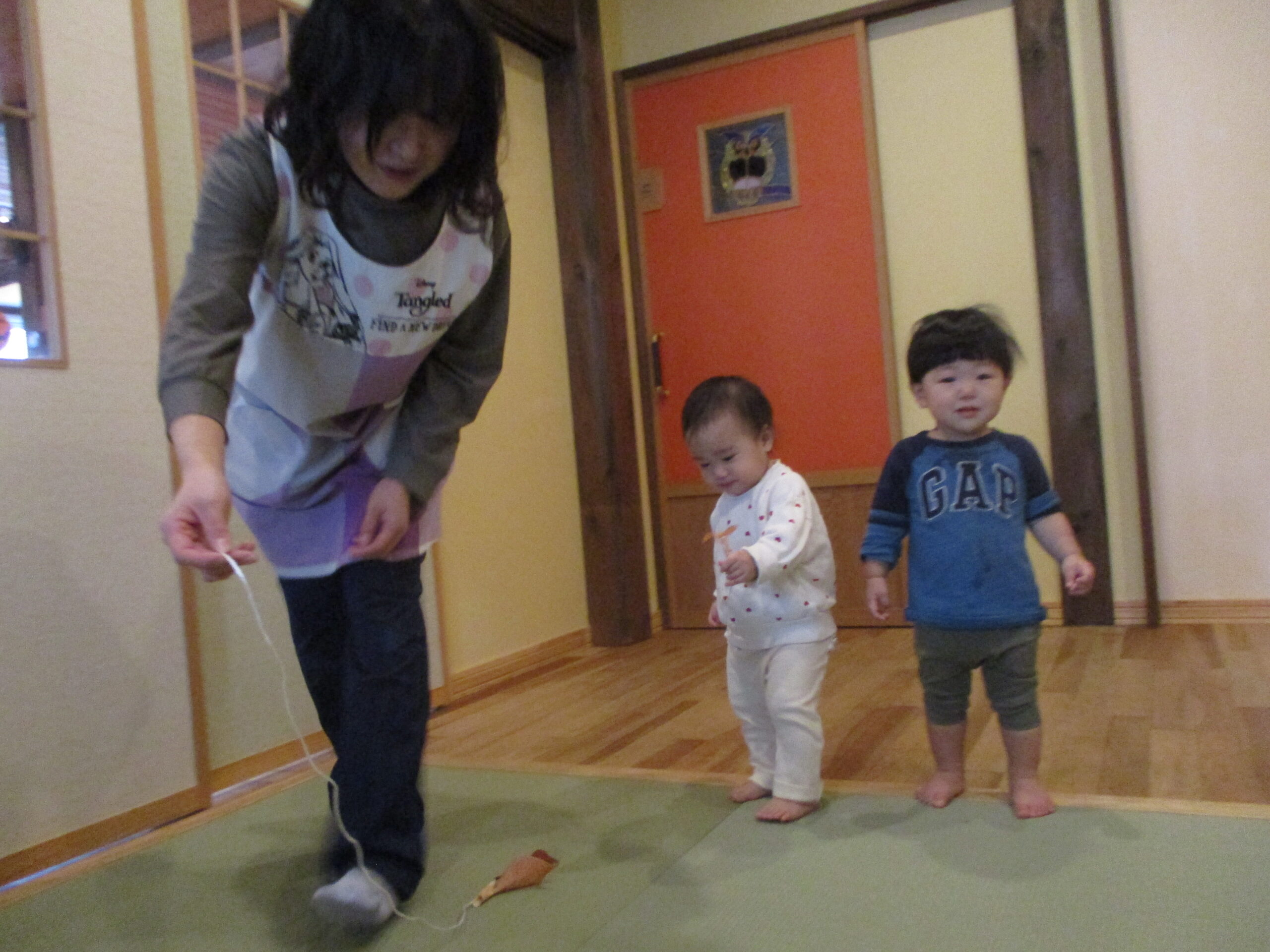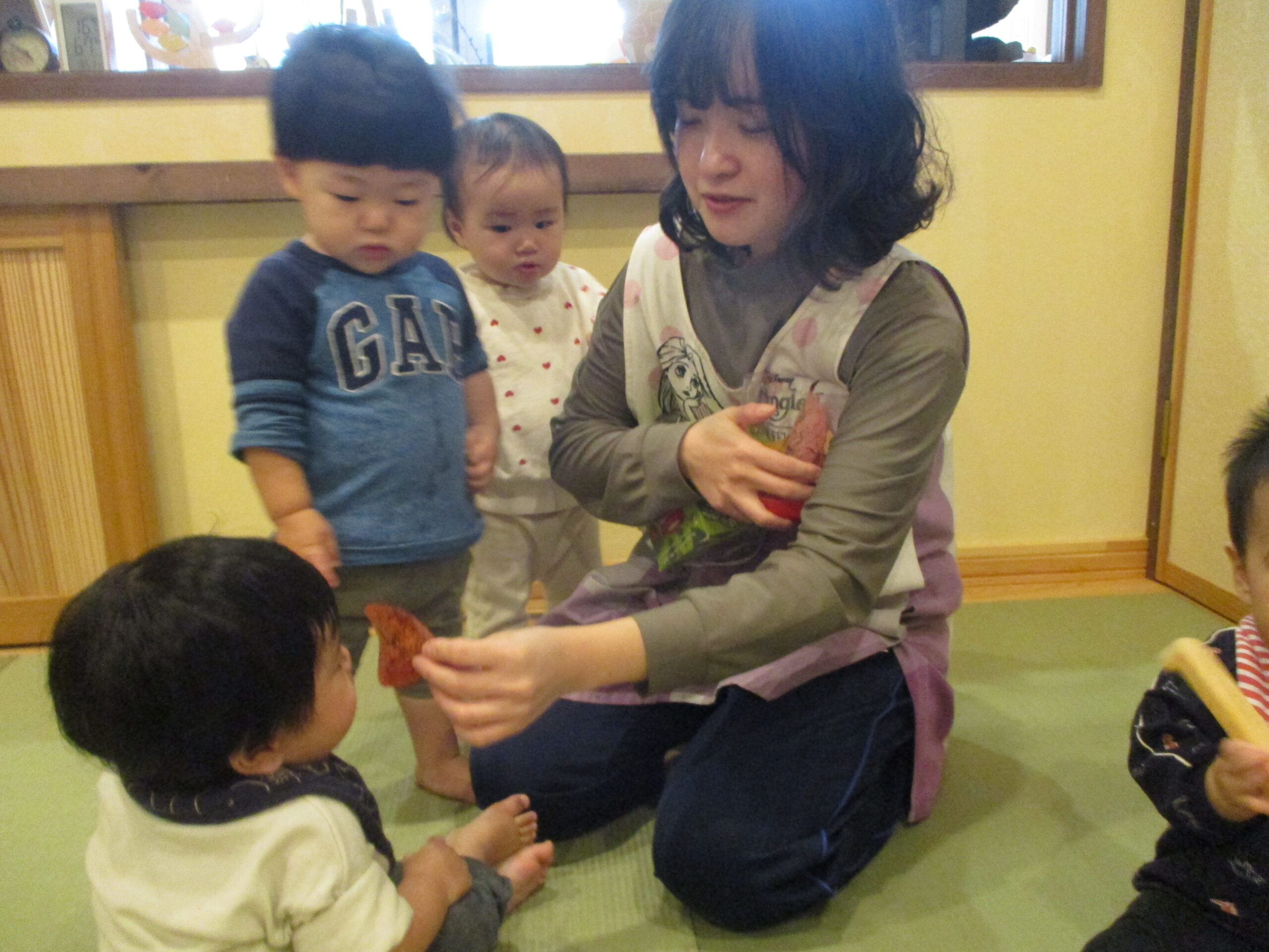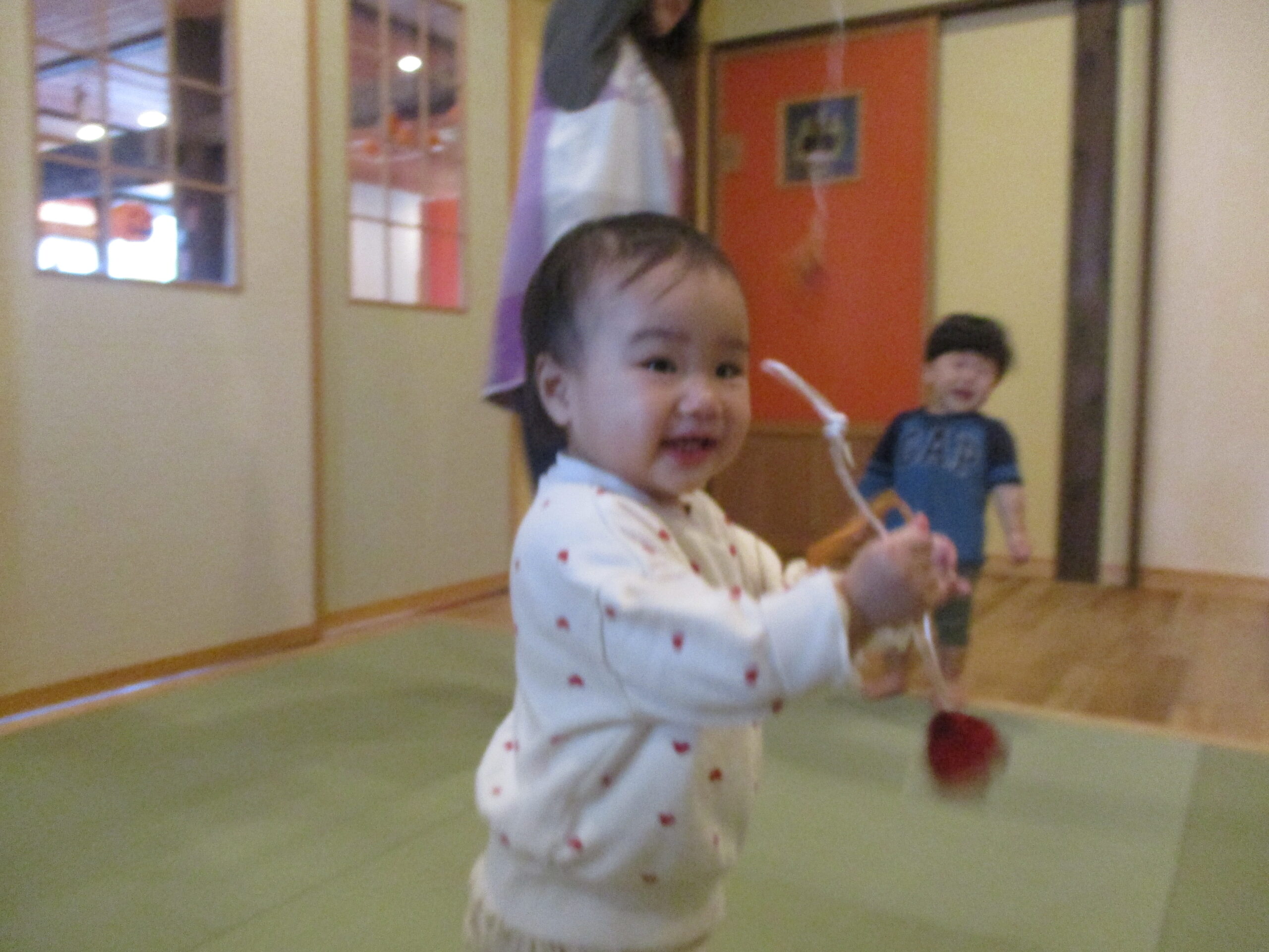 ひもに葉をくっ付けて保育士が動かすと、子ども達は葉の行方を視線で追いかけます。