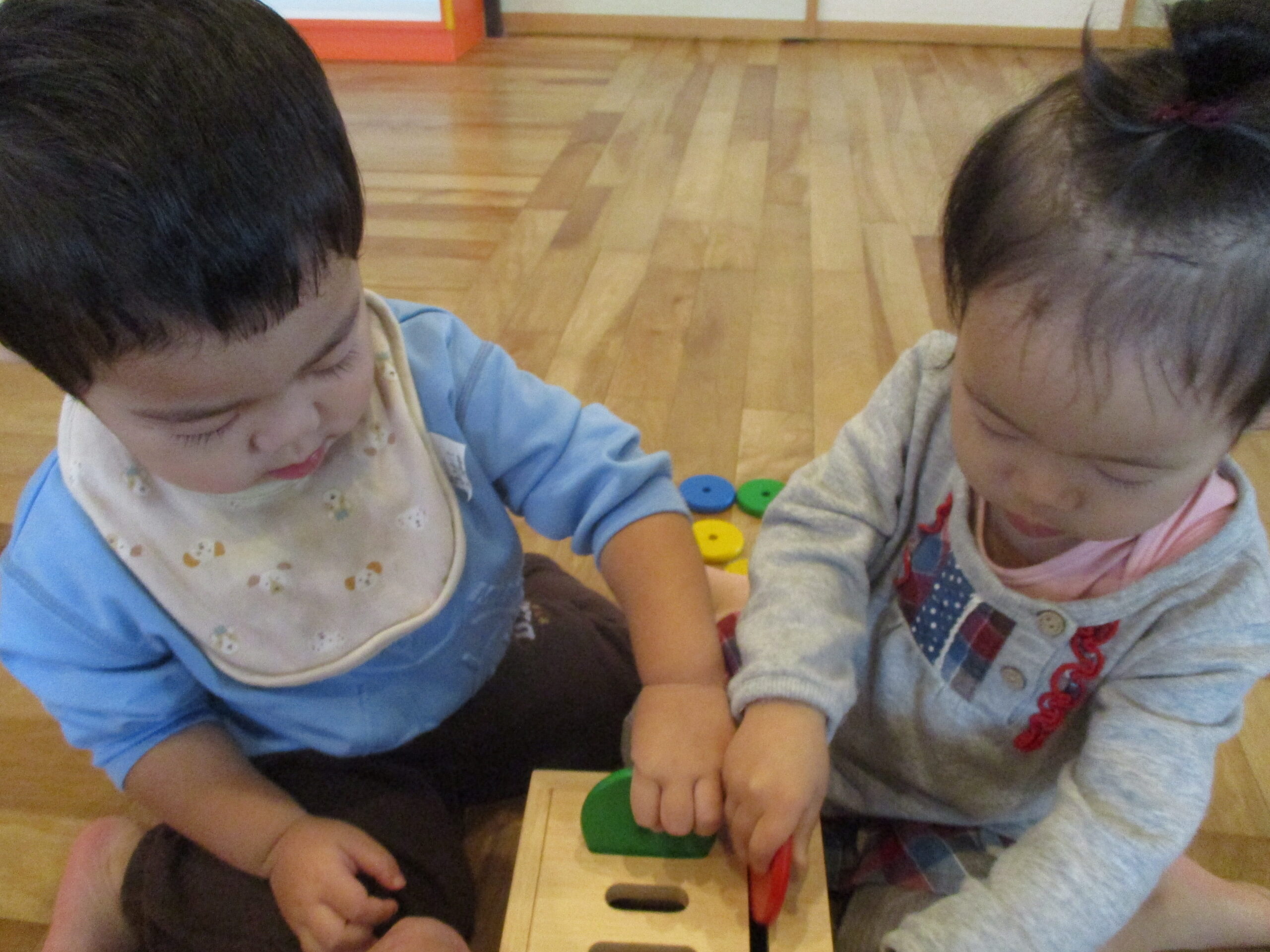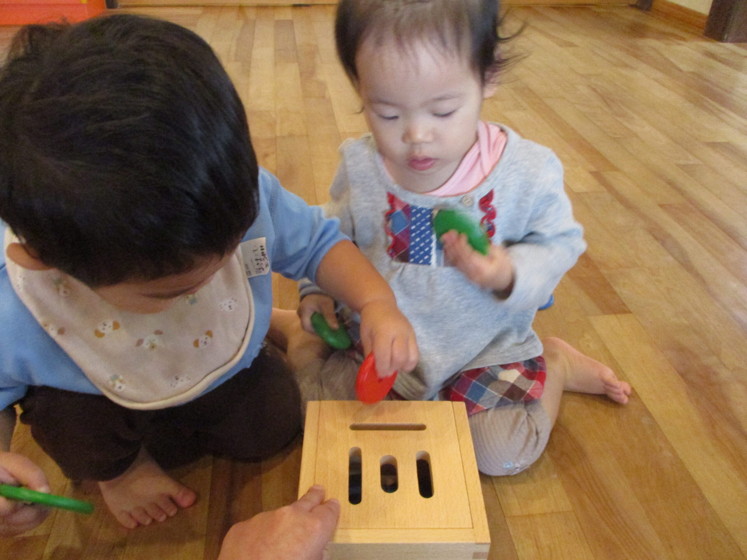 ポットン落としでは、どこにはいるかなぁと探している子ども達。入る場所を見つけるとニコッと嬉しそうに笑っている姿が見られました。
