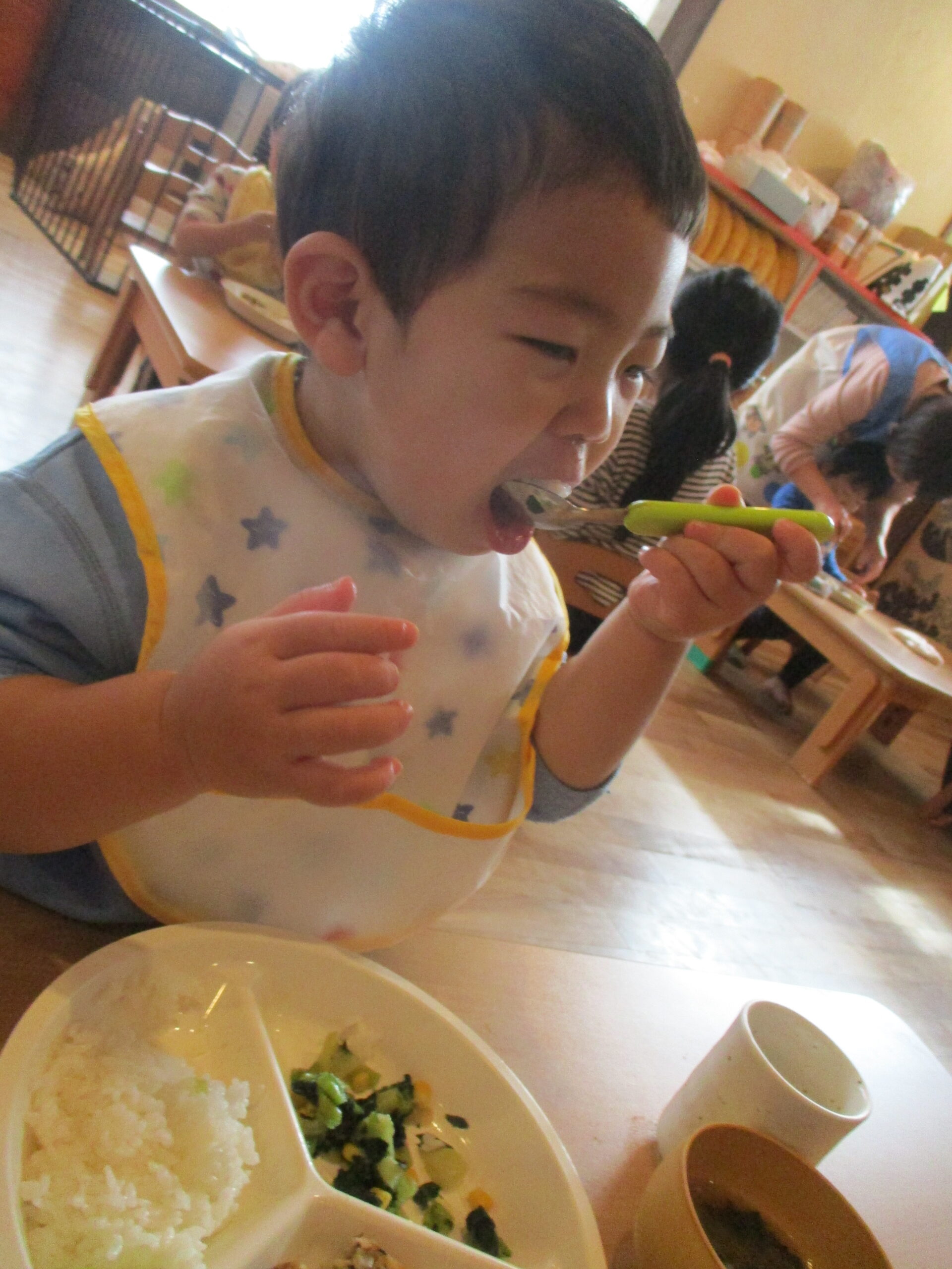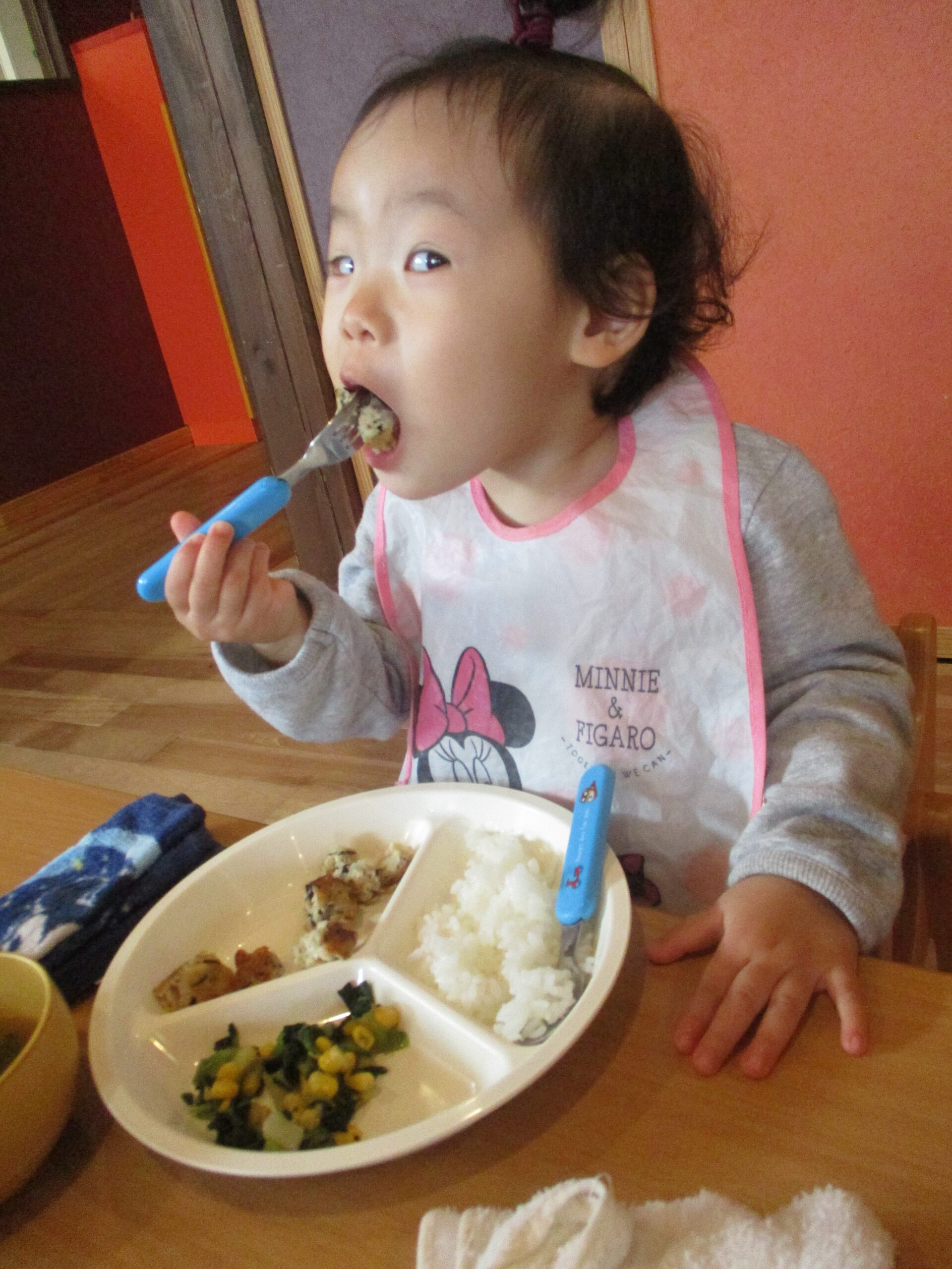 遊び終わった後は給食の時間♪スプーン、フォークを使う練習をしているくり組さん。上手に食べている様子が見られました。たくさん食べましたよ♪