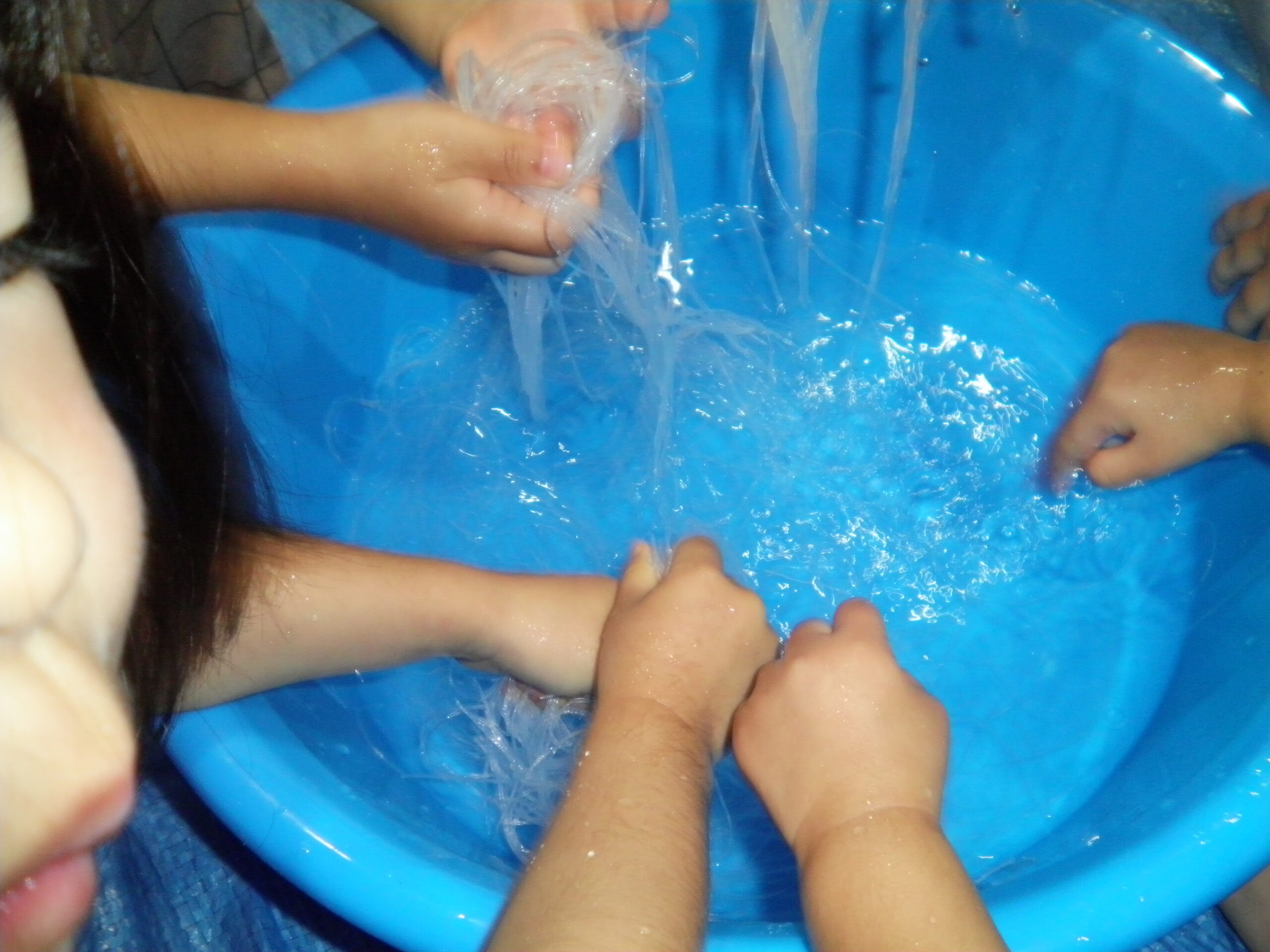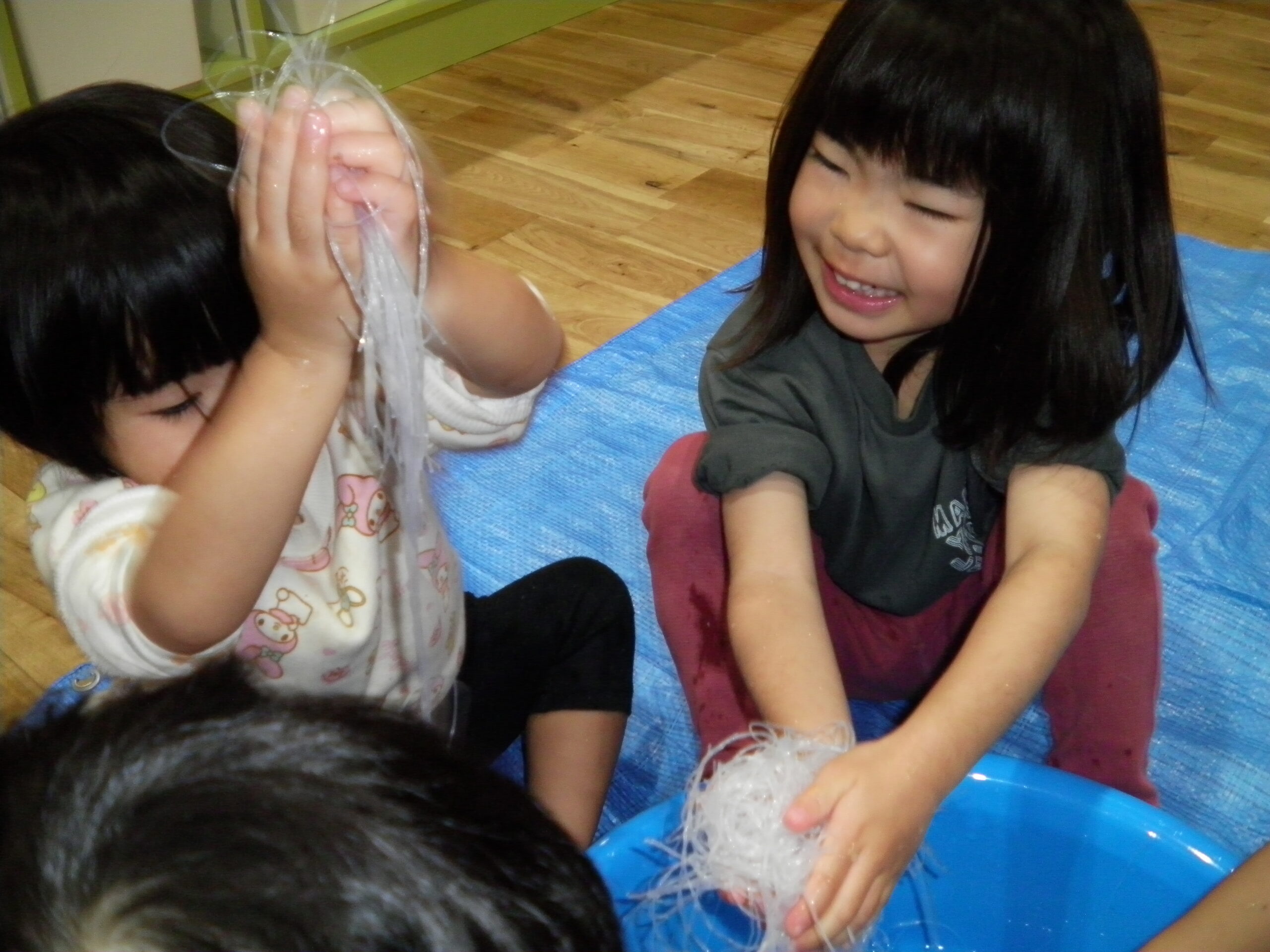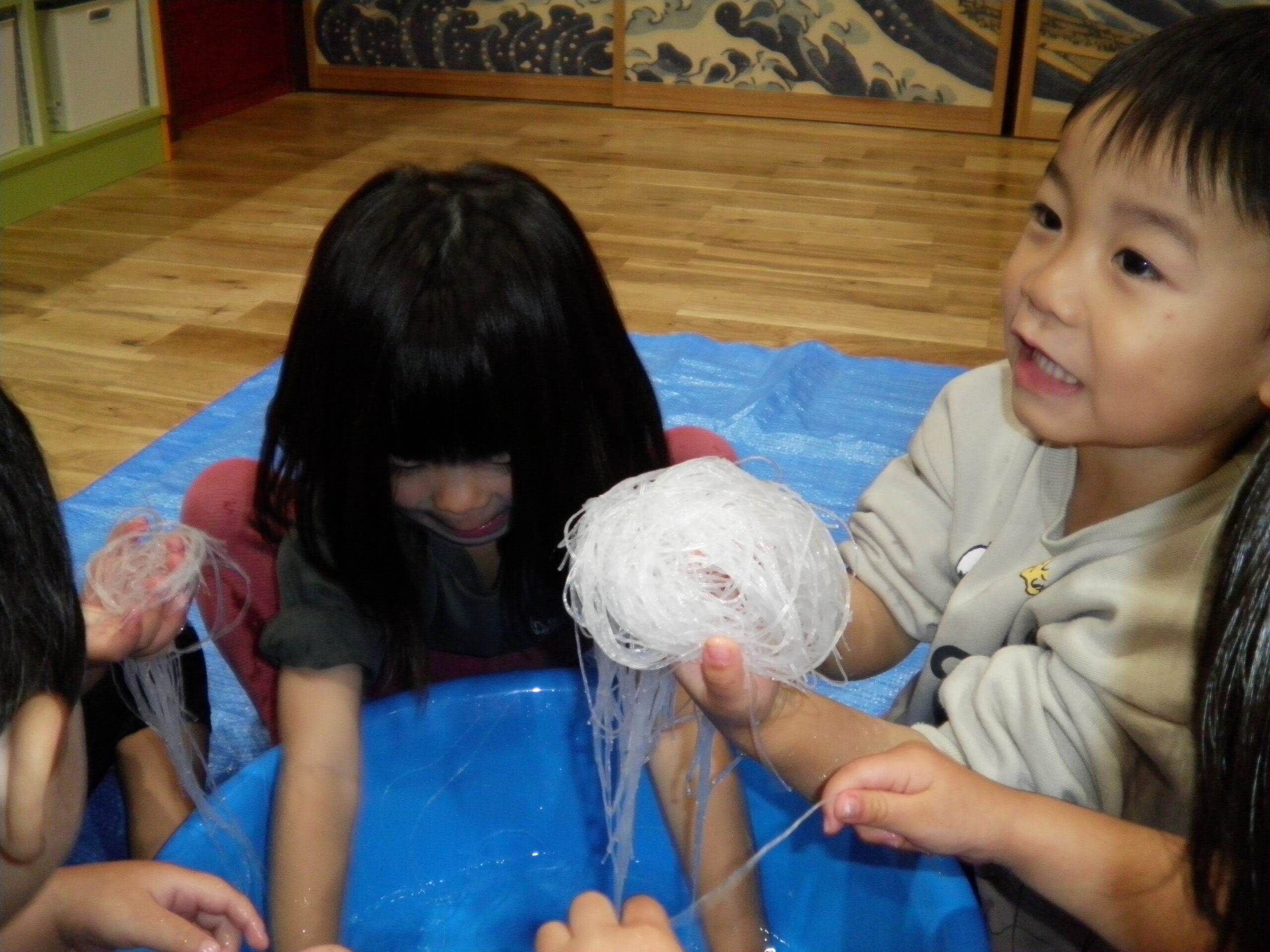 くるみさんとくりさんは春雨を触って、感触遊び