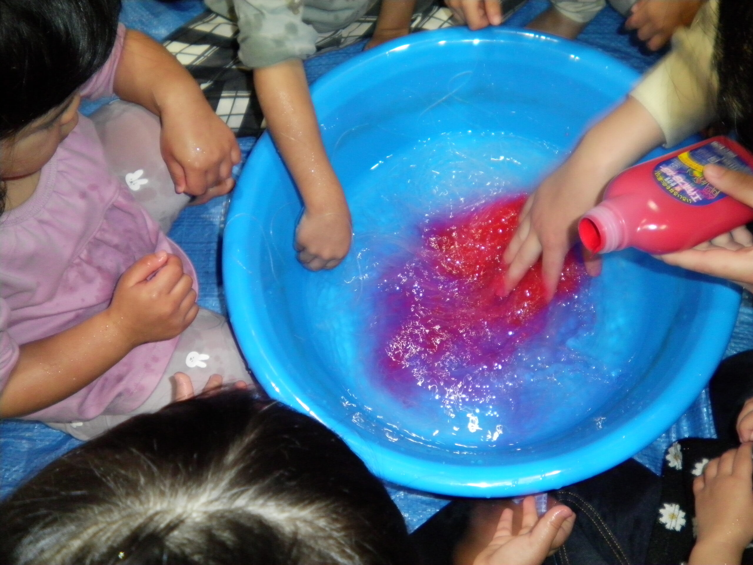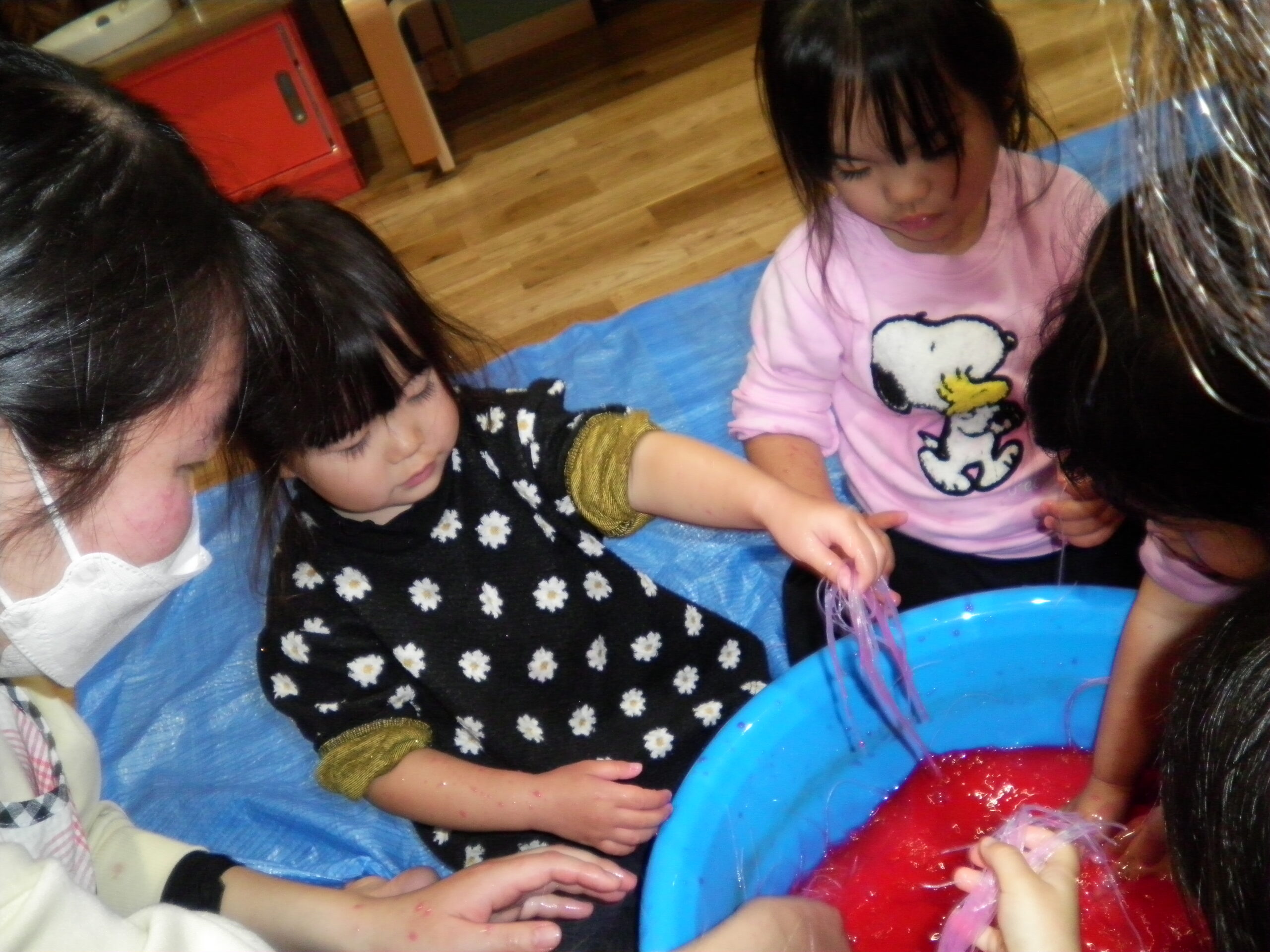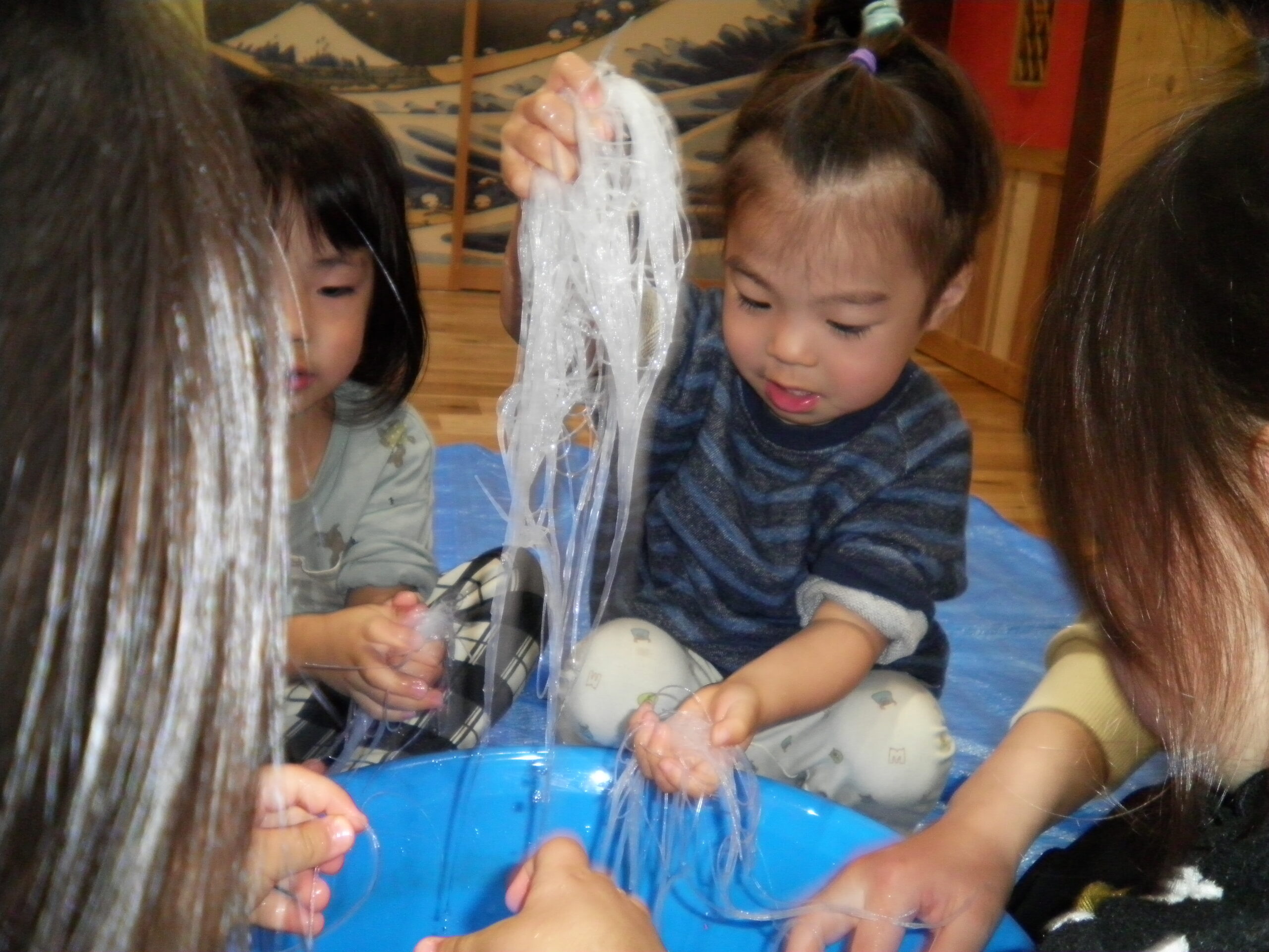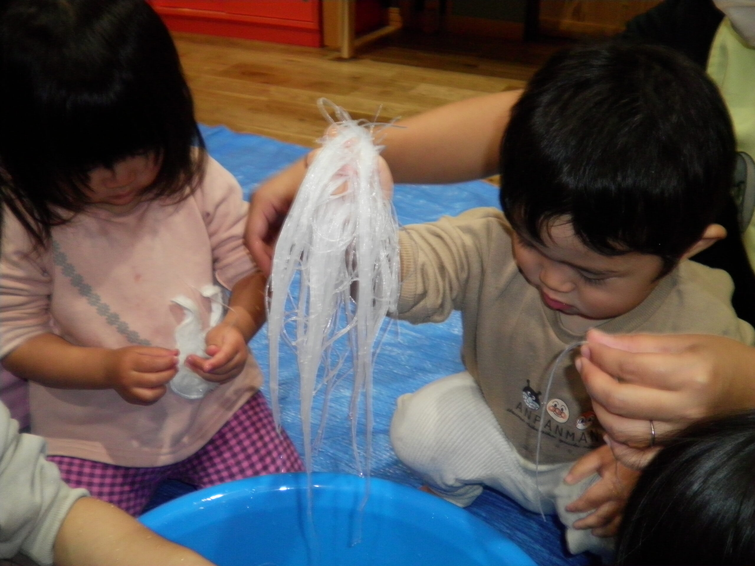 くるみさんとくりさんは春雨を触って、感触遊び