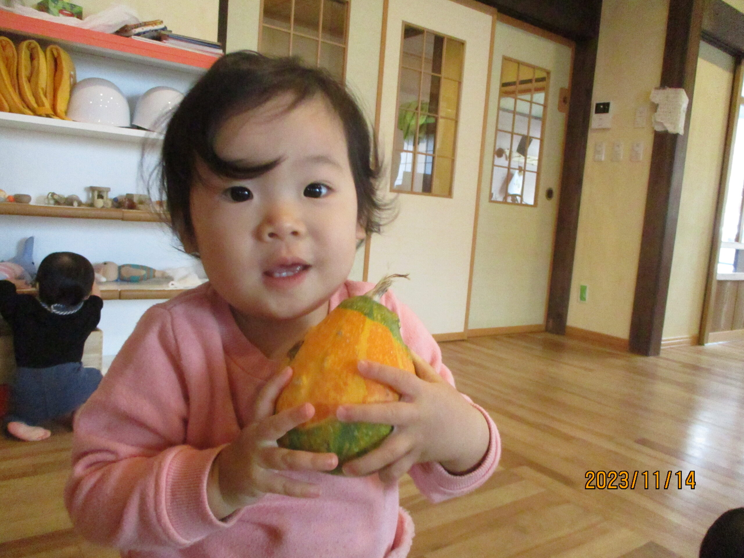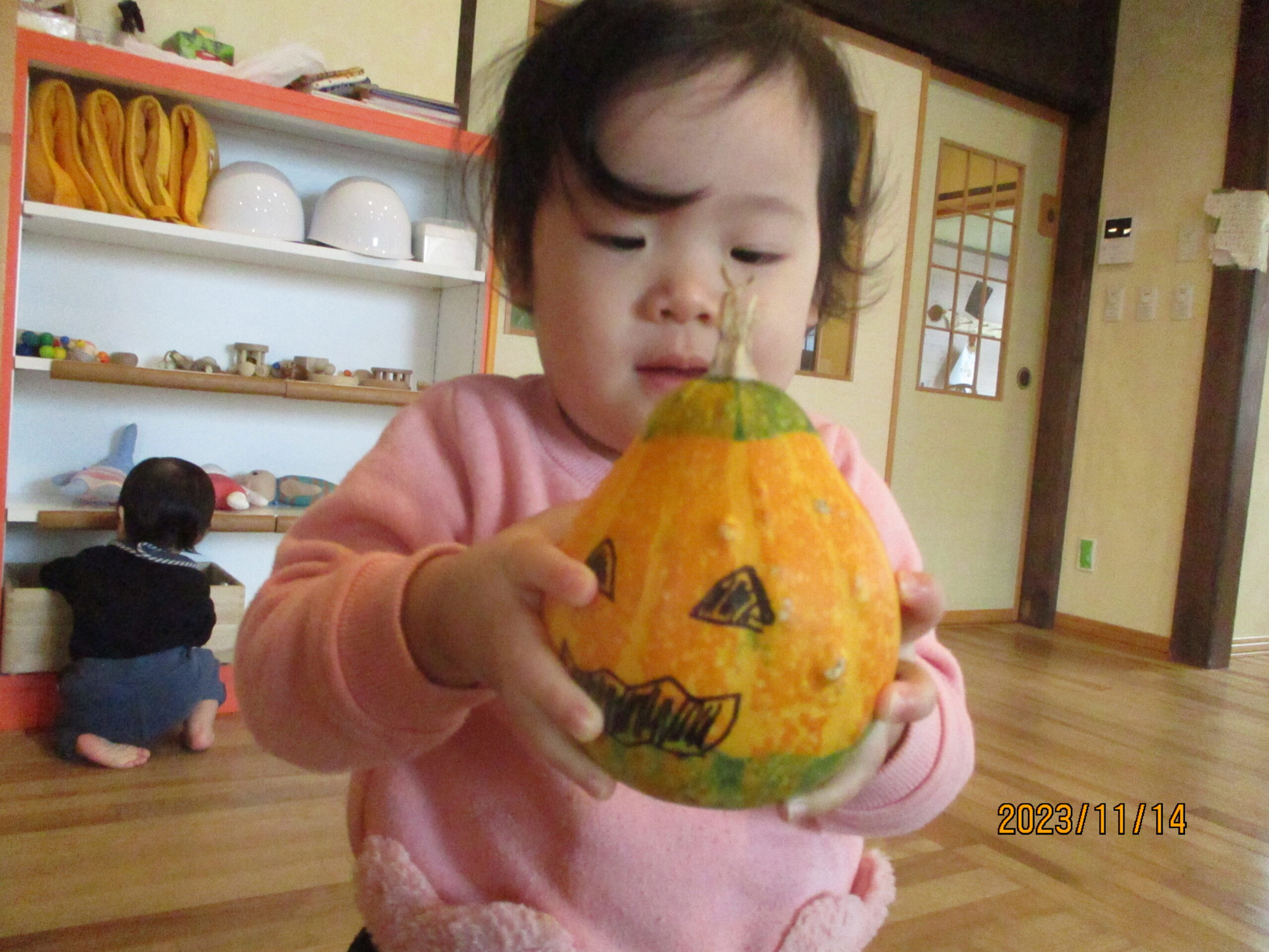 こちらでは、カボチャに夢中の子どもがいます。ぎゅっと抱きしめています♪