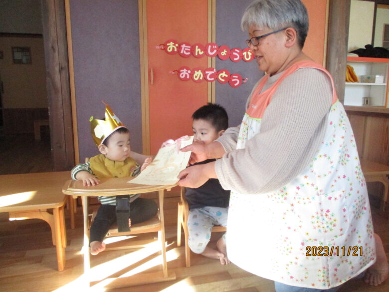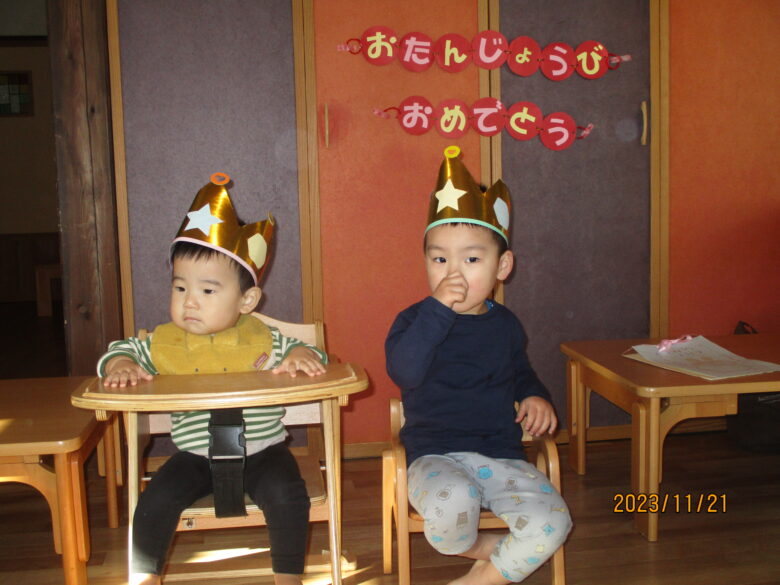 今日は11月のお誕生会をしました。今月は4名の友達がお誕生日を迎えています。2名での参加でしたが、今日いなかったお友達も登園したらお祝いしたいと思います。
