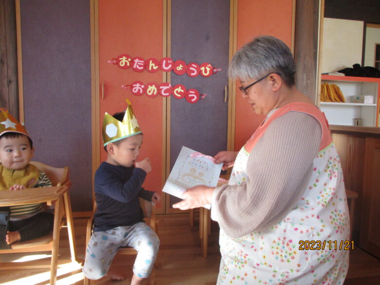 お誕生日カードをもらい、嬉しそうな表情ですね。みんなから“ハッピバースデイ♪”の歌をプレゼントしてもらう楽しい日でした。