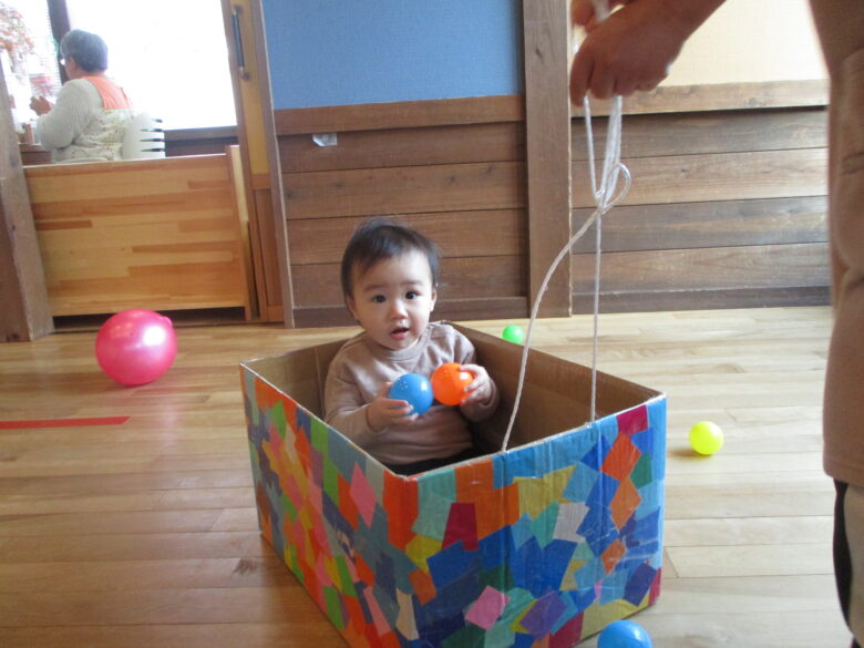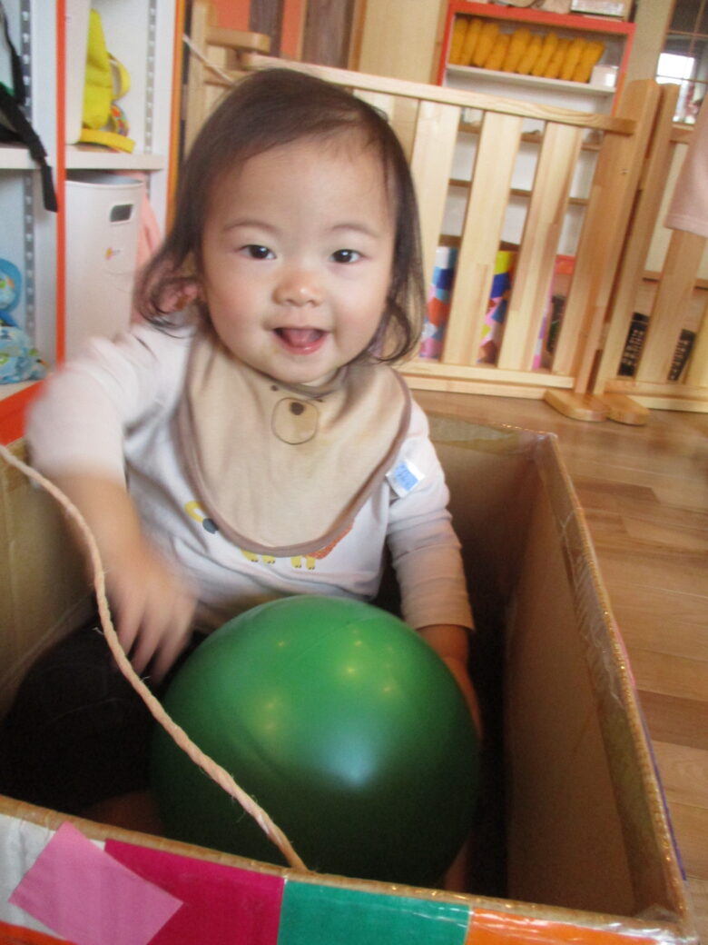 今日のどんぐり組の活動はボールや段ボールの車で遊びました。ボールを出した瞬間ニコニコ笑顔で見せてくれました♪