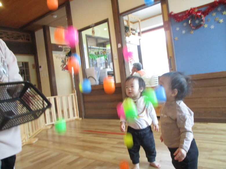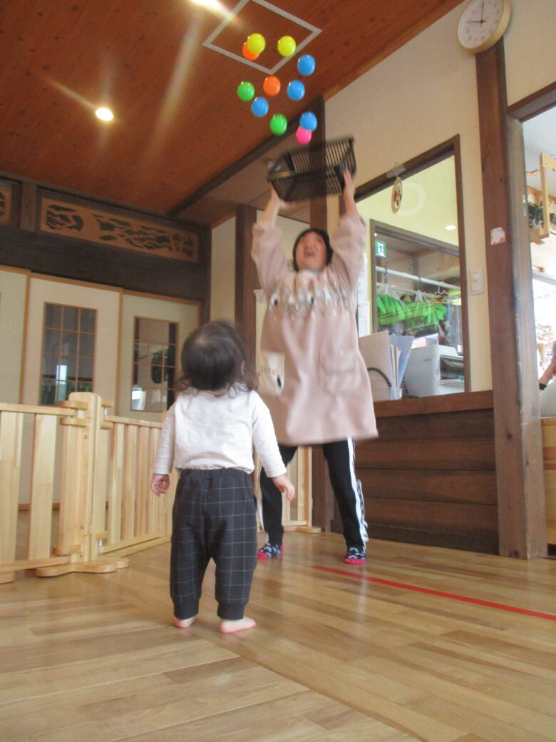 保育士がボールをカゴに入れ上から降らせると楽しい笑顔でしたよ♪