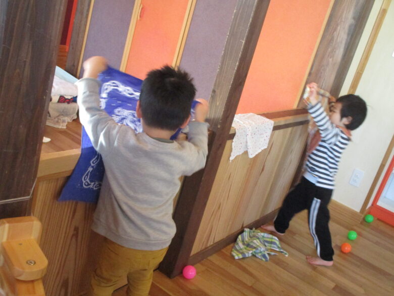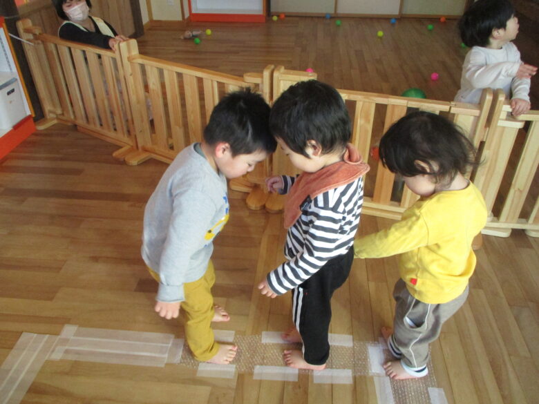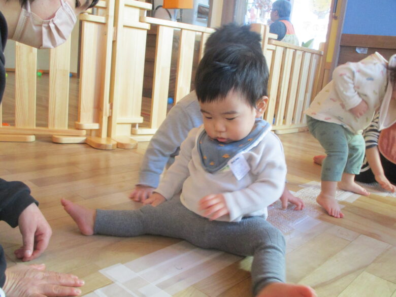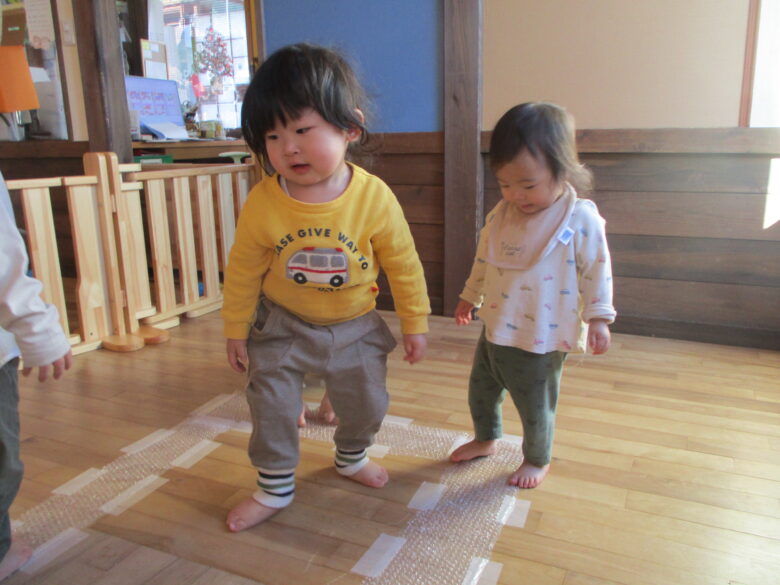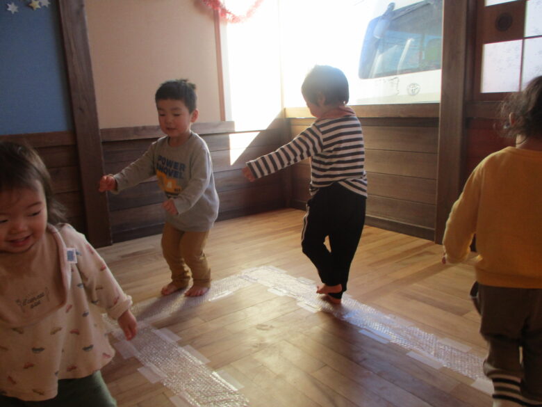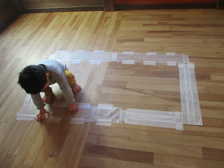 今日は、クッション材のプチプチや養生テープの粘着部分を上にして床に貼り、道にして遊びました。上を歩くと、時々“プチッ”と鳴り感触や音を楽しみましたよ。