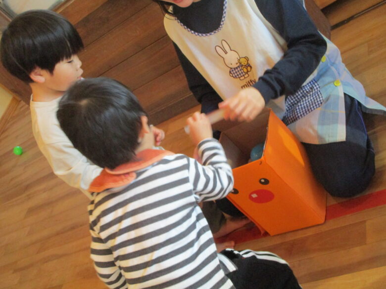 今日は、クリスマスのトナカイポストが様々なものに大変身です!まずは、ボールポストに背伸びをして頑張って入れています。子ども曰く、“お金”を入れてお買い物をしていたそうです。