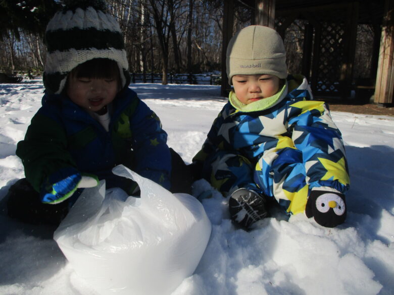 袋の中に雪を入れて固めて、ボールのようなものを作りました。