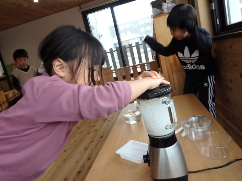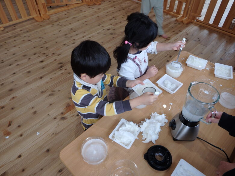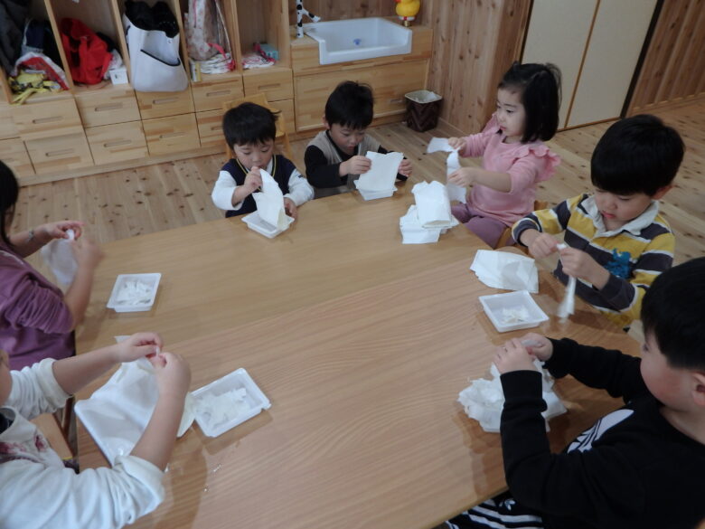 牛乳パックをちぎって・・水に溶かして・・型に入れて・・固めて・・