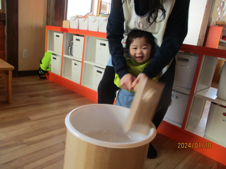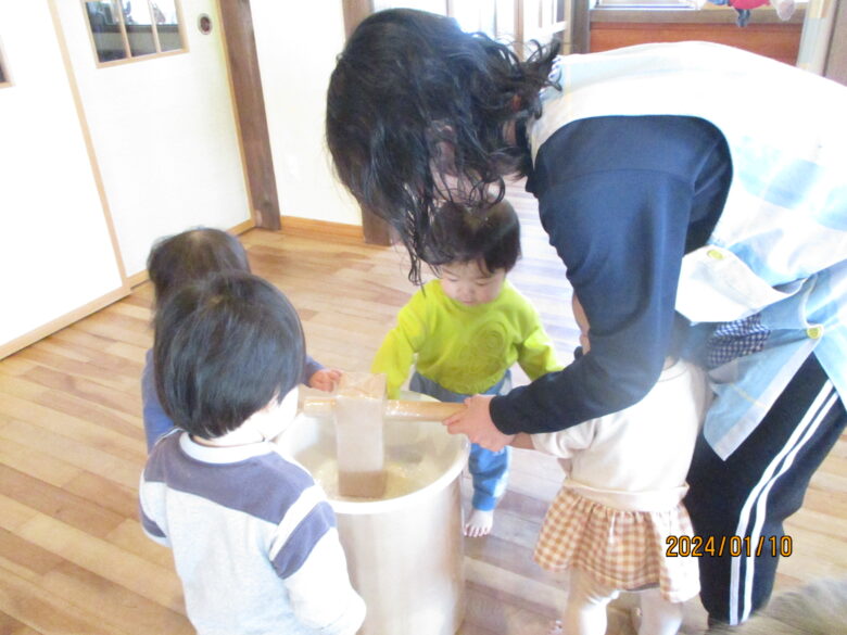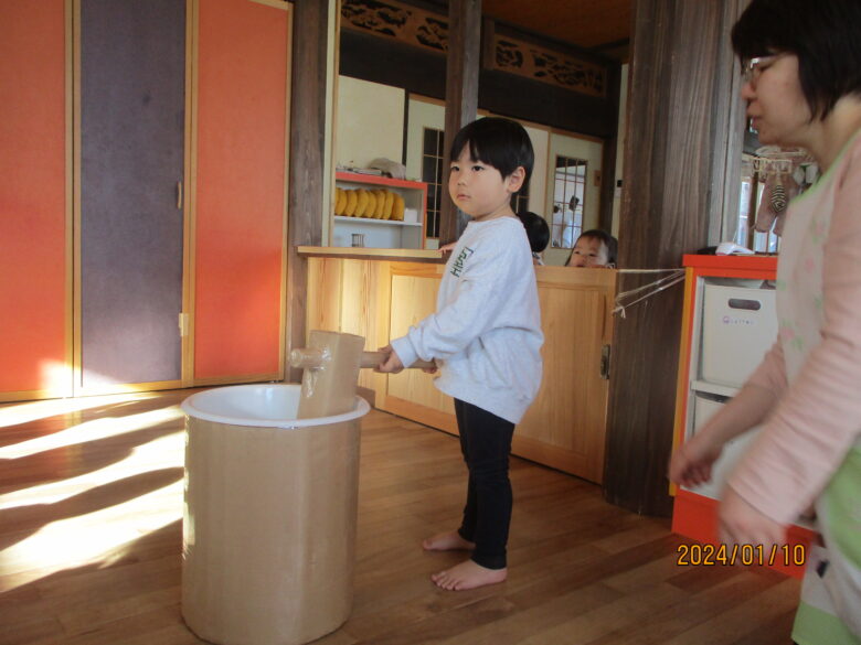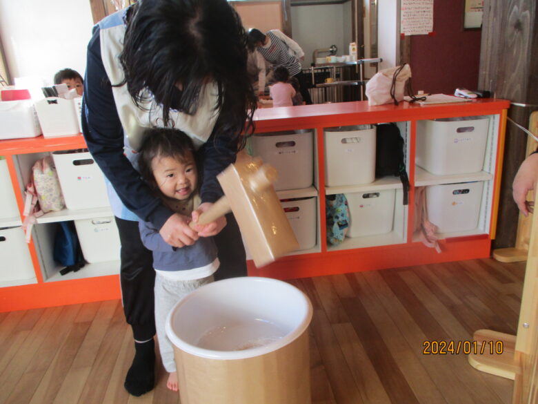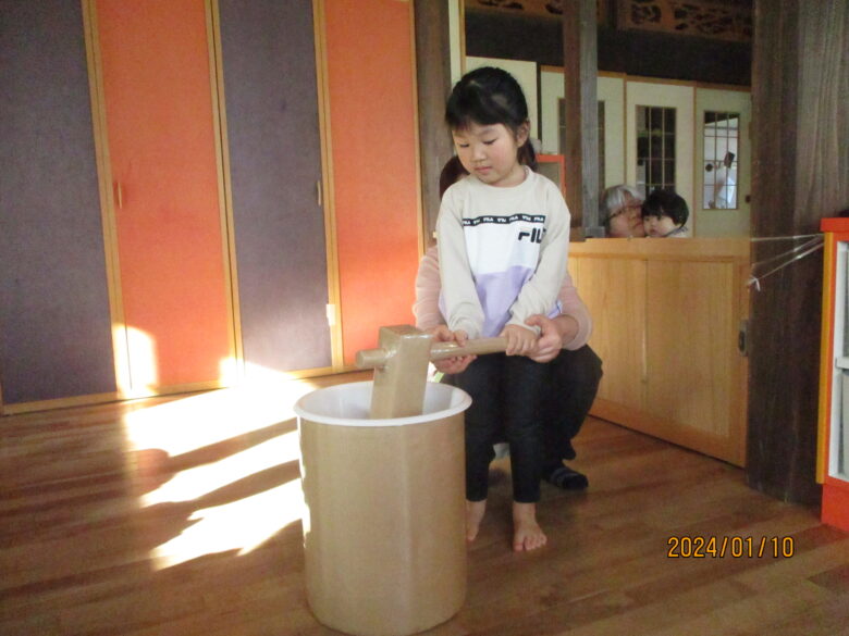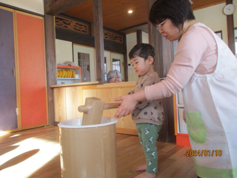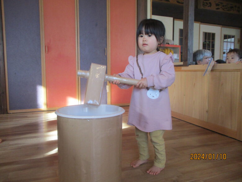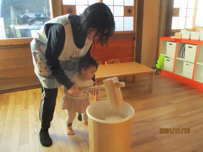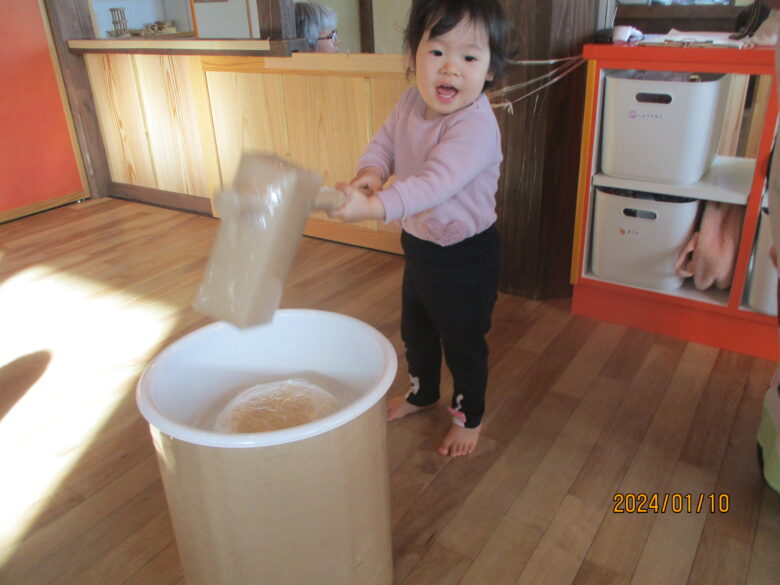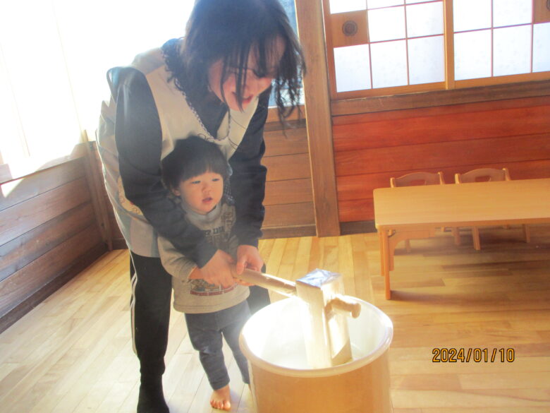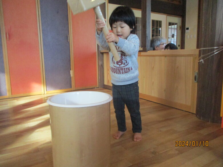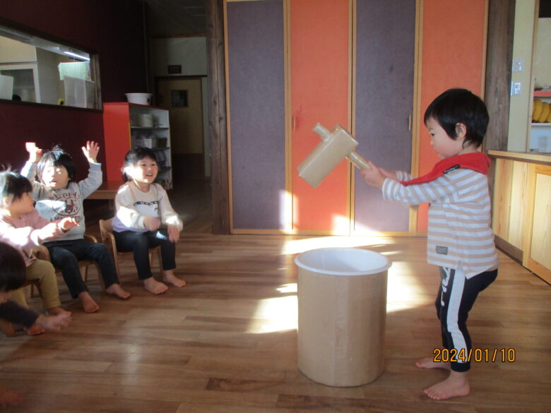 どんぐり組さんは、保育士と杵を持ち「よいしょ」「よいしょ」と餅つきをしました。みんな上手についていますね。くり組くるみ組さんは一人で杵を持ってついてました。元気な掛け声も聞こえましたよ。