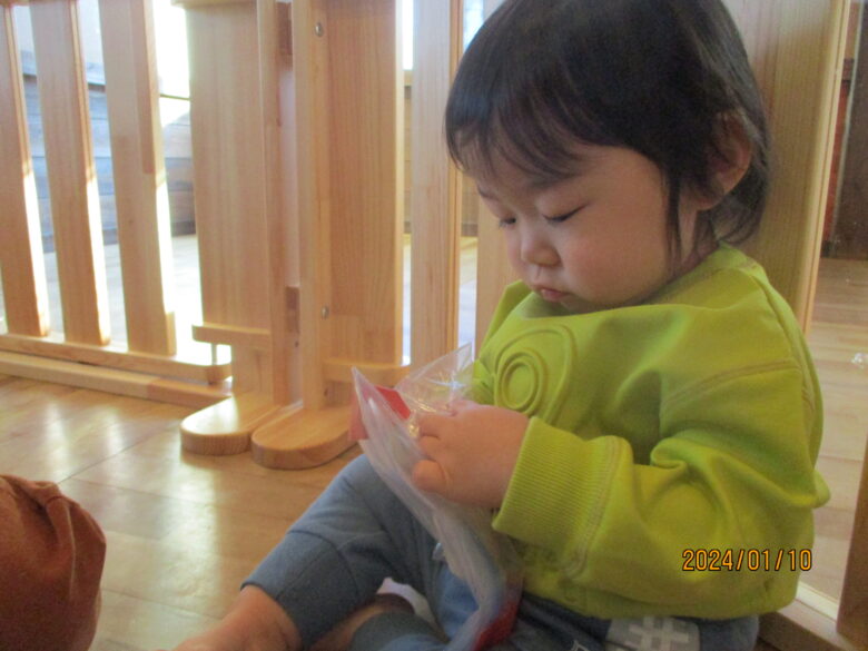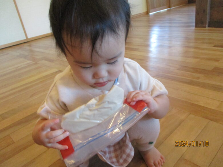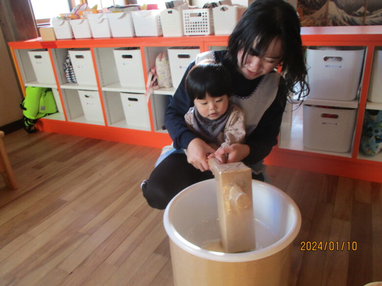 今日は正月あそびで、お餅つきをしました。お餅はまだ食べられないので小麦粉粘土をお餅のかわりにしました。臼と杵を出すと興味津々の子ども達。