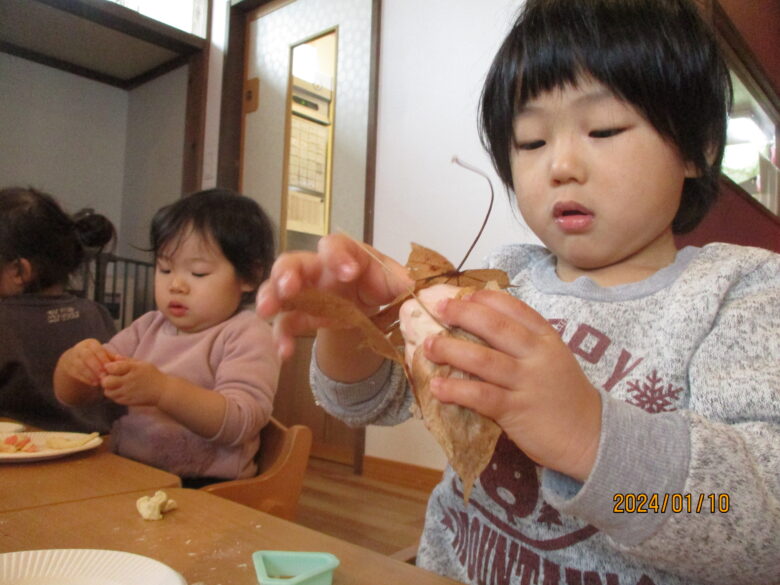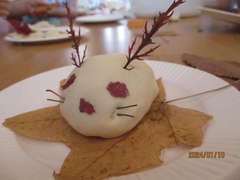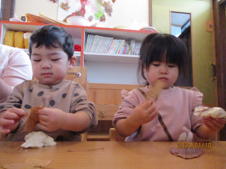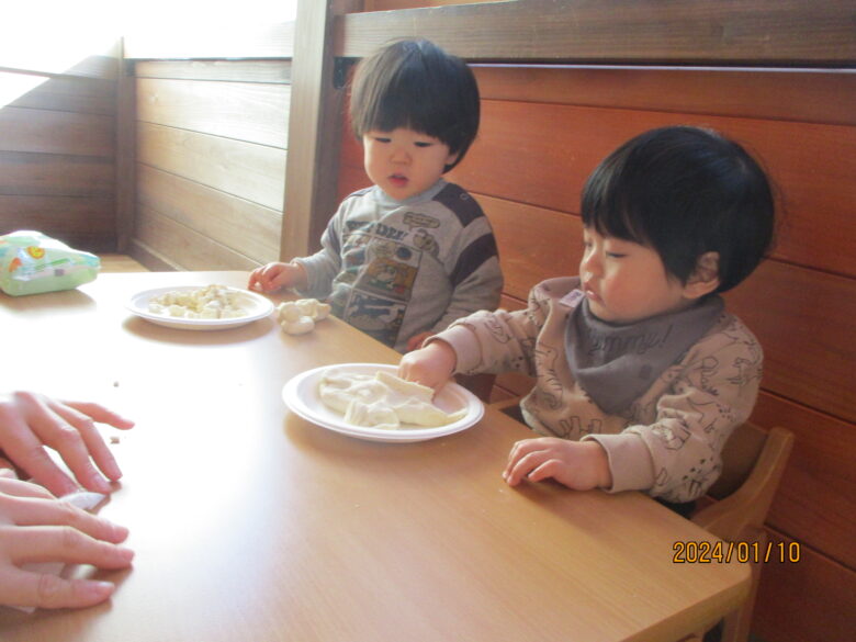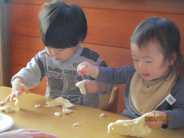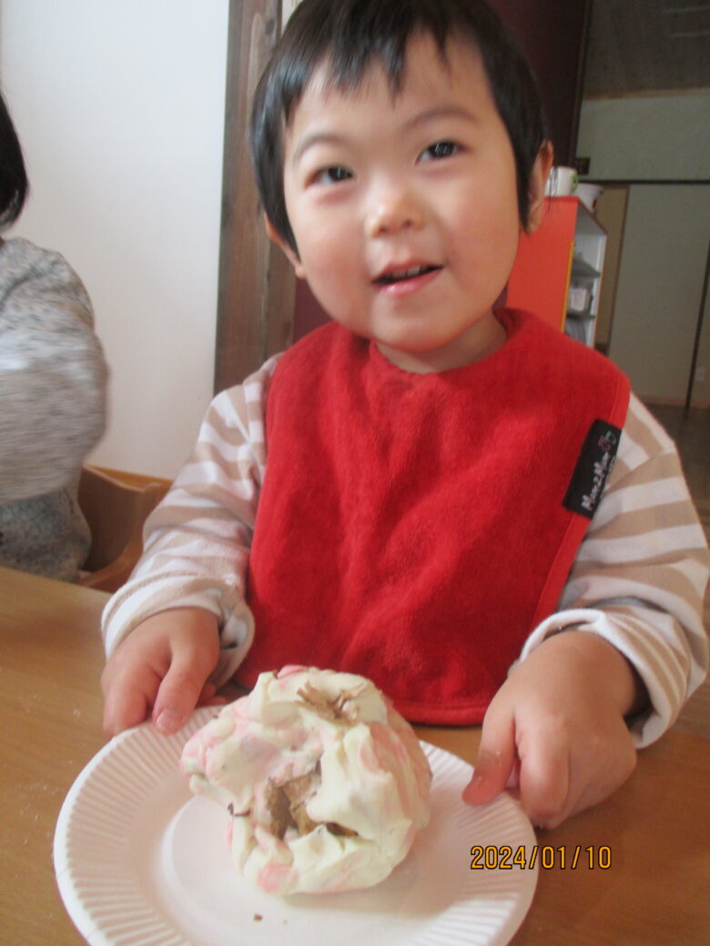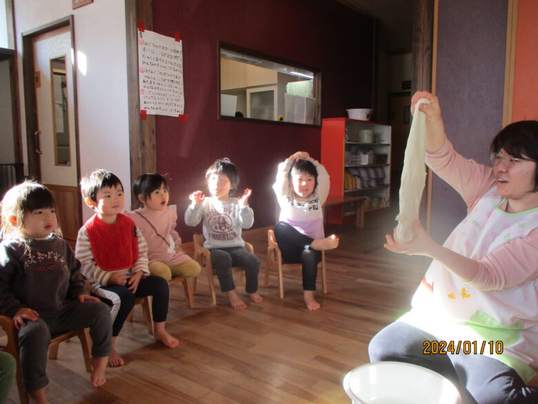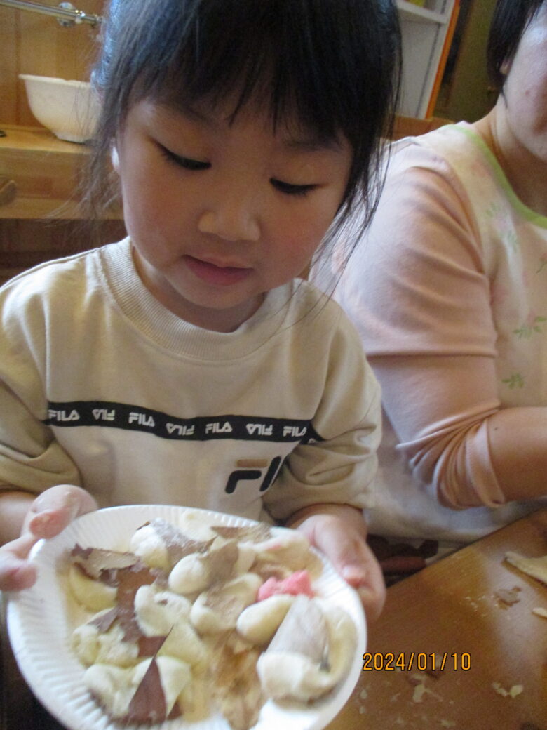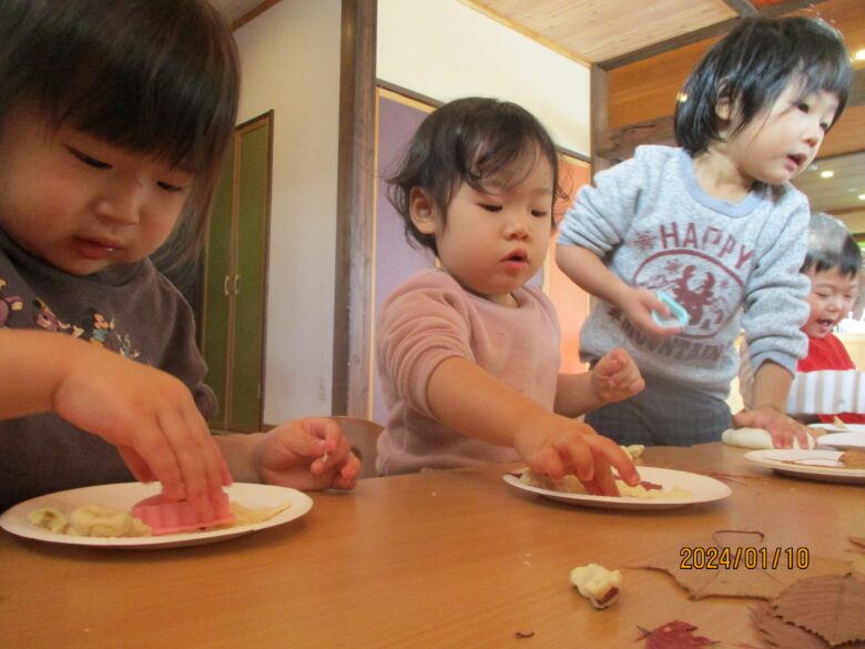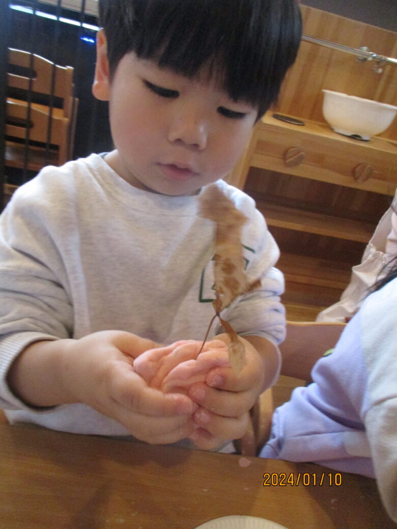 出来上がったお餅が伸びるのを見て「すごーい」と喜んでいました。お餅をみんなでちぎったり丸めて様々な形のお餅を作りました。白いお餅の他にも食紅で色をつけてイチゴ餅に。葉っぱを混ぜたり巻いたりも。美味しそうなおもちが出来ました。