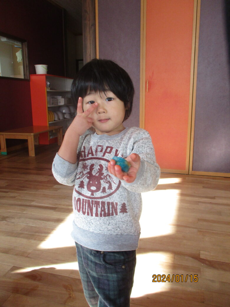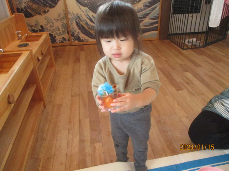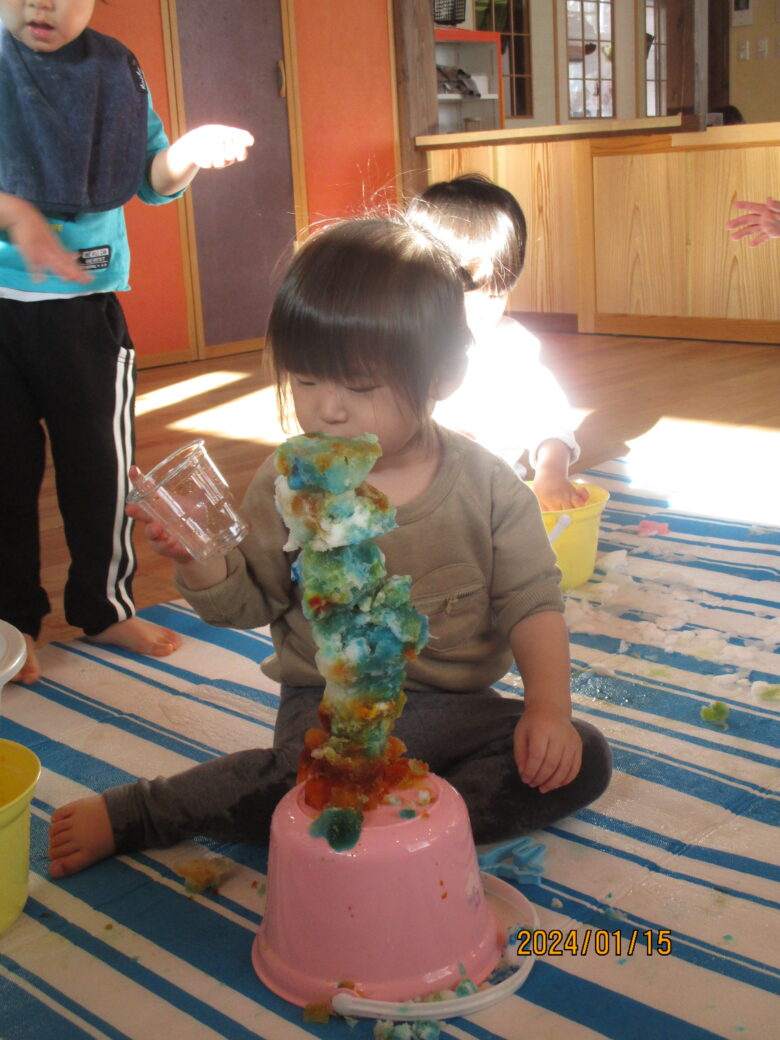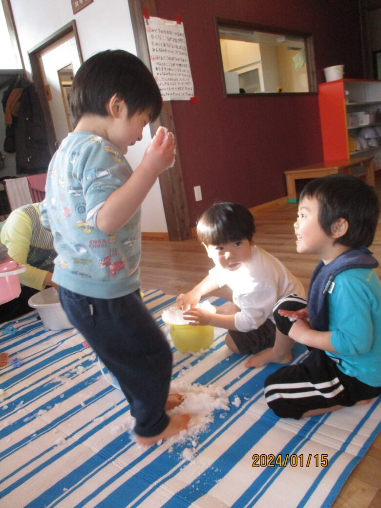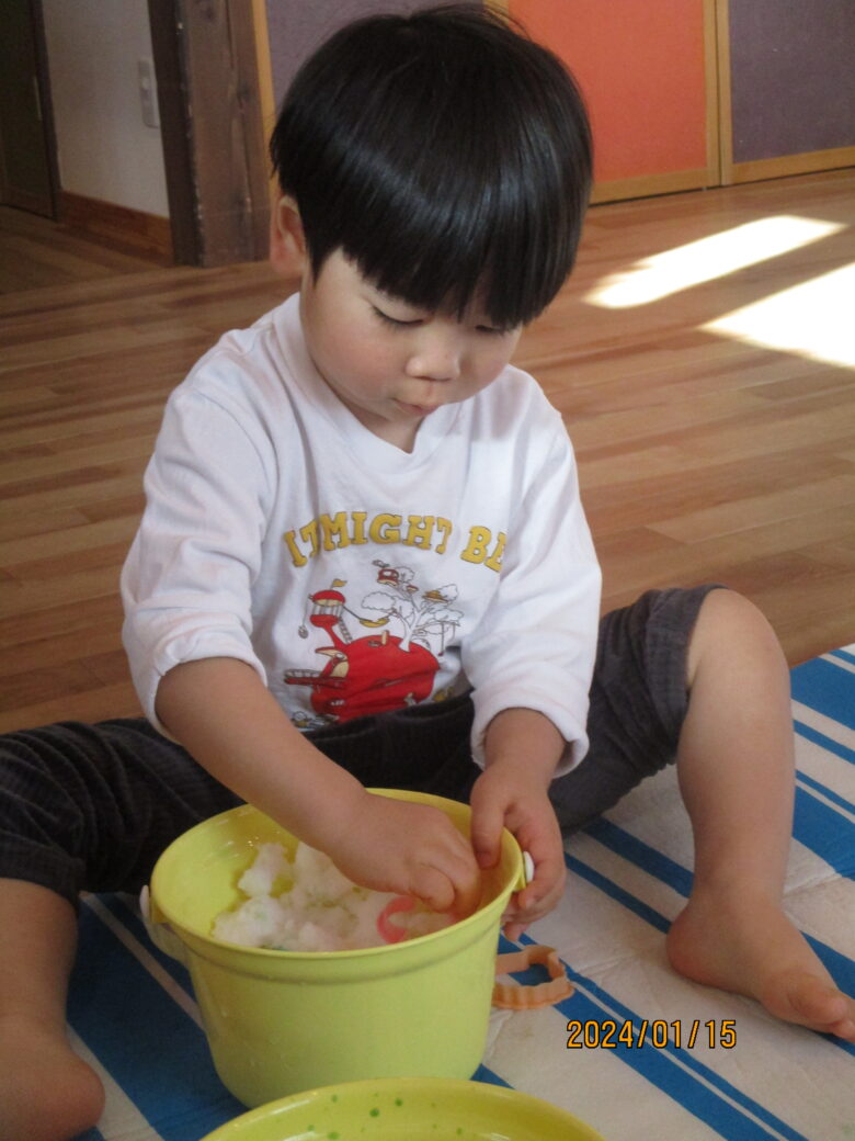 藤野園 くり組くるみ組 雪遊の冷たさが気持ちいいね♪ 2024.01.15 藤野園 今日は雪遊びをしました。足で雪の感触を楽しんでいます。「冷たーい」と楽しそうです。 食紅で色を付けて様々な形にして綺麗です。作った作品を見せてくれたりもしました。 前へ次へ一覧へ戻る