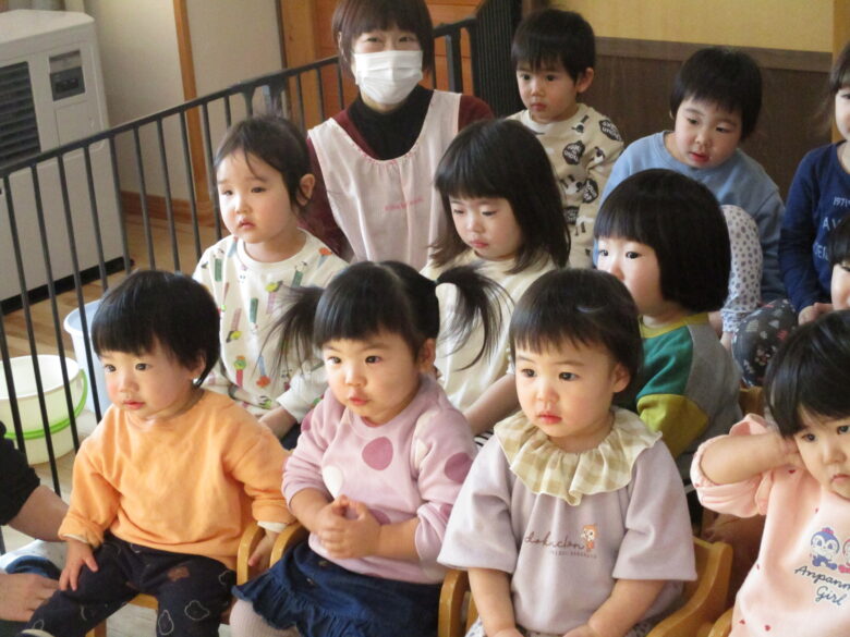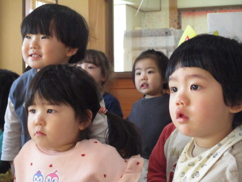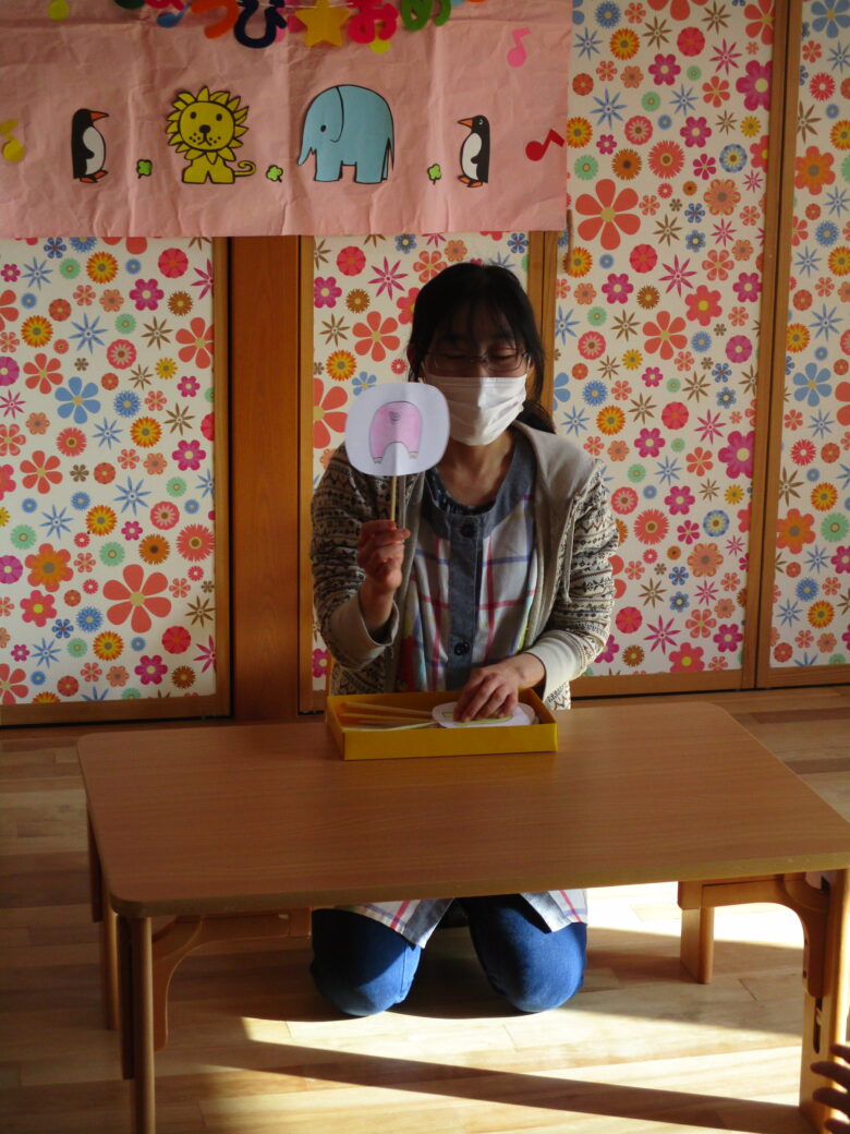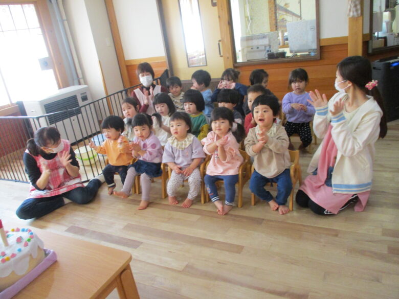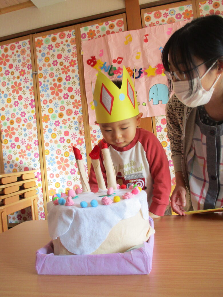 今日は、1月生まれさんのお誕生日会を行いました。 今回の主役は、2歳児のお友達! インタビューでも自分の歳が言えたり、ロウソクを上手にふーっとしたり、 ちょっぴり照れながらも、素敵なお兄さん姿が見られて感動でした! 恒例の保育士からのお楽しみは、ペープサート「どうぶつ だれかな?」を見ました。 動物さんのおしりとしっぽを見て、何の動物かをみんなで考え、当てるクイズだったので 「ブタさん!」「ゾウさん!」「パンダさん」などなど・・・全力で答える子ども達でした。