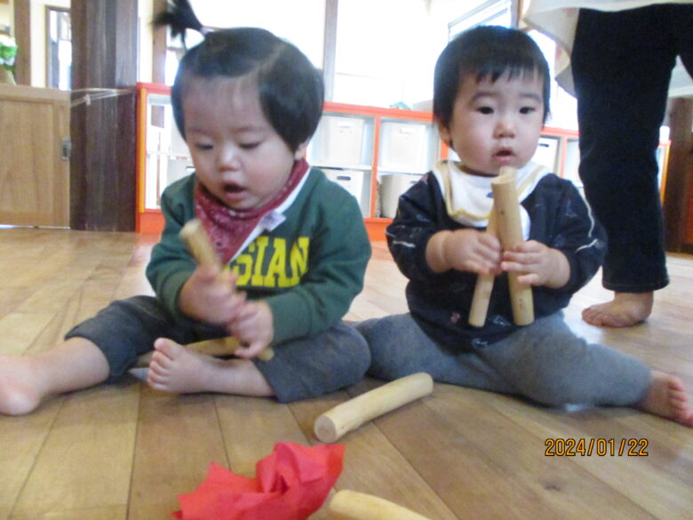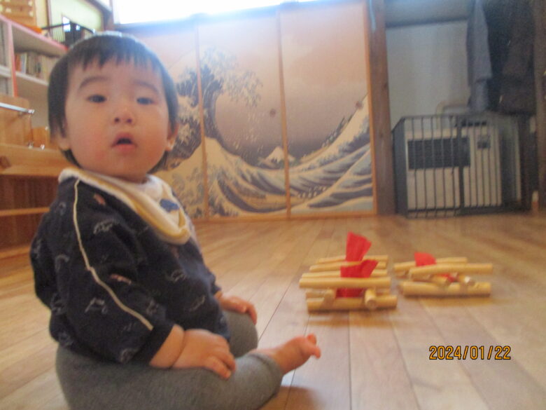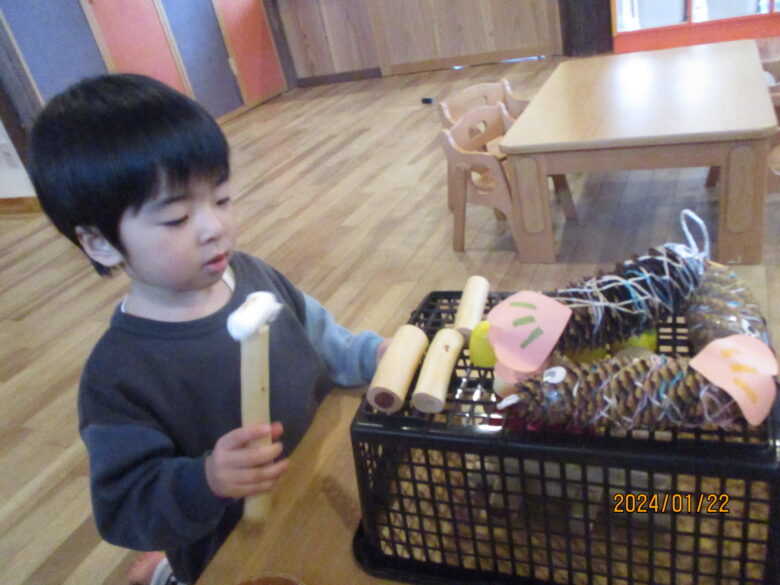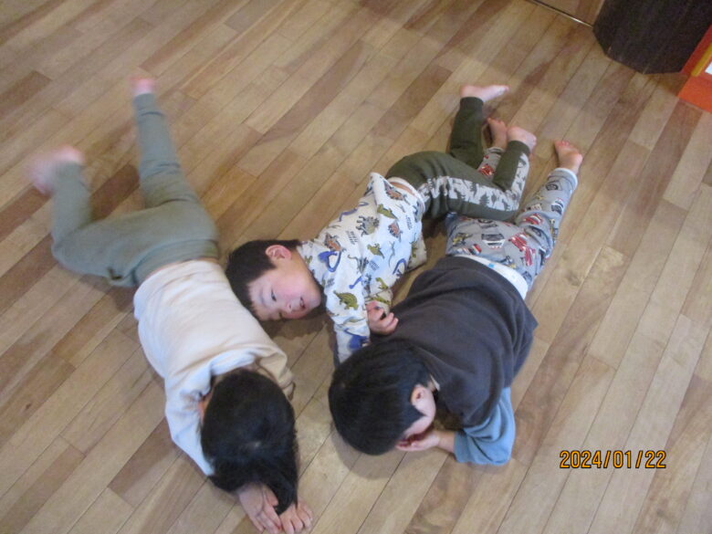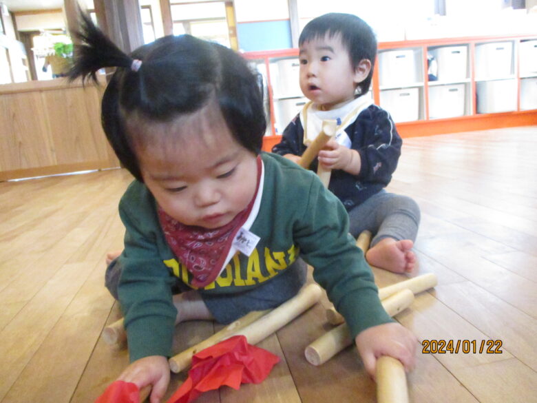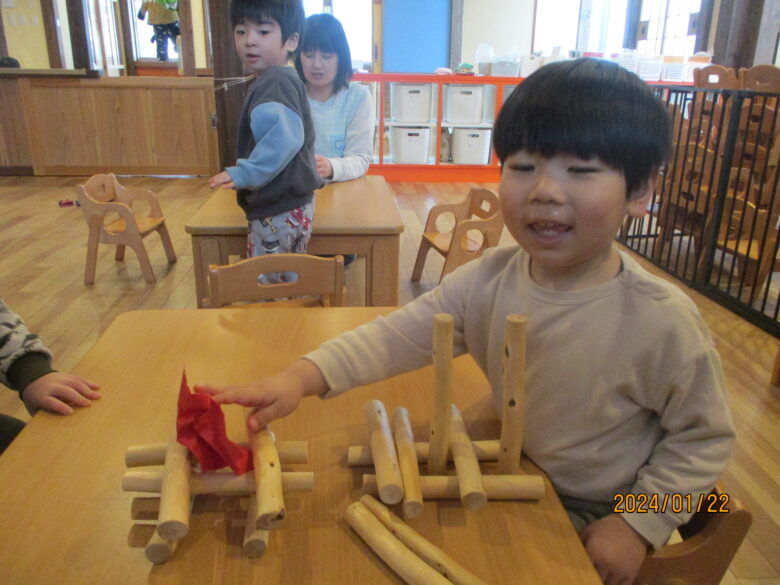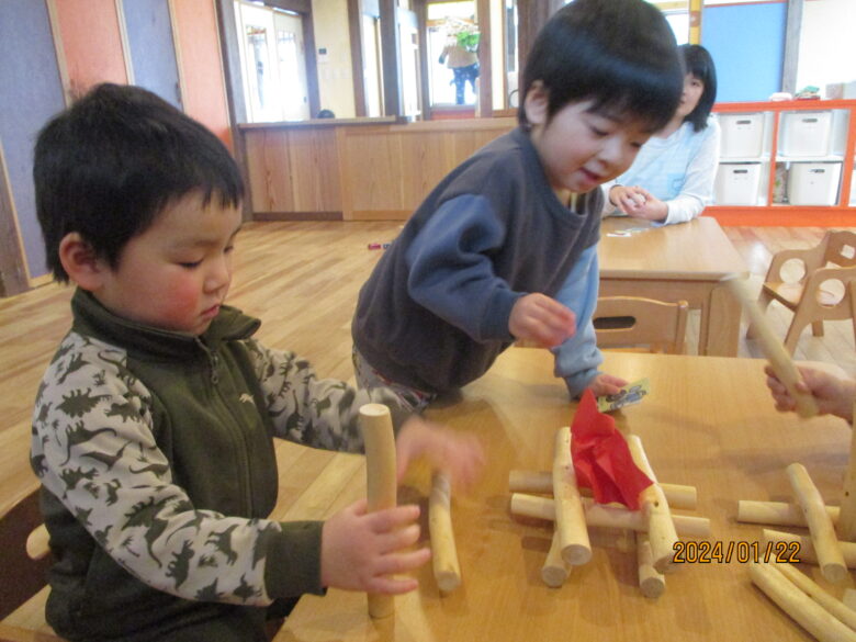 今日は、焚火ごっこをしました。触ったら不思議と暖かい気がします。