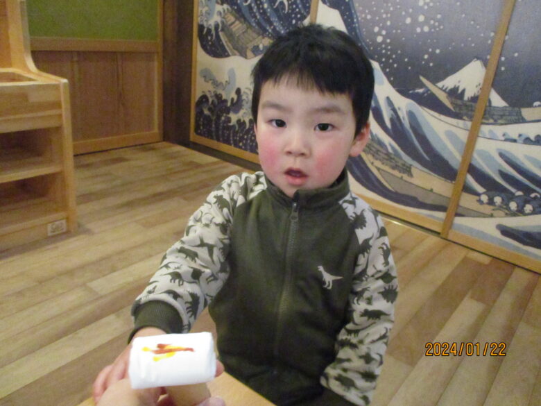 本格的に焼けるように、焦げ目を付け足してみました。“パクパク”と食べる真似をしています。